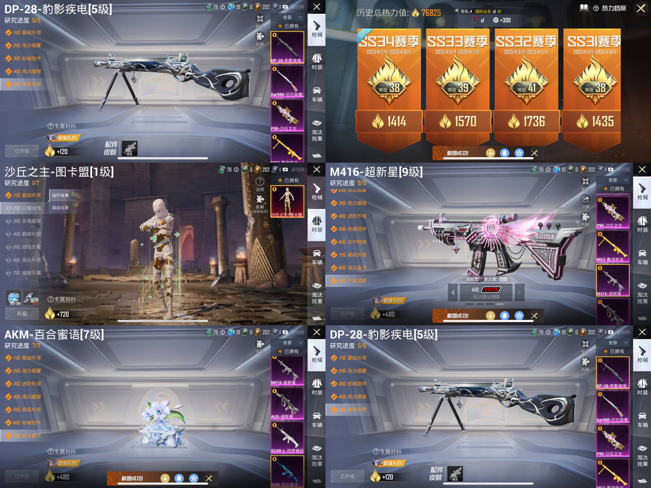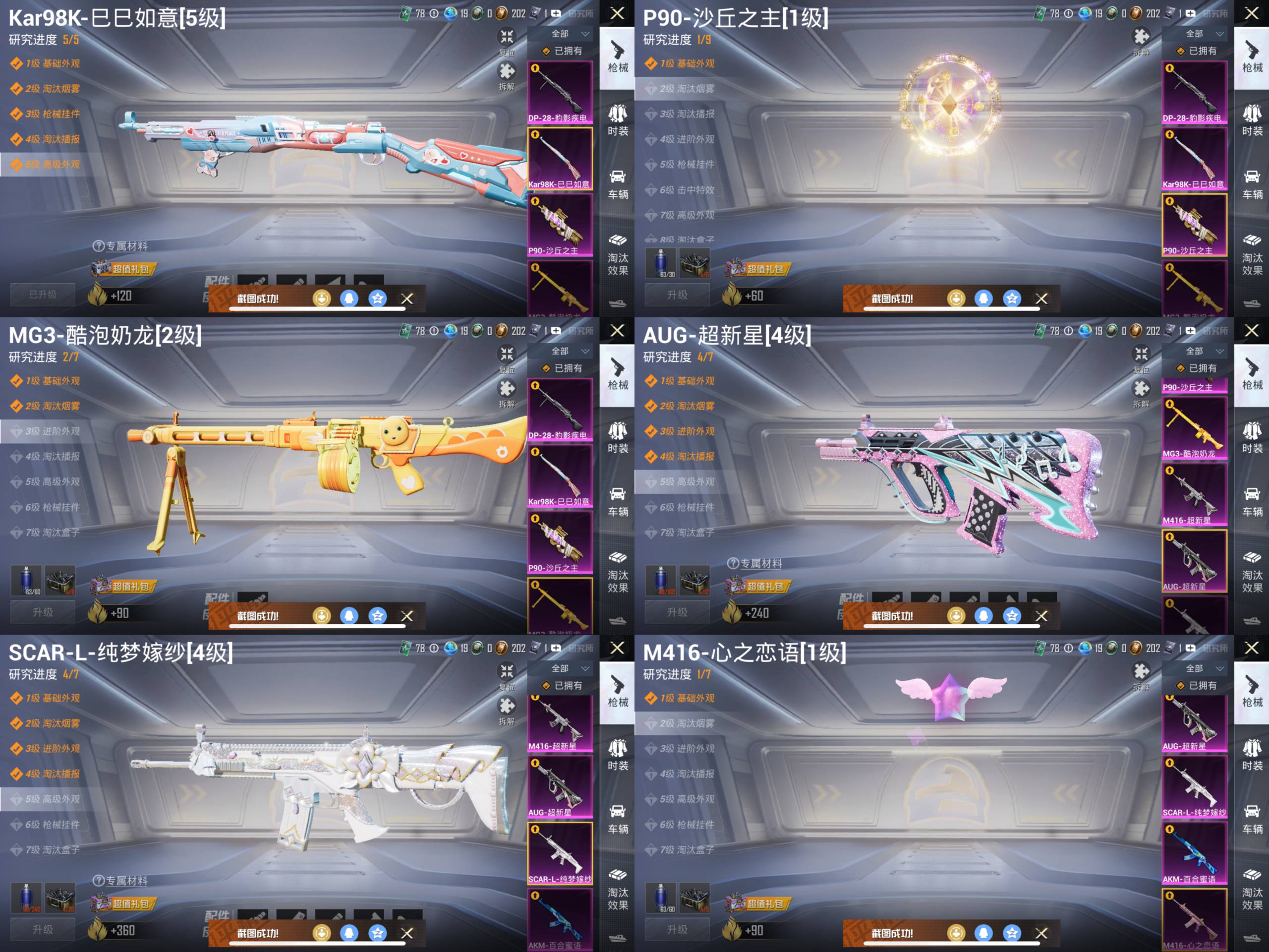 M416-心之恋语,SCAR-L-纯梦嫁纱,M416-超新星,AUG-超新星,MG3-酷泡奶龙,P90-沙丘之主,Kar98K-巳巳如意