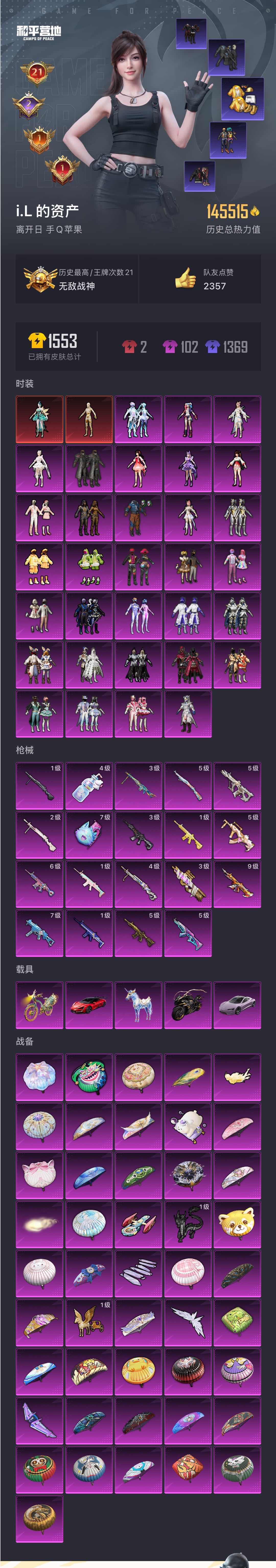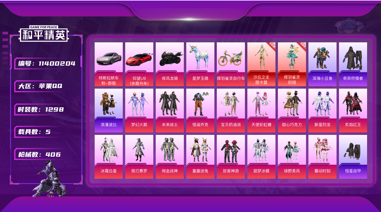 [11400204]WBDS0067 苹果Q 历史无敌战神 335套装 406枪皮 2神装32粉装19特效枪5载具 辉羽雀灵-初翊 (1级) 沙丘之主-图卡盟 (2级) M416-至情至圣 (9级) 仰望U9(赤霞丹朱) 特斯拉R沁心粉 疾风龙骑 星梦玉骢 辉羽雀灵自行车 奇异狩猎者 赤蝎幽灵 都市猎人 浪漫天命 派对舞王 派对舞王(金靴子) 狂魅哈莉 圣堂之誓 梦幻火箭 严莉莉 憨憨奶龙 宝贝奶油派 天使彩虹糖 甜心巧克力 千金淑猫 月影灵韵 怪诞乔克 小可学妹 幻彩电音 放客神游 未来战士 歌者泠鸢 第五大道 新星烈龙 繁龙极客 绚金战神 童趣迷兔 冰霜白皇 炙焰红王 银刃赛罗 甜梦冰蝶 绿野柔风 馨动时刻 恐龙拽拽 葫芦兄弟 骨龙祭渊 银龙傲海 暗夜玫瑰 M416-五爪金龙 (5级) SCAR-L-锦绣绵绵 (1级) M416-墨龙九天 (3级) P90-沙丘之主 (3级) UMP45-雪国精灵 (7级) Kar98K-巳巳如意 (5级) MG3-辉羽雀灵 (3级) DP-28-千金淑猫 (2级) DP-28-豹影疾电 (1级) AUG-许七安 (5级) SCAR-L-童趣迷兔 (6级) DP-28-圣堂之誓 (4级) M416-暖熊萌萌 (1级)AKM-梦之光华 (5级) GROZA-焦糖拿铁 (5级) SCAR-L-青春物语 (1级) 破片手榴弹-粉粉猫爪 (7级) 烟雾弹-甜梦果泡 (4级) 龙翔九天飞行器 梦幻火箭飞行器 齐天大圣飞行器 镜光幻境飞行翼 龟仙人 2P战斗服款 雪山精英 东方飞龙 潮萌小黄鸭 呆萌铁蟹 鹰眼刺客 软萌银虎 深海小丑鱼 浪漫波比 金羽特工 胖达团团 AG追光队服 AG战队服 ST战队服 诡面顽熊 暗影哥特 SS1特训 团圆交子 瑞龙福将 豚鼠丹丹 忍者信条 狂沙舞者 漫步者 青龙圣者 机械英豪 黑色刀锋 弄潮海豚 M762-奇异狩猎者 M762-瑞龙福将 M24-奇异狩猎者 S686-奇异狩猎者 AUG-魔法学院 梦幻火箭头盔 折纸暴龙头盔 金曜白虎头盔 甜心宝贝头盔 金风玉露头盔 折纸暴龙背包 金曜白虎背包 甜心宝贝背包 缤纷油彩背包 萌熊伴侣背包 深海小丑鱼背包 古堡领主背包 金羽特工背包