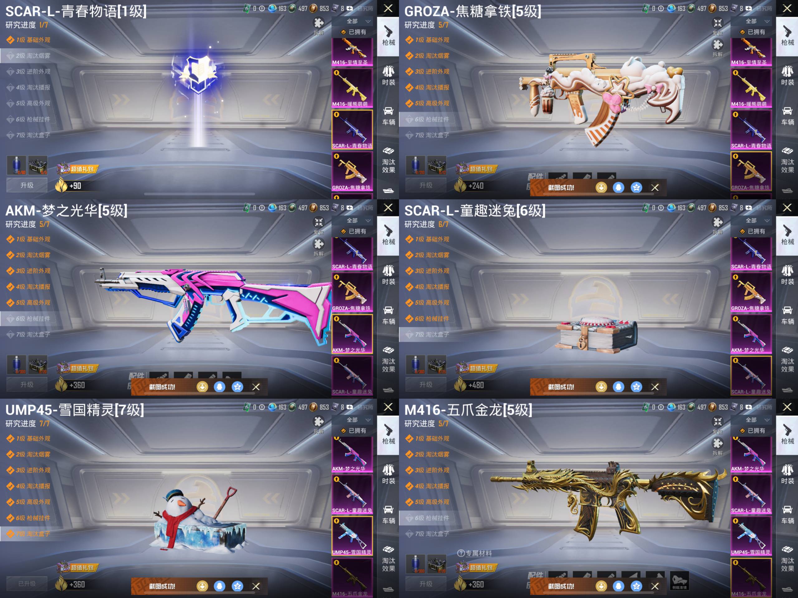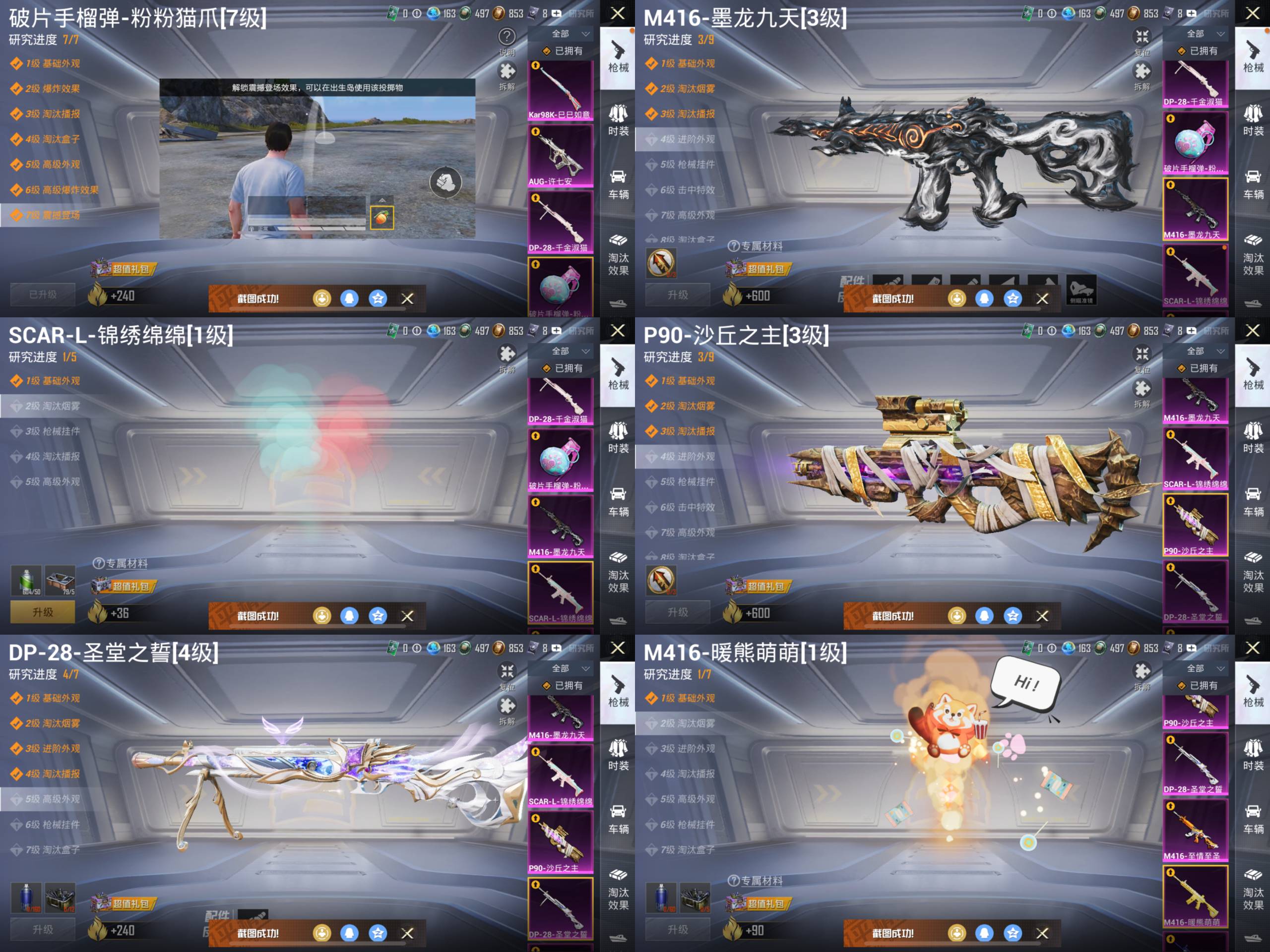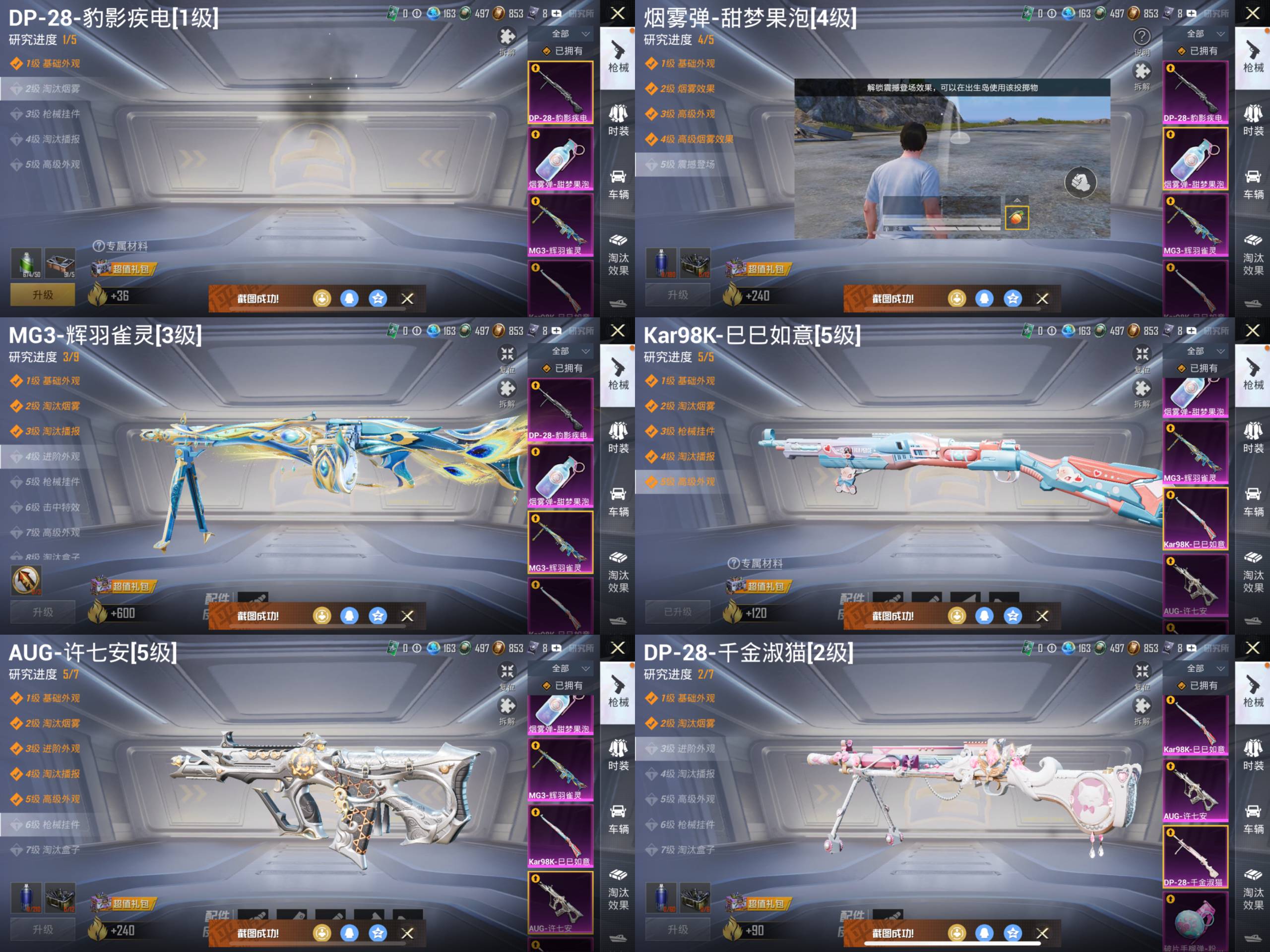 M416-五爪金龙,AKM-梦之光华,SCAR-L-童趣迷兔,UMP45-雪国精灵,GROZA-焦糖拿铁,SCAR-L-青春物语,M416-暖熊萌萌,M416-至情至圣,DP-28-圣堂之誓,P90-沙丘之主,SCAR-L-锦绣绵绵,M416-墨龙九天,破片手榴弹-粉粉猫爪,DP-28-千金淑猫,AUG-许七安,Kar98K-巳巳如意