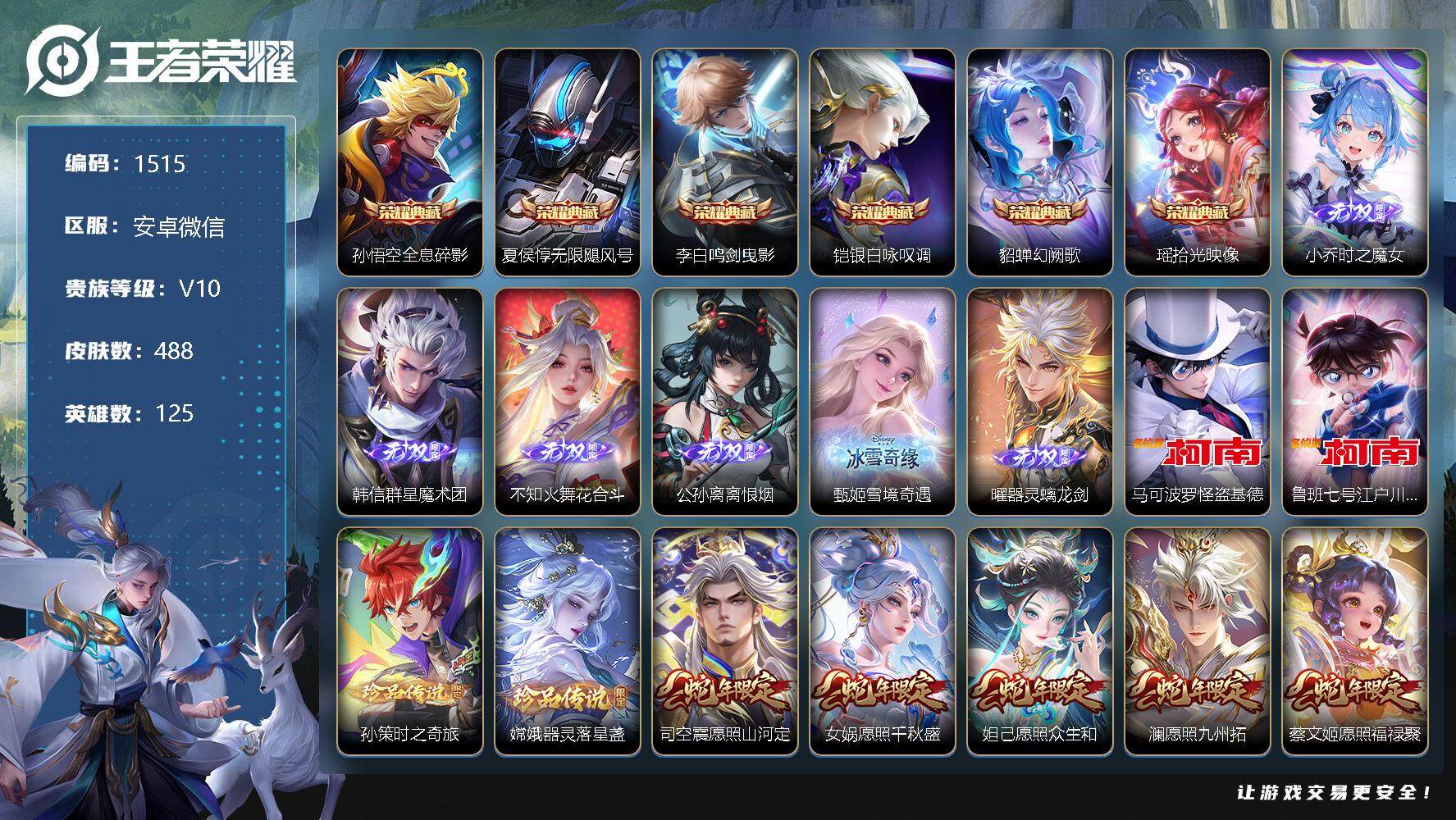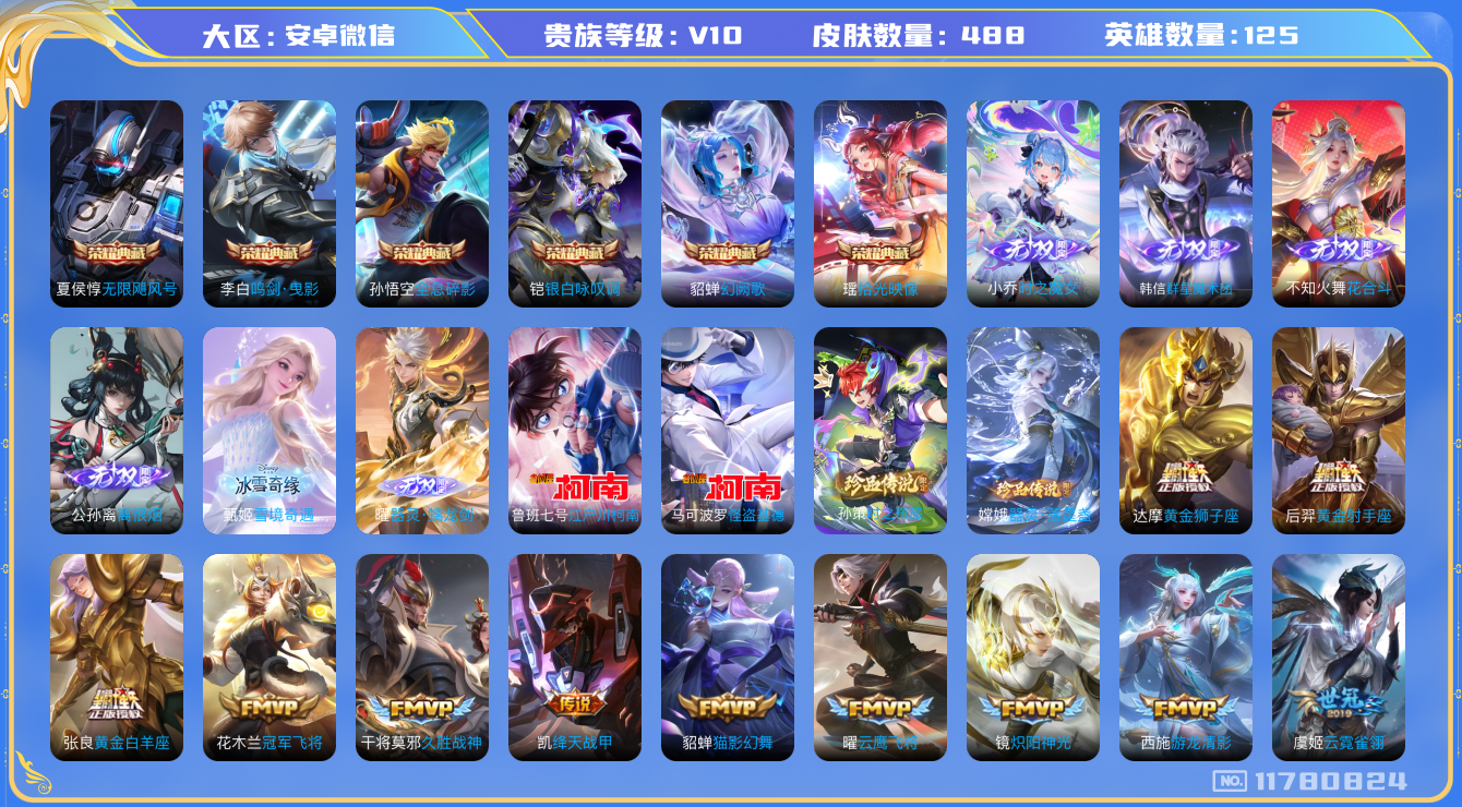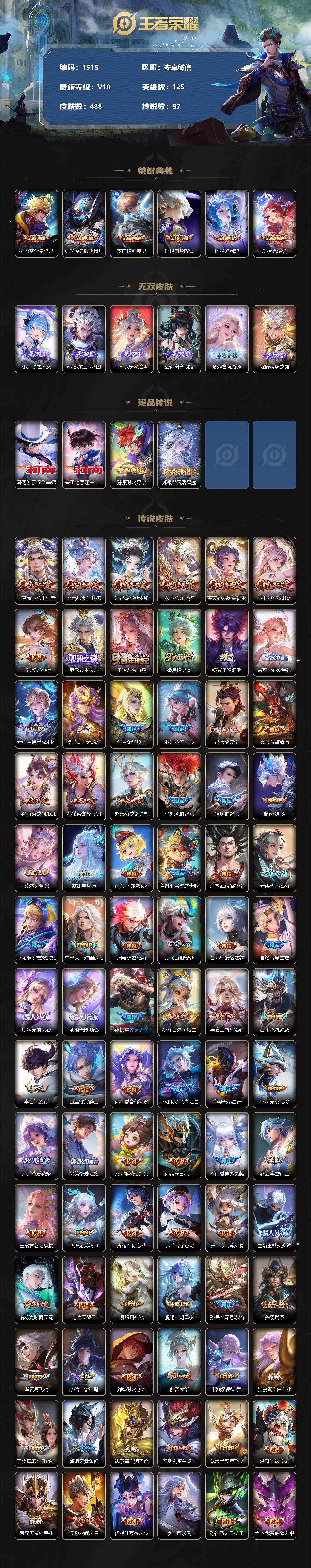 [11780824]【商品标题】:安卓WX-V10-最强王者段位-125英雄-488皮肤-6典藏-0珍品无双-6无双-4珍品传说-87传说-159史诗