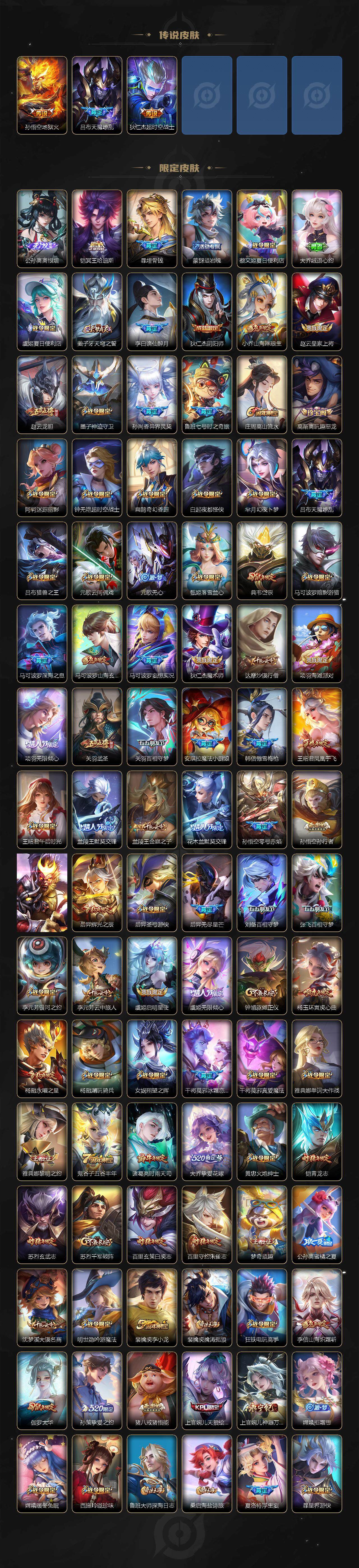 【传说皮肤】:司空震愿照山河定,女娲愿照千秋盛,妲己愿照众生和,澜愿照九州拓,蔡文姬愿照福禄聚,虞姬愿照岁时盈,云缨幻光神枪,嬴政玄雷天君,王昭君映山客,桑启鸣野蒿,铠冥王哈迪斯,朵莉亚心动手记,云中君群星魔术团,墨子黄金天蝎座,海月金乌负日,亚连落雪白狼,吕布曦玄引,典韦战鼓燎原,孙尚香乘龙问璇玑,孙策乘龙淬吴钩,赵云乘龙铭钟鼎,马超琥珀纪元,铠琥珀纪元,澜逐花归海,艾琳觅芳踪,露娜霜月吟,孙膑小动物乐团,鲁班七号时之奇旅,宫本武藏惊梅引,云缨鹤归松栖,马可波罗妄想实况,东皇太一灼幽烈阳,澜电玩雷克斯,张飞百相守梦,公孙离记忆之芯,夏洛特浮生妄,虞姬无限倾心,项羽无限倾心,孙悟空齐天大圣,小乔山海琳琅生,李信山海炽霜斩,吕布怒海麟威,李白诗剑行,百里守约碎云,孙尚香音你闪耀,马可波罗深海之息,后羿无尽星芒,马超无双飞将,大乔挚爱花嫁,孙策挚爱之约,蔡文姬花朝如约,孙策末日机甲,孙尚香异界灵契,赵云淬星耀世,王昭君乞巧织情,西施游龙清影,周瑜音你心动,小乔音你心动,李元芳飞鸢探春,兰陵王默契交锋,诸葛亮时雨天司,铠绛天战甲,镜炽阳神光,虞姬启明星使,孙悟空零号赤焰,关羽武圣,曜云鹰飞将,李信一念神魔,刘备时之恋人,伽罗太华,貂蝉猫影幻舞,张良黄金白羊座,干将莫邪久胜战神,虞姬云霓雀翎,达摩黄金狮子座,百里玄策白虎志,花木兰冠军飞将,梦奇胖达荣荣,后羿黄金射手座,杨戬永曜之星,貂蝉仲夏夜之梦,李白凤求凰,孙尚香末日机甲,宫本武藏地狱之眼,孙悟空地狱火,吕布天魔缭乱,狄仁杰超时空战士