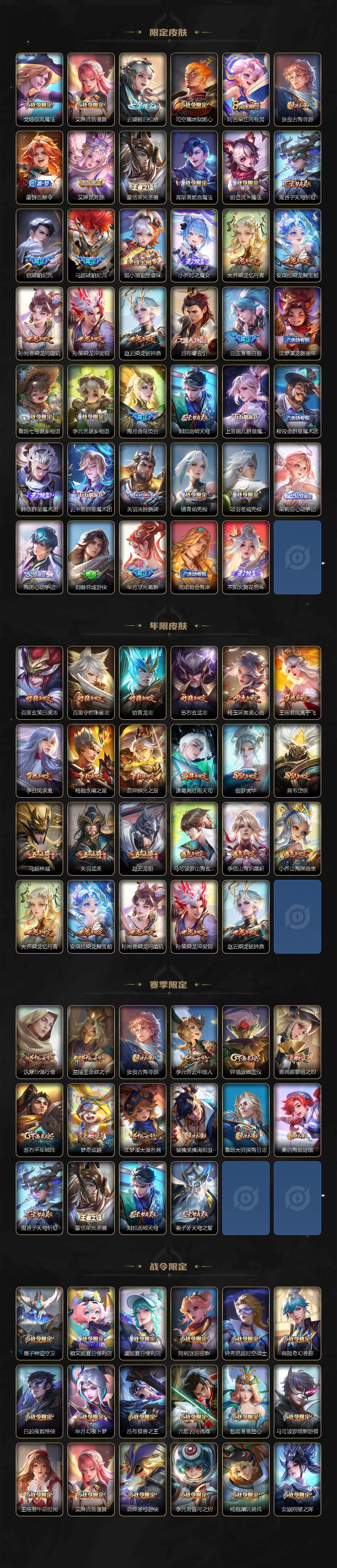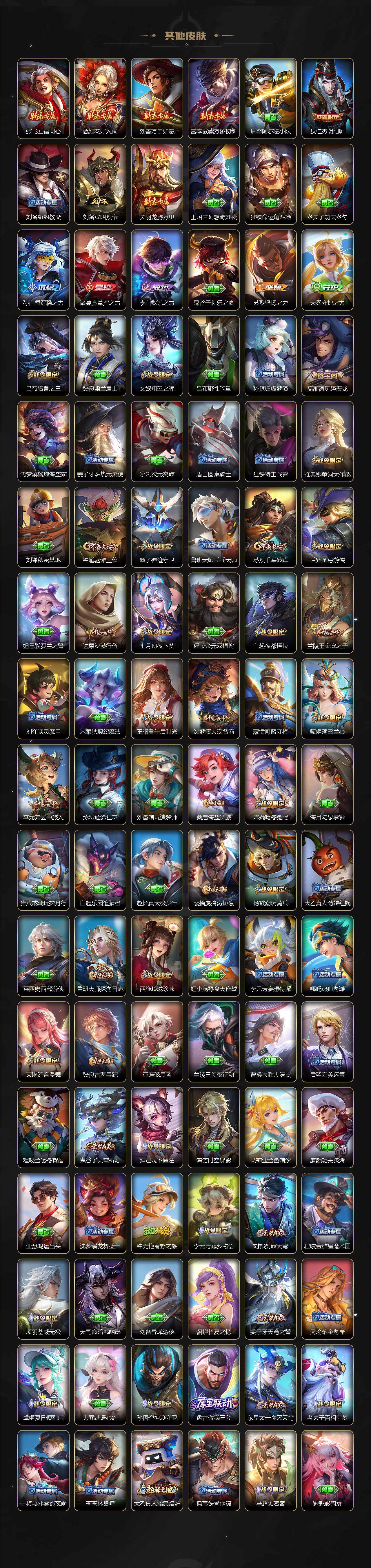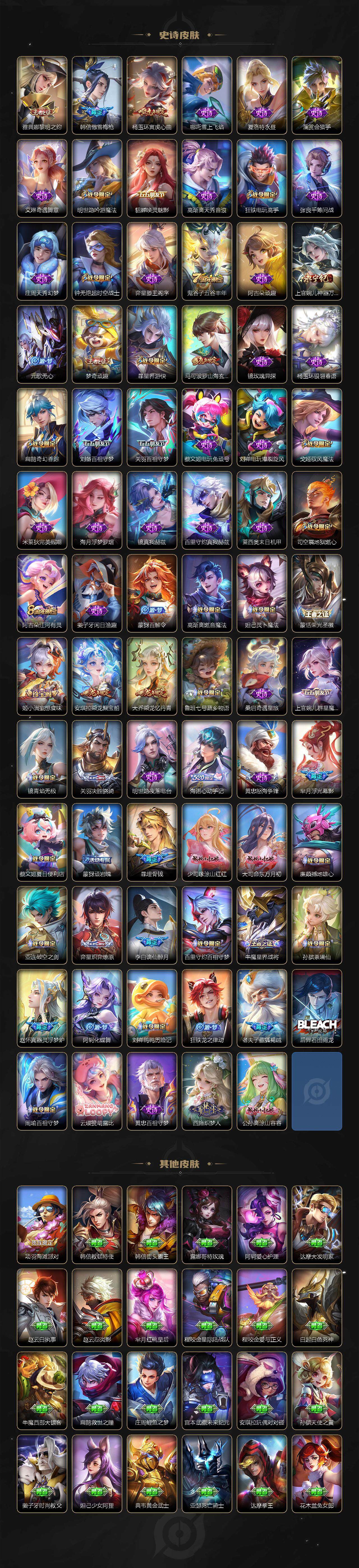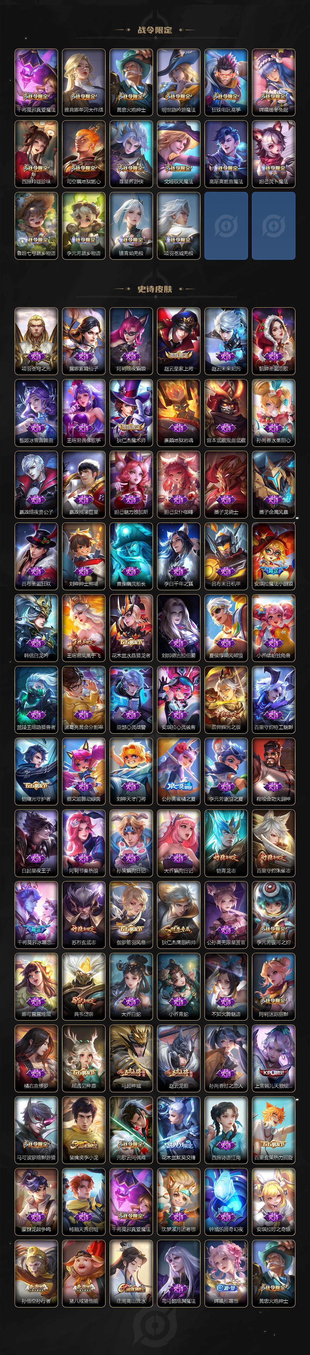 裴擒虎李小龙,诸葛亮时雨天司,赵云龙胆,关羽武圣,马超神威,后羿辉光之辰,典韦岱宗,伽罗太华,上官婉儿天狼绘梦者,铠青龙志,百里玄策白虎志,苏烈玄武志,百里守约朱雀志,王昭君凤凰于飞,花木兰默契交锋,兰陵王默契交锋,干将莫邪冰霜恋舞曲,公孙离蜜橘之夏,安琪拉魔法小厨娘,猪八戒猪悟能,孙尚香异界灵契,孙悟空孙行者,韩信傲雪梅枪,杨玉环寅虎·心曲,后羿无尽星芒,马可波罗深海之息,上官婉儿神器·万象笔,李白诗剑行,马可波罗山海·玄木吟,桑启鸣野蒿,王昭君映山客,澜愿照·九州拓,蔡文姬愿照·福禄聚,虞姬愿照·岁时盈,司空震愿照·山河定,妲己愿照·众生和,女娲愿照·千秋盛