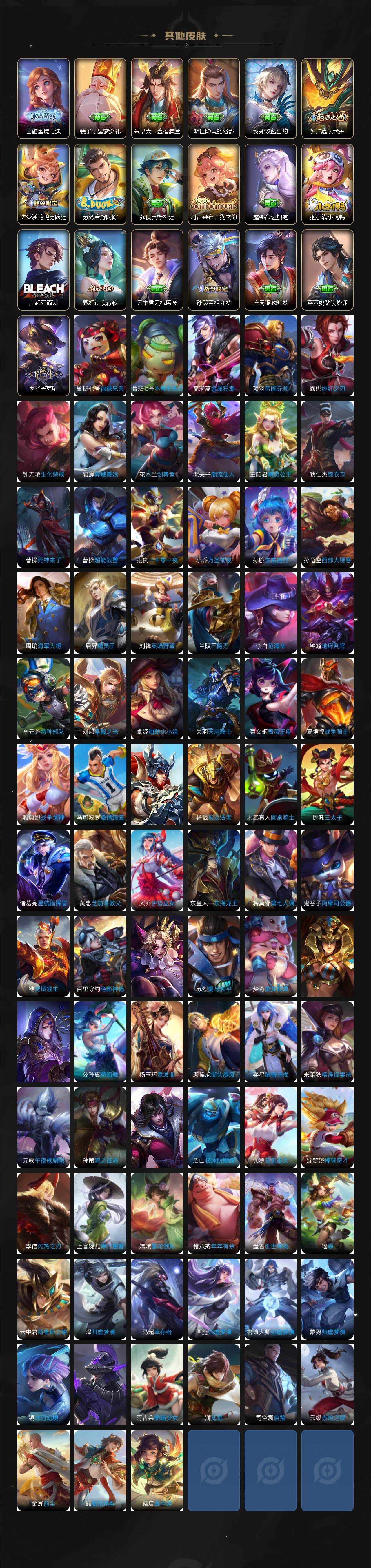 小乔青蛇,大乔白蛇,瑶遇见神鹿,娜可露露晚萤,伽罗箭羽风息,李元芳逐浪之夏,不知火舞魅语,公孙离无限星赏官,大乔猫狗日记,孙策猫狗日记,阿轲节奏热浪,露娜紫霞仙子,诸葛亮黄金分割率,王昭君偶像歌手,韩信白龙吟,项羽苍穹之光,孙尚香时之恋人,阿轲暗夜猫娘,吕布末日机甲,蒙犽龙鼓争鸣,橘右京修罗,墨子龙骑士,嬴政摇滚巨星,刘禅绅士熊喵,刘禅天才门将,白起星夜王子,安琪拉心灵骇客,安琪拉时之奇旅,程咬金功夫厨神,刘邦德古拉伯爵,兰陵王暗隐猎兽者,曹操幽灵船长,宫本武藏鬼剑武藏,司马懿暗渊魔法,亚瑟心灵战警,钟馗乐园奇幻夜,杨戬天秀·启明,蔡文姬舞动绿茵,廉颇地狱岩魂,西施诗语江南,小乔缤纷独角兽,夏侯惇乘风破浪,花木兰水晶猎龙者,铠曙光守护者,百里玄策热力回旋,墨子金属风暴,吕布圣诞狂欢,貂蝉圣诞恋歌,百里守约特工魅影,嬴政暗夜贵公子,嫦娥拒霜思,雅典娜黎明之约,李白千年之狐,哪吒雪上飞焰,夏洛特永昼,澜赏金猎手,艾琳奇遇舞章,貂蝉唤灵魅影,高渐离天秀·音浪,张良千筹问战,庄周天秀·幻梦,弈星滕王阁序,阿古朵顽趣,镜玫瑰异探,杨玉环银翎春语,刘备百相守梦,关羽百相守梦,蔡文姬电玩·兔顽号,刘禅电玩·爆裂旋风,海月浮梦罗烟,镜真我赫兹,百里守约真我赫兹,莱西奥末日机甲,姜子牙闲日渔趣,蒙犽百解令,高渐离燃音魔法,大乔乘龙·忆丹青,安琪拉乘龙·聚宝船,桑启奇遇星旅,上官婉儿群星魔术团,关羽决胜骁骑,明世隐夜落电台,海诺心动手记,李白谪仙醉月,赵怀真器灵·浮梦炉