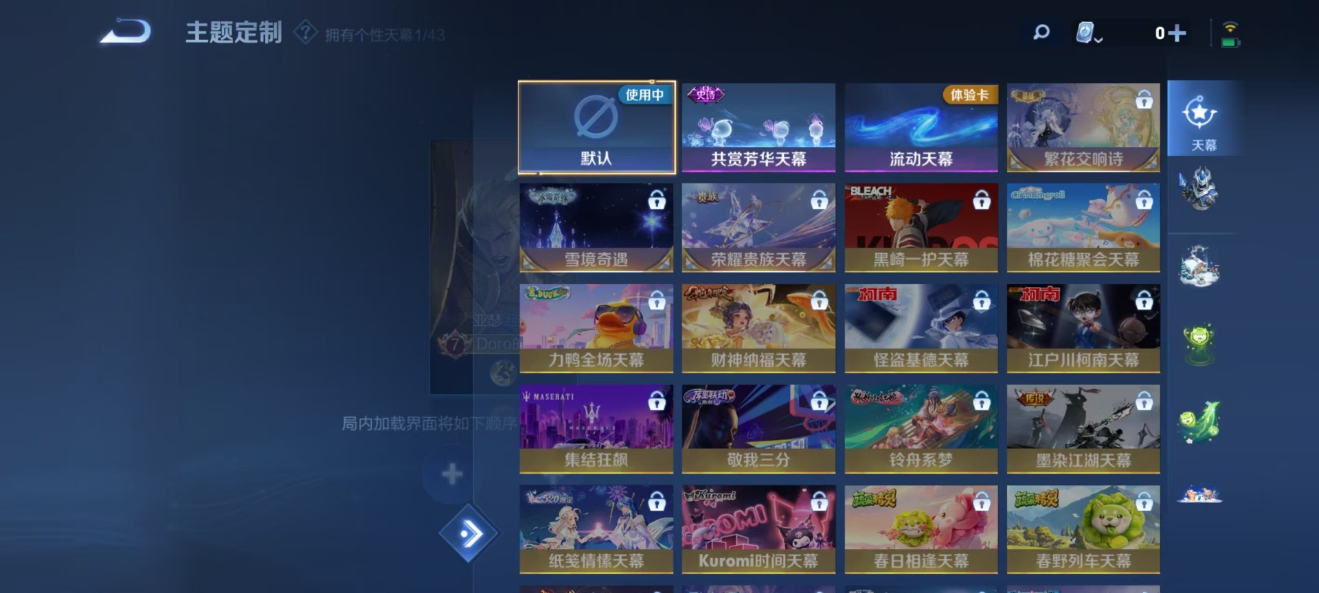 阿轲节奏热浪,曹操幽灵船长,伽罗琥珀纪元,小乔缤纷独角兽,孙策猫狗日记,不知火舞魅语,项羽苍穹之光,吕布圣诞狂欢,吕布末日机甲,诸葛亮黄金分割率,刘禅绅士熊喵,宫本武藏鬼剑武藏,公孙离无限星赏官,兰陵王暗隐猎兽者,貂蝉圣诞恋歌,李白谪仙醉月,花木兰水晶猎龙者,程咬金功夫厨神,百里玄策原初追逐者,雅典娜冰冠公主,雅典娜黎明之约,李元芳逐浪之夏,墨子金属风暴,娜可露露晚萤,王昭君偶像歌手,嫦娥拒霜思,橘右京修罗