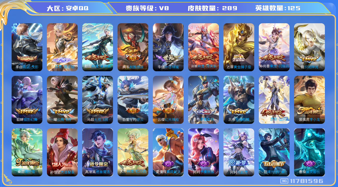 [11781596]V8 1典藏 1无双 16传说 125英雄 289皮肤 可修改实名 优质装备:鸣剑·曳影,器灵·螭龙剑,黄金狮子座,云鹰飞将(小将军),猫影幻舞,炽阳神光,一念神魔,无双飞将,碎云 传说皮:乘龙·问璇玑(孙尚香年限),乘龙·铭钟鼎(赵云年限),乘龙·淬吴钩(孙策年限),典韦战鼓燎原,幻光神枪 珍宝阁皮:妄想食味,万物之道 限定皮:愿照·山河定(司空震年限),逐霄战戟,鸣野蒿,怒海麟威,李小龙,大圣娶亲 史诗皮:鸭鸭历险记-刘禅,器灵·浮梦炉,绮世丹青,化蝶舞,灵蛊蚀心,星界战将,谪仙醉月,龙之律动,茶境仙,破空之剑,战舞者,东方月初,蒙犽顽岩魄,埋骨钱,芈月浮光幕影,蔬乡物语(鲁班七号),曹操夜都魔契,超元猎域,乘龙·聚宝船(安琪拉年限),乘龙·忆丹青(大乔年限),百相守梦-百里守约,紫霞仙子,特工魅影,千年之狐,江河有灵,百解令(蒙犽),高渐离燃音魔法,偶像歌手,末日机甲-吕布,猫狗日记-孙策,乱世虎臣,节奏热浪,修罗,女仆咖啡,摇滚巨星,水果甜心,绅士熊喵,星夜王子,功夫厨神,暗隐猎兽者,幽灵船长,鬼剑武藏,暗渊魔法,天秀·启明,舞动绿茵,地狱岩魂,诗语江南,纤云弄巧,拒霜思,缤纷独角兽,乘风破浪,逐浪之夏,水晶猎龙者,曙光守护者,箭羽风息,唤灵魅影,金属风暴,圣诞狂欢,鹰眼统帅,魅力维加斯,未来纪元-赵云1