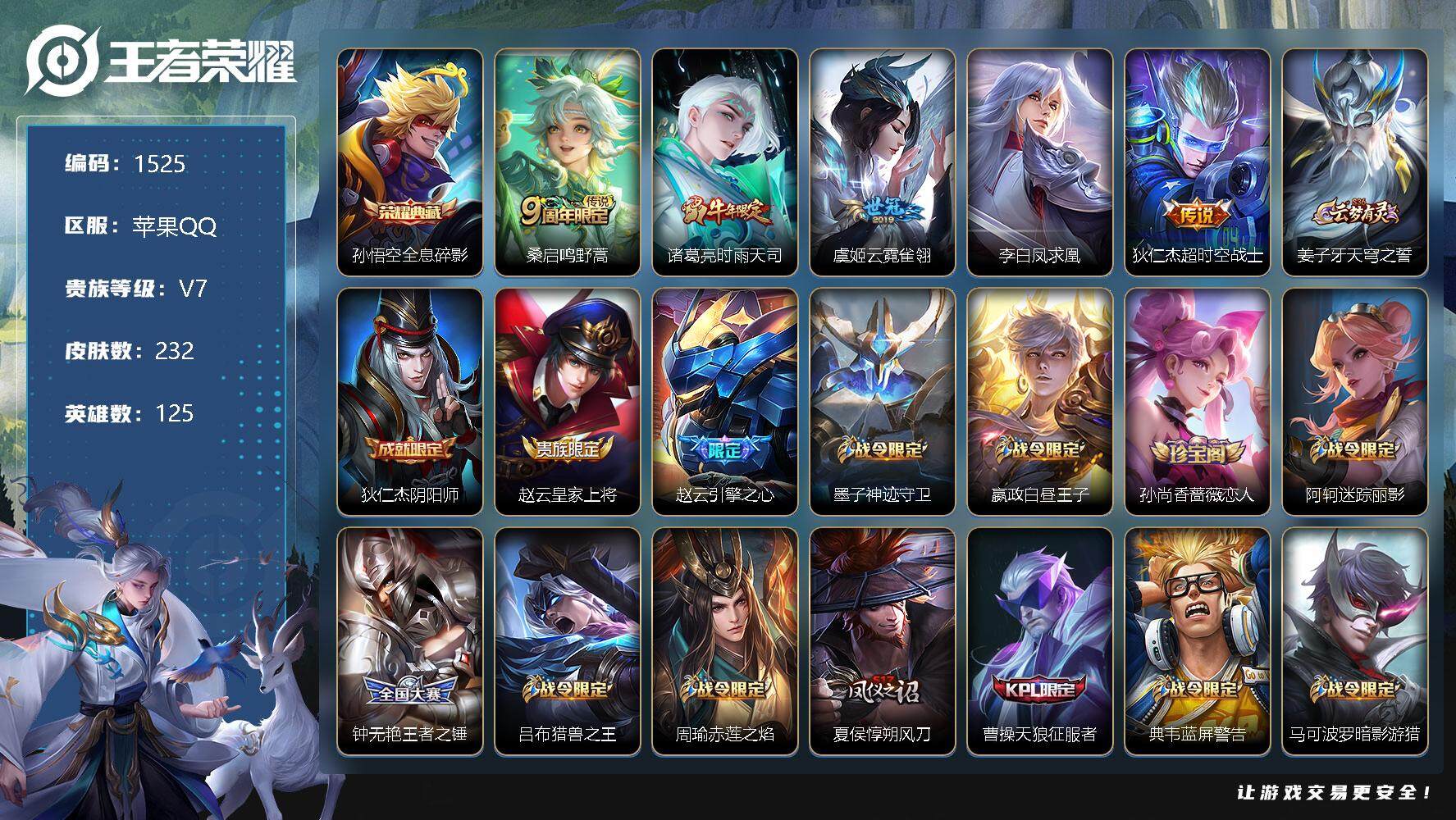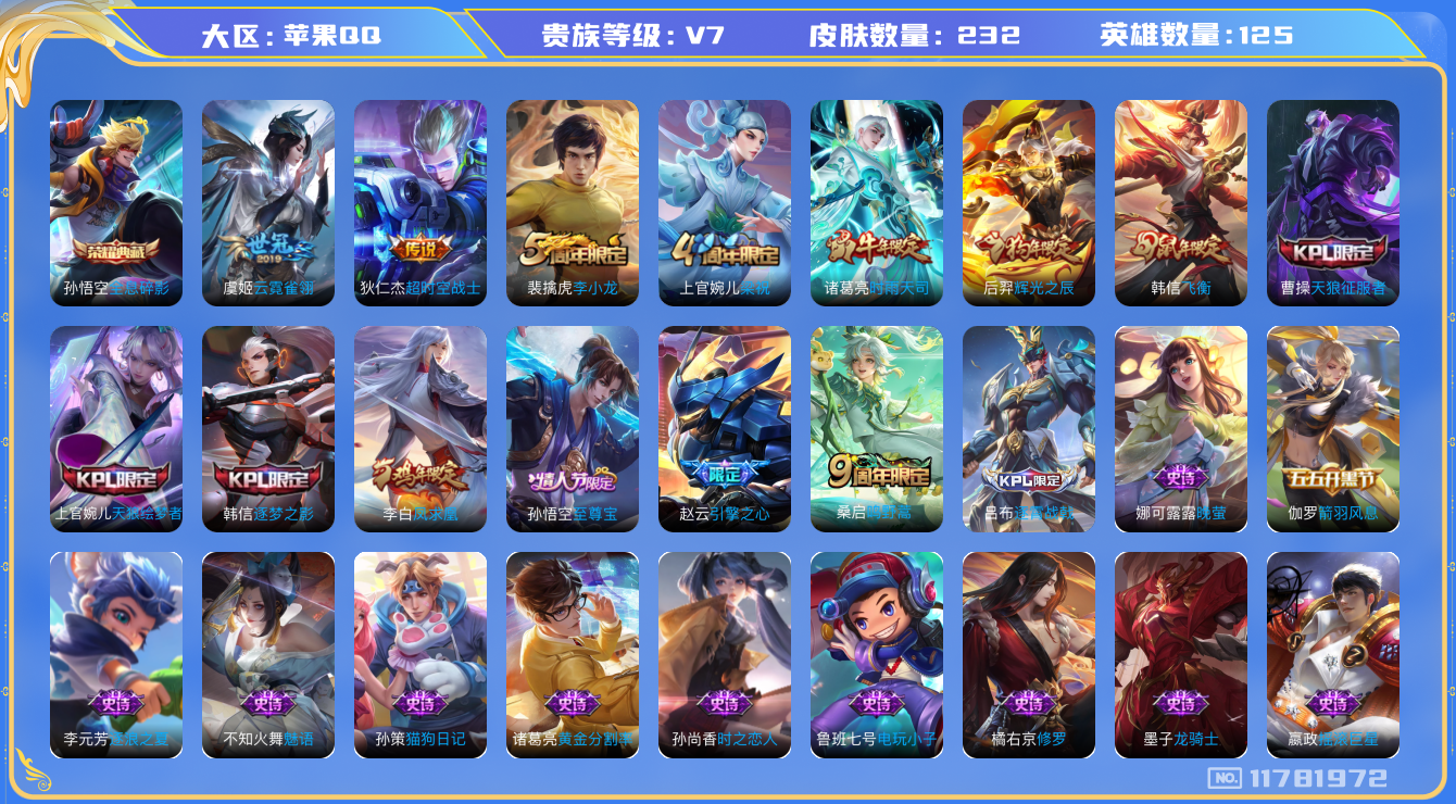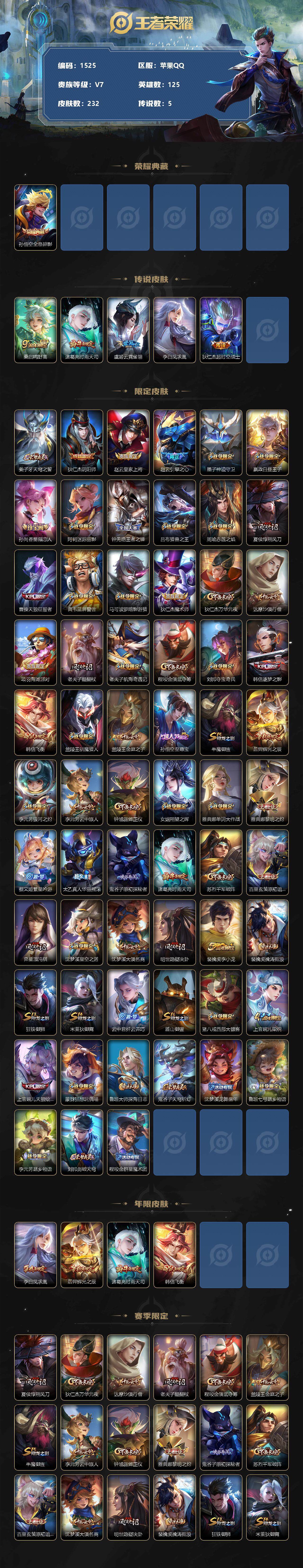 [11781972]【商品标题】:苹果Q-V6-永恒钻石IV段位-125英雄-232皮肤-1典藏-0珍品无双-0无双-0珍品传说-5传说-64史诗