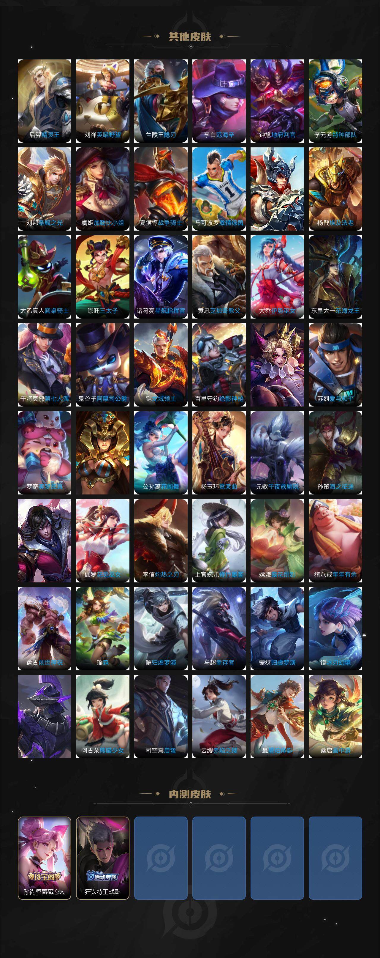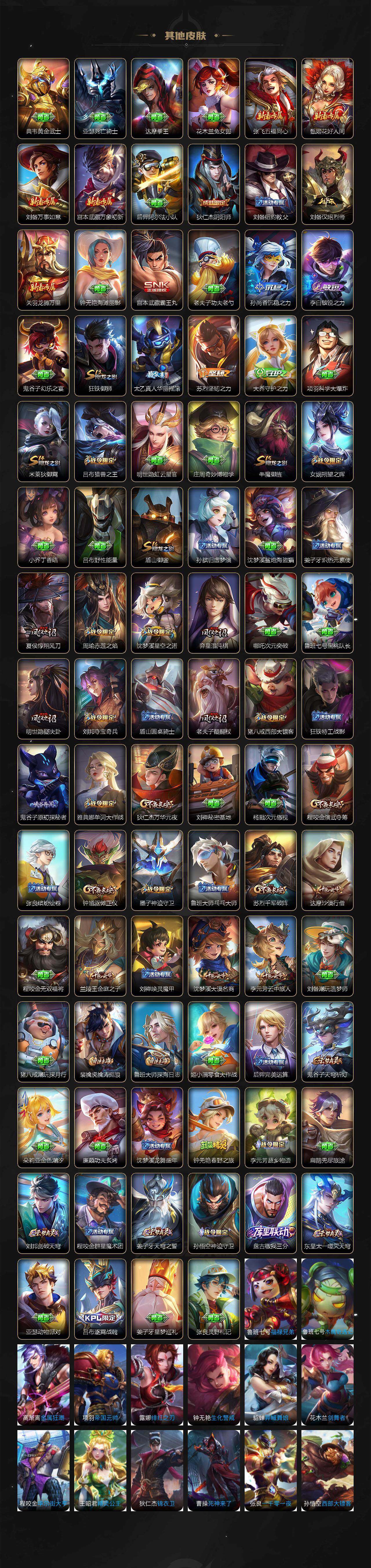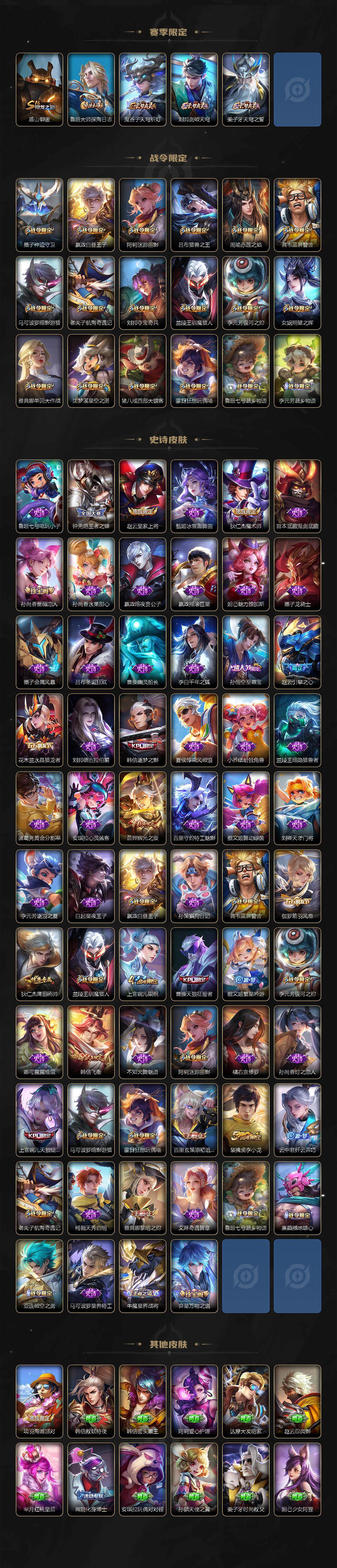 【限定皮肤】:姜子牙天穹之誓,狄仁杰阴阳师,赵云皇家上将,赵云引擎之心,墨子神迹守卫,嬴政白昼王子,孙尚香蔷薇恋人,阿轲迷踪丽影,钟无艳王者之锤,吕布猎兽之王,周瑜赤莲之焰,夏侯惇朔风刀,曹操天狼征服者,典韦蓝屏警告,马可波罗暗影游猎,狄仁杰魔术师,狄仁杰万华元夜,达摩沙漠行僧,项羽海滩派对,老夫子醍醐杖,老夫子航海奇遇记,程咬金演武夺筹,刘邦夺宝奇兵,韩信逐梦之影,韩信飞衡,兰陵王驯魔猎人,兰陵王金庭之子,孙悟空至尊宝,牛魔御旌,后羿辉光之辰,李元芳银河之约,李元芳云中旅人,钟馗驱傩正仪,女娲朔望之晖,雅典娜单词大作战,雅典娜黎明之约,蔡文姬繁星吟游,太乙真人华丽摇滚,鬼谷子原初探秘者,诸葛亮时雨天司,苏烈千军破阵,百里玄策原初追逐者,弈星混沌棋,沈梦溪星空之诺,沈梦溪大漠名商,明世隐疑决卦,裴擒虎李小龙,裴擒虎擒涛扼浪,狂铁御狮,米莱狄御霄,云中君纤云弄巧,盾山御銮,猪八戒西部大镖客,上官婉儿梁祝,上官婉儿天狼绘梦者,蒙犽狂想玩偶喵,鲁班大师探海日志,鬼谷子天穹祈灯,沈梦溪龙舞盛年,鲁班七号蔬乡物语,李元芳蔬乡物语,刘邦剑破天穹,程咬金群星魔术团