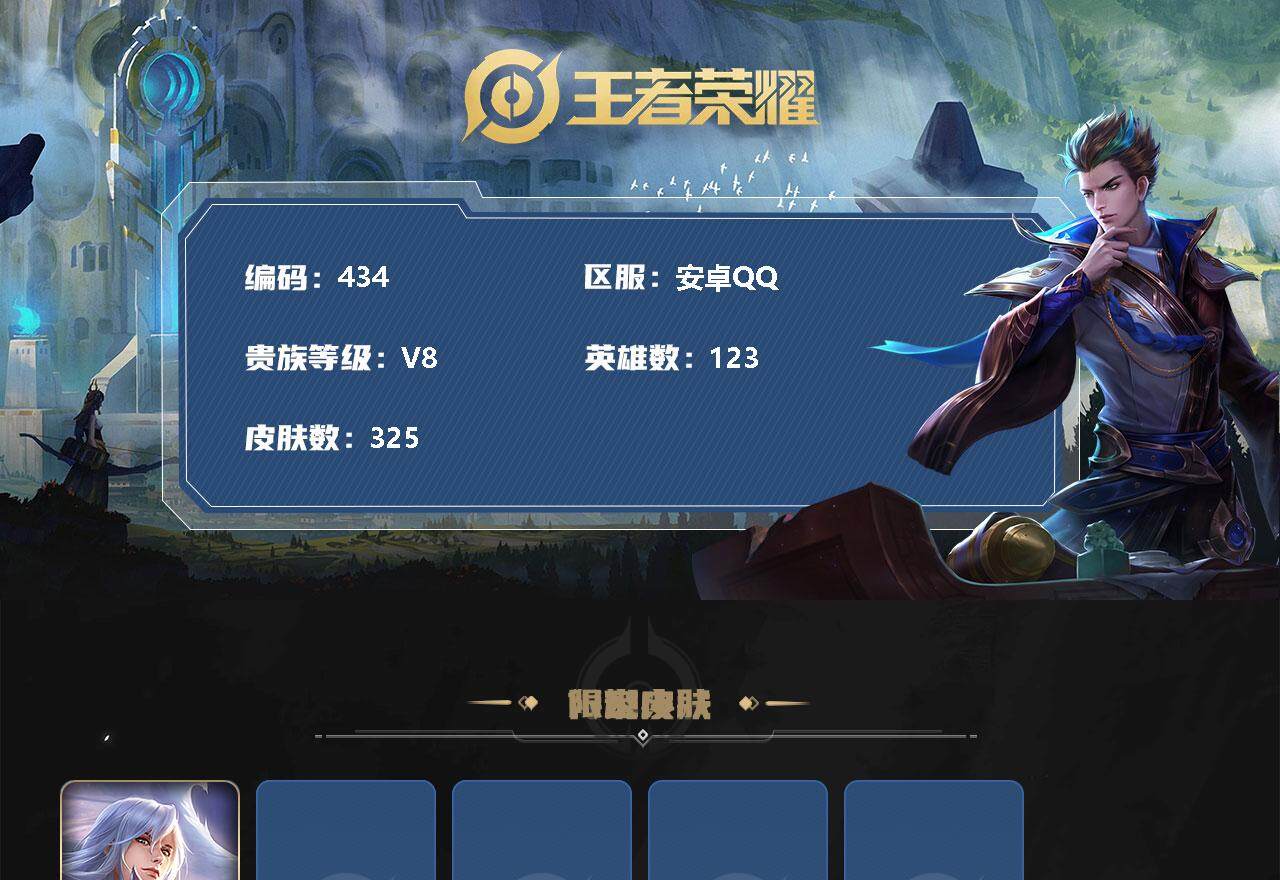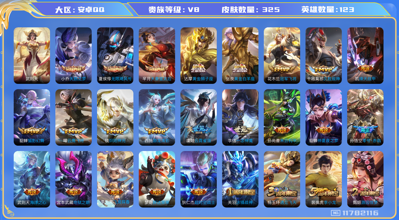 [11782116]【商品标题】:安卓Q-V8-至尊星耀II段位-123英雄-325皮肤-3典藏-0珍品无双-0无双-0珍品传说-28传说-103史诗