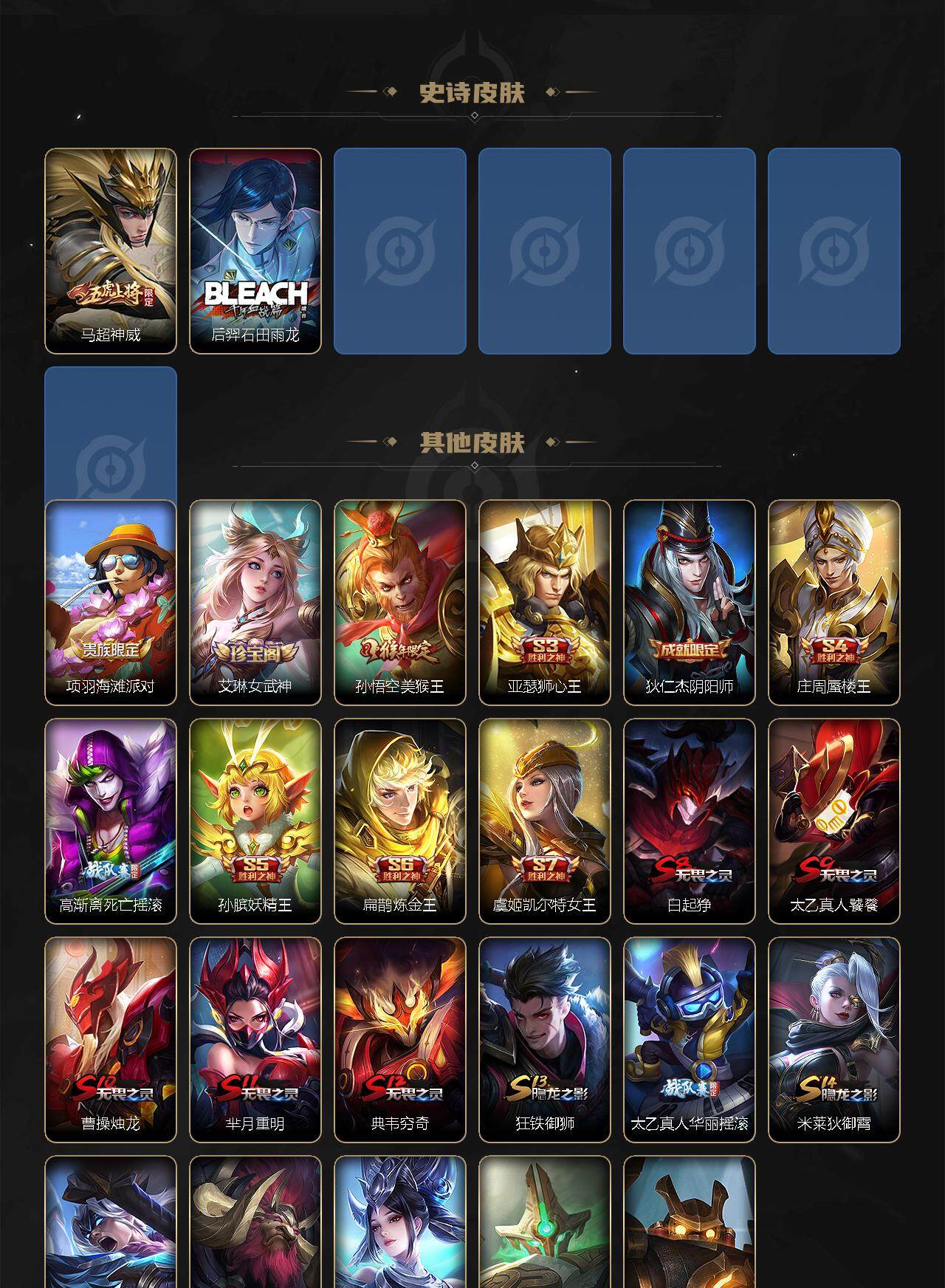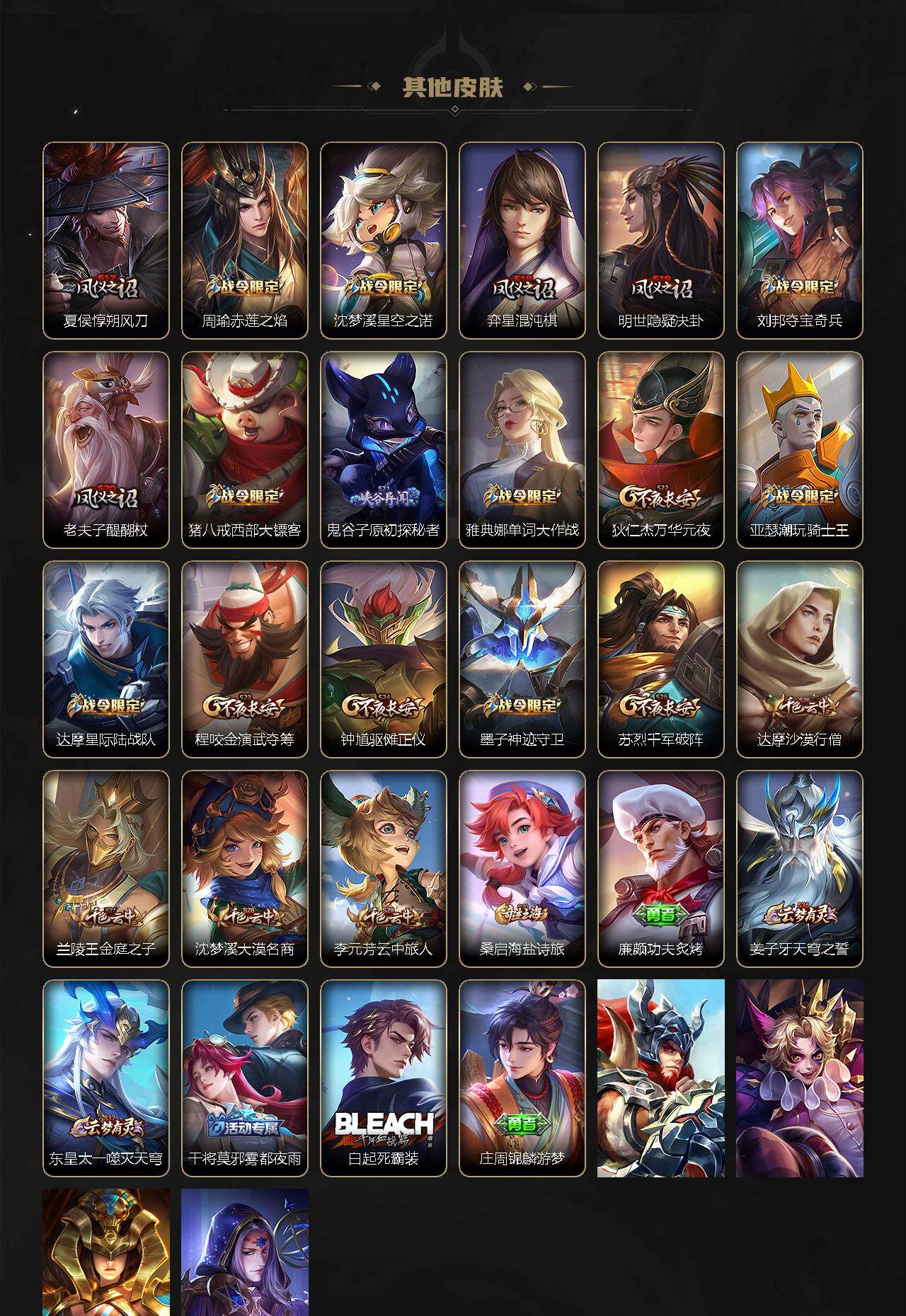 【限定皮肤】:白起狰,姜子牙天穹之誓,狄仁杰阴阳师,虞姬凯尔特女王,赵云皇家上将,赵云龙胆,墨子神迹守卫,妲己时之彼端,嬴政白昼王子,鲁班七号狮舞东方,庄周蜃楼王,庄周玄嵩,庄周高山流水,高渐离死亡摇滚,阿轲迷踪丽影,钟无艳王者之锤,孙膑妖精王,扁鹊炼金王,芈月重明,芈月白晶晶,吕布天魔缭乱,吕布猎兽之王,吕布御风骁将,周瑜赤莲之焰,元歌云间偶戏,夏侯惇朔风刀,甄姬幽恒,甄姬游园惊梦,曹操烛龙,典韦穷奇,典韦蓝屏警告,典韦岱宗,马可波罗逐梦之星,马可波罗暗影游猎,狄仁杰魔术师,狄仁杰万华元夜,达摩星际陆战队,达摩沙漠行僧,项羽海滩派对,项羽霸王别姬,老夫子醍醐杖,老夫子航海奇遇记,关羽冰锋战神,程咬金演武夺筹,露娜一生所爱,刘邦夺宝奇兵,韩信飞衡,王昭君凤凰于飞,兰陵王默契交锋,兰陵王驯魔猎人,兰陵王金庭之子,花木兰默契交锋,亚瑟狮心王,亚瑟潮玩骑士王,孙悟空美猴王,孙悟空至尊宝,孙悟空大圣娶亲,孙悟空零号赤焰,牛魔御旌,牛魔奔雷神使,后羿辉光之辰,后羿如梦令,李元芳银河之约,李元芳云中旅人,虞姬霸王别姬,虞姬启明星使,钟馗神迹守卫,钟馗驱傩正仪,杨玉环遇见飞天,女娲朔望之晖,干将莫邪冰霜恋舞曲,雅典娜单词大作战,雅典娜黎明之约,蔡文姬奇迹圣诞,蔡文姬繁星吟游,太乙真人饕餮,太乙真人华丽摇滚,东皇太一逐梦之光,鬼谷子原初探秘者,鬼谷子五谷丰年,诸葛亮时雨天司,大乔白鹤梁神女,黄忠烈魂,铠青龙志,苏烈千军破阵,百里玄策白虎志,百里玄策原初追逐者,弈星混沌棋,梦奇顽趣,公孙离蜜橘之夏,公孙离祈雪灵祝,沈梦溪星空之诺,沈梦
