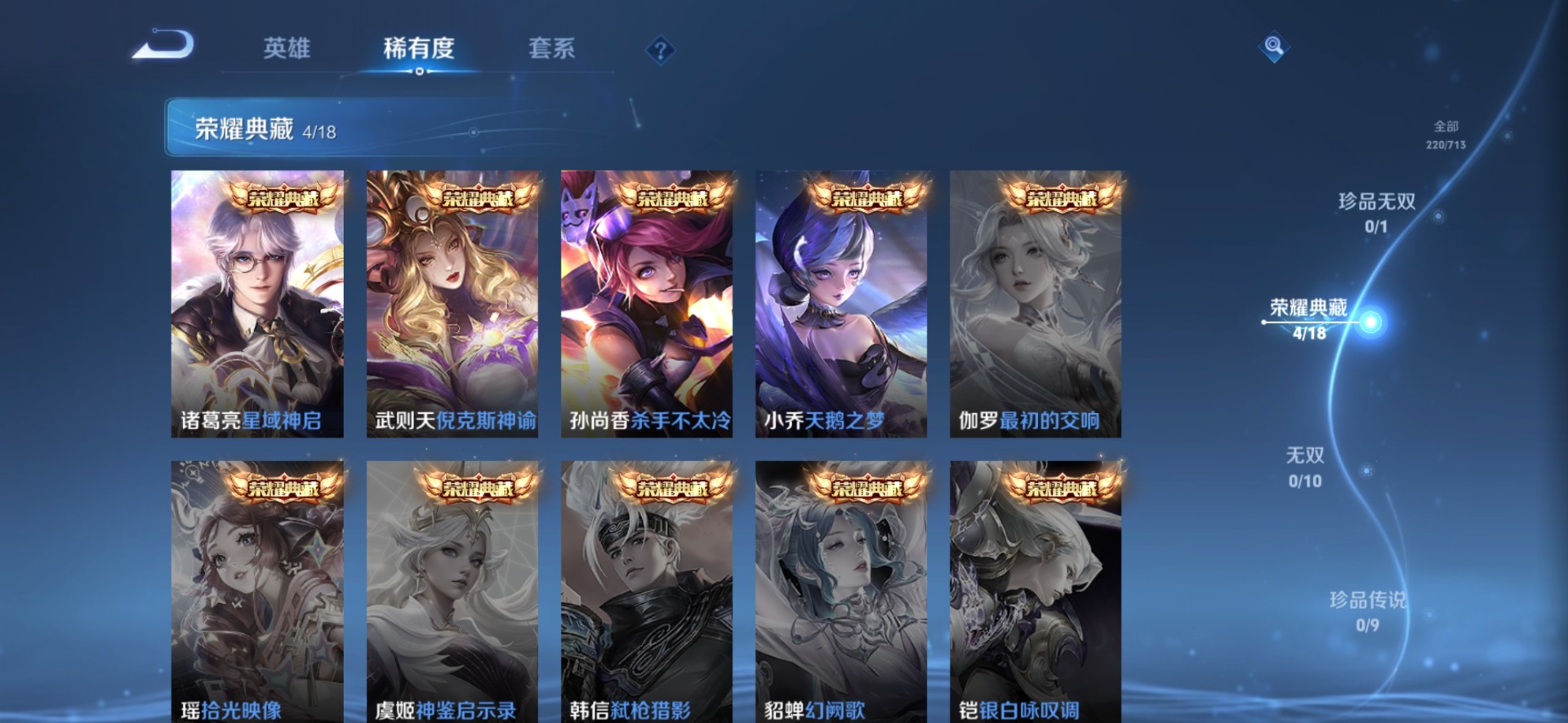 甄姬女儿国国王,廉颇寅虎·御盾,伽罗天狼溯光者,伽罗太华,孙尚香异界灵契,镜匿光追影者,杨玉环寅虎·心曲,公孙离蜜橘之夏,上官婉儿梁祝,女娲补天,芈月白晶晶,孙悟空至尊宝,韩信傲雪梅枪
