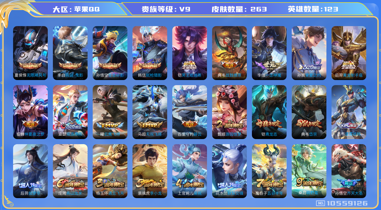 [10559126]V9 4典藏 16传说 123英雄 263皮肤 可修改实名 优质装备:无限飓风号(高达),鸣剑·曳影,全息碎影(猴子典藏),弑枪猎影(韩信典藏),黄金射手座,云鹰飞将(小将军),一念神魔,仲夏夜之梦(大飞蛾),挚爱之约,无双飞将,碎云,追逃游戏(亚瑟) 传说皮:典韦战鼓燎原,铠冥王哈迪斯 珍宝阁皮:蔷薇恋人,玩趣恶龙 限定皮:愿照·九州拓(澜年限),愿照·岁时盈(虞姬年限),逐霄战戟,鸣野蒿,遇见飞天,高山流水,齐天大圣,五谷丰年,青龙志(铠年限),游园惊梦,梁祝,岱宗(典韦年限),李小龙,如梦令-后羿,默契交锋-花木兰,枫霜尽 史诗皮:器灵·浮梦炉,破空之剑,紫霞仙子,苍穹之光,电玩小子(小书包),白龙吟,黄金分割率,特工魅影,千年之狐,江河有灵,魅语,冰冠公主,青蛇,偶像歌手,暗夜猫娘,龙骑士(小龙虾),末日机甲-吕布,猫狗日记-孙策,时之恋人-孙尚香,乱世虎臣,节奏热浪,修罗,女仆咖啡,摇滚巨星,水果甜心,绅士熊喵,天才门将,星夜王子,心灵骇客,功夫厨神,德古拉伯爵,幽灵船长,鬼剑武藏,暗渊魔法,心灵战警,纤云弄巧,繁星吟游(呼啦呼啦),拒霜思,缤纷独角兽,乘风破浪,逐浪之夏,水晶猎龙者,曙光守护者,箭羽风息,金属风暴,圣诞狂欢,圣诞恋歌,鹰眼统帅,暗夜贵公子,魅力维加斯,赏金猎手,未来纪元-赵云