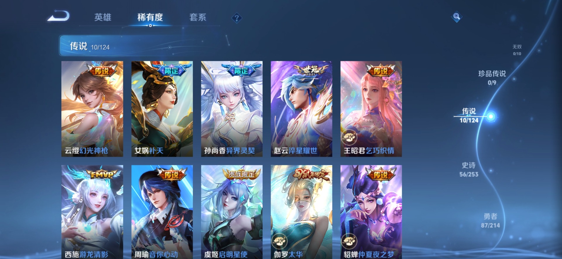 甄姬女儿国国王,廉颇寅虎·御盾,伽罗天狼溯光者,伽罗太华,孙尚香异界灵契,镜匿光追影者,杨玉环寅虎·心曲,公孙离蜜橘之夏,上官婉儿梁祝,女娲补天,芈月白晶晶,孙悟空至尊宝,韩信傲雪梅枪