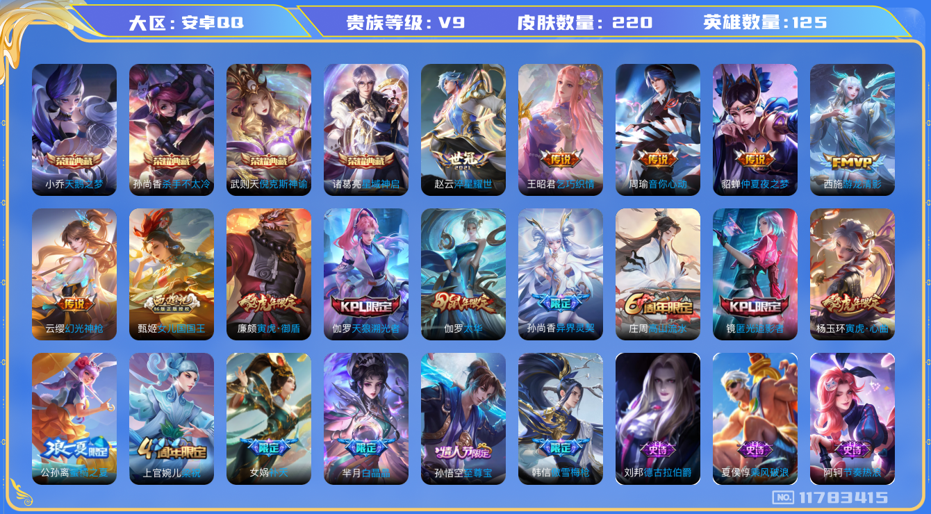 [11783415]V9 4典藏 10传说 125英雄 220皮肤 典藏英雄武则天 可修改实名 优质装备:天鹅之梦(小乔典藏),倪克斯神谕(宇宙婆娘),杀手不太冷,星域神启(倪克斯贼亮),仲夏夜之梦(大飞蛾),音你心动-周瑜,乞巧织情,游龙清影(小青龙),淬星耀世 传说皮:幻光神枪 珍宝阁皮:女武神 限定皮:至尊宝,太华(伽罗年限),异界灵契(白毛香),傲雪梅枪,补天,白晶晶,高山流水,梁祝,天狼溯光者,蜜橘之夏,匿光追影者,女儿国国王,寅虎·御盾(廉颇年限),寅虎·心曲(虎婆) 史诗皮:龙之律动,紫霞仙子,电玩小子(小书包),江河有灵,雪夜绮愿(周瑜),魅语,百解令(蒙犽),无限星赏官,冰冠公主,偶像歌手,龙骑士(小龙虾),末日机甲-吕布,猫狗日记-孙策,乱世虎臣,节奏热浪,女仆咖啡,天才门将,星夜王子,心灵骇客,德古拉伯爵,幽灵船长,鬼剑武藏,心灵战警,乐园奇幻夜,舞动绿茵,纤云弄巧,拒霜思,缤纷独角兽,乘风破浪,逐浪之夏,水晶猎龙者,金属风暴,圣诞恋歌,鹰眼统帅,暗夜贵公子,魅力维加斯,黎明之约,寅虎·御盾,未来纪元-赵云