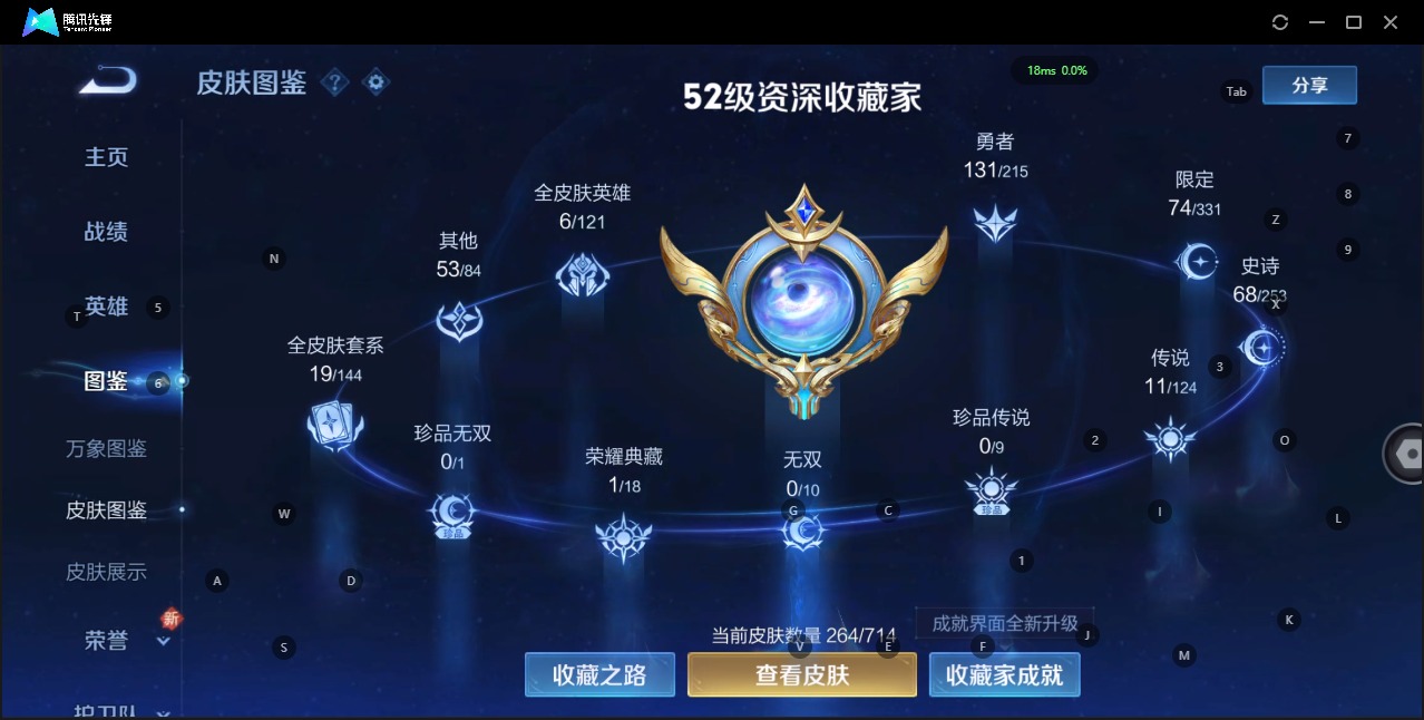- PX_2082491-贵族等级: V8 英雄数: 122 皮肤数: 275 荣耀水晶: 九霄神辉 珍品传说: 怪盗基德 星传说: 幽冥之眼 传说皮: 黄金射手座,冠军飞将,云鹰飞将,久胜战神,炽阳神光,一念神魔,地狱之眼,乞巧织情,淬星耀世 限定皮: 遇见飞天,梁祝,天魔缭乱,神威,蜜橘之夏,青龙志,玄武志,至尊宝,大圣娶亲,默契交锋-花木兰,高山流水,孙行者,傲雪梅枪,五谷丰年,夏侯惇霜北刀,鸣