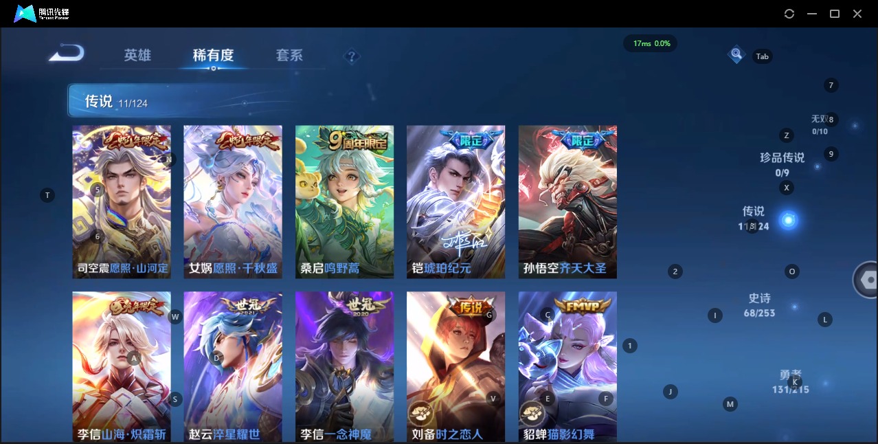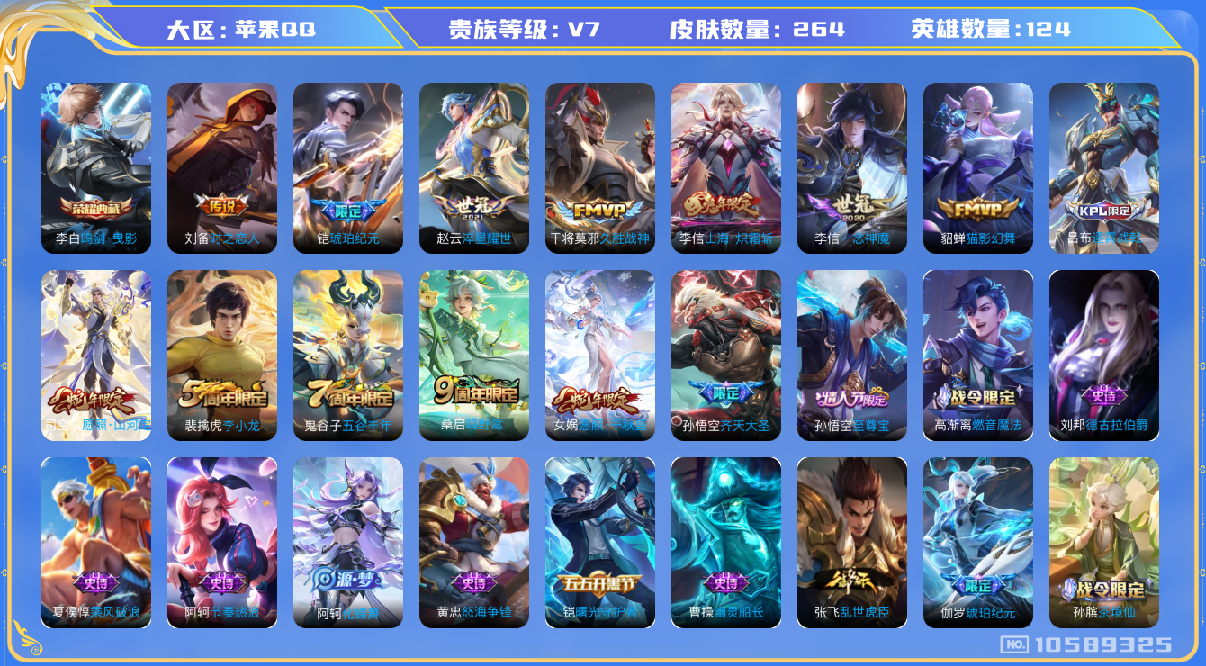 [10589325]V7 1典藏 11传说 124英雄 264皮肤 可修改实名 荣耀水晶:鸣剑·曳影 传说皮:琥珀纪元铠,山海·炽霜斩(李信年限),一念神魔,淬星耀世,久胜战神,猫影幻舞,时之恋人-刘备(电焊工) 珍宝阁皮:胡桃夹子,万物之道 限定皮:愿照·山河定(司空震年限),愿照·千秋盛(女娲年限),逐霄战戟,鸣野蒿,至尊宝,齐天大圣,五谷丰年,李小龙 史诗皮:星界战将,茶境仙,化蝶舞,鸭鸭历险记-刘禅,龙之律动,蒙犽顽岩魄,怒海争锋,琥珀纪元伽罗,遇见神鹿,紫霞仙子,黄金分割率,特工魅影,永昼,冰冠公主,江河有灵,百解令(蒙犽),高渐离燃音魔法,蒙恬荣光圣徽,晚萤,魅语,末日机甲-吕布,猫狗日记-孙策,乱世虎臣,节奏热浪,修罗,女仆咖啡,摇滚巨星,水果甜心,绅士熊喵,天才门将,星夜王子,时之奇旅-安琪拉,功夫厨神,德古拉伯爵,暗隐猎兽者,幽灵船长,鬼剑武藏,舞动绿茵,诗语江南,纤云弄巧,拒霜思,乘风破浪,逐浪之夏,水晶猎龙者,曙光守护者,唤灵魅影,金属风暴,原初追逐者,圣诞狂欢,鹰眼统帅,魅力维加斯,黎明之约,未来纪元-赵云