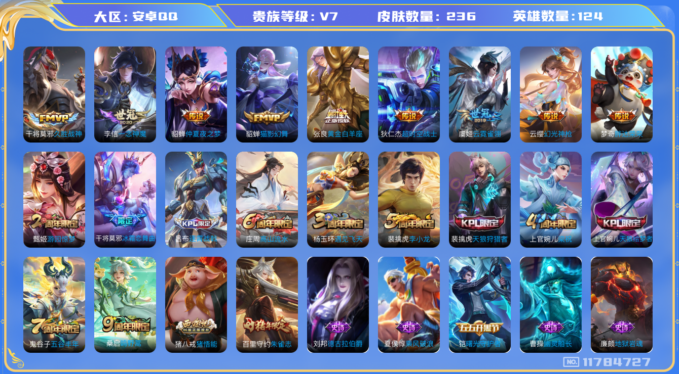 [11784727]V7 10传说 124英雄 236皮肤 可修改实名 优质装备:黄金白羊座,猫影幻舞,久胜战神,一念神魔,云霓雀翎,仲夏夜之梦(大飞蛾),胖达荣荣,超时空战士-狄仁杰 传说皮:幻光神枪 珍宝阁皮:女武神 限定皮:逐霄战戟,鸣野蒿,遇见飞天,高山流水,五谷丰年,游园惊梦,梁祝,天狼狩猎者,天狼绘梦者,李小龙,朱雀志(守约年限),猪悟能,冰霜恋舞曲 史诗皮:鸭鸭历险记-刘禅,星界战将,小牛鸭,遇见神鹿,紫霞仙子,黄金分割率,特工魅影,江河有灵,完美假期,魅语,偶像歌手,猫狗日记-孙策,时之恋人-孙尚香,修罗,女仆咖啡,水果甜心,天才门将,心灵骇客,功夫厨神,德古拉伯爵,暗隐猎兽者,幽灵船长,鬼剑武藏,乐园奇幻夜,舞动绿茵,地狱岩魂,纤云弄巧,繁星吟游(呼啦呼啦),缤纷独角兽,乘风破浪,逐浪之夏,水晶猎龙者,曙光守护者,金属风暴,原初追逐者,圣诞狂欢,圣诞恋歌,鹰眼统帅,魅力维加斯,黎明之约