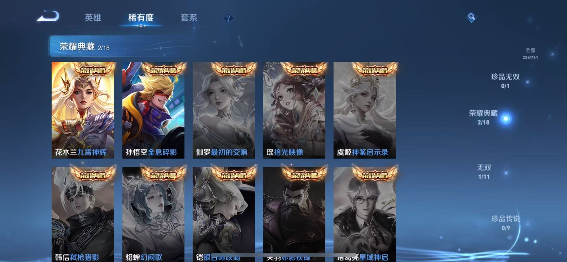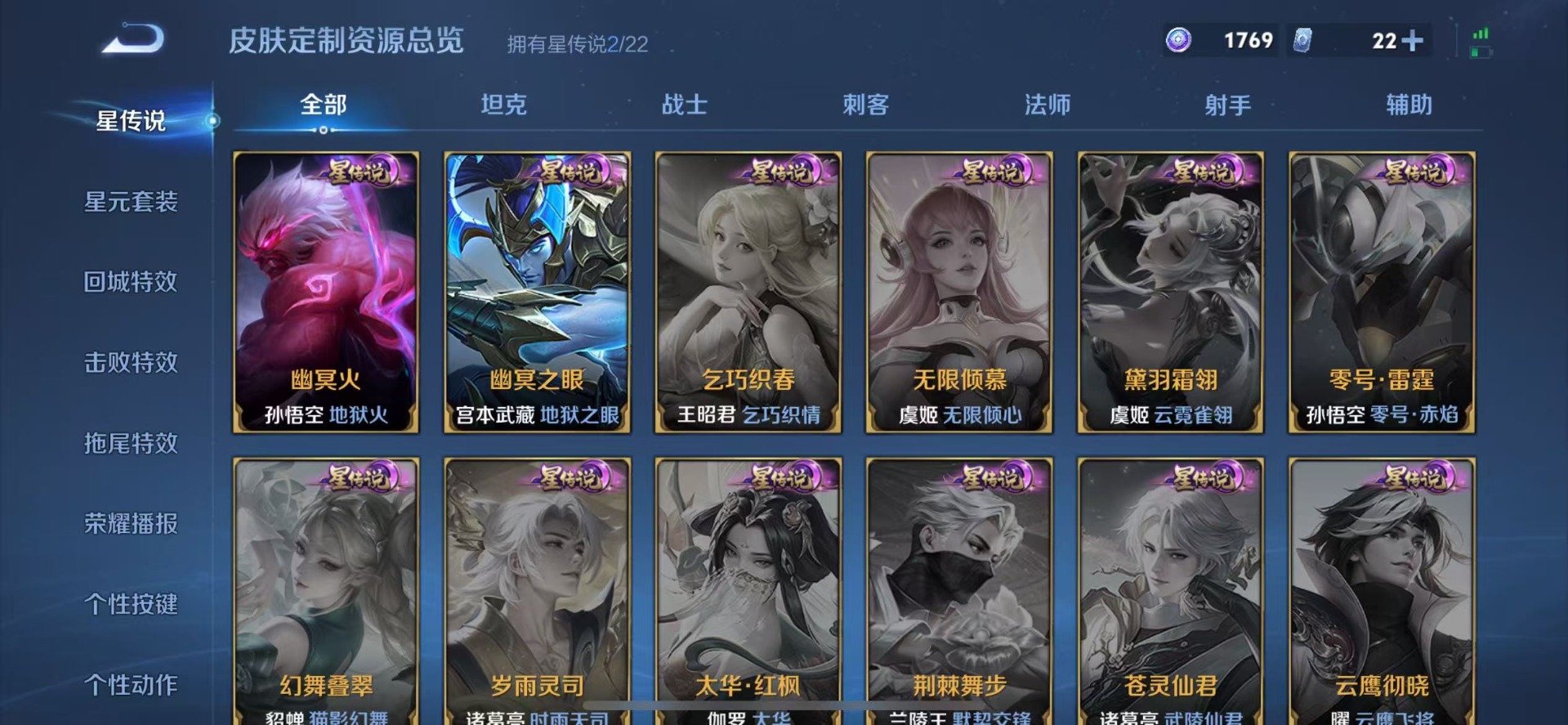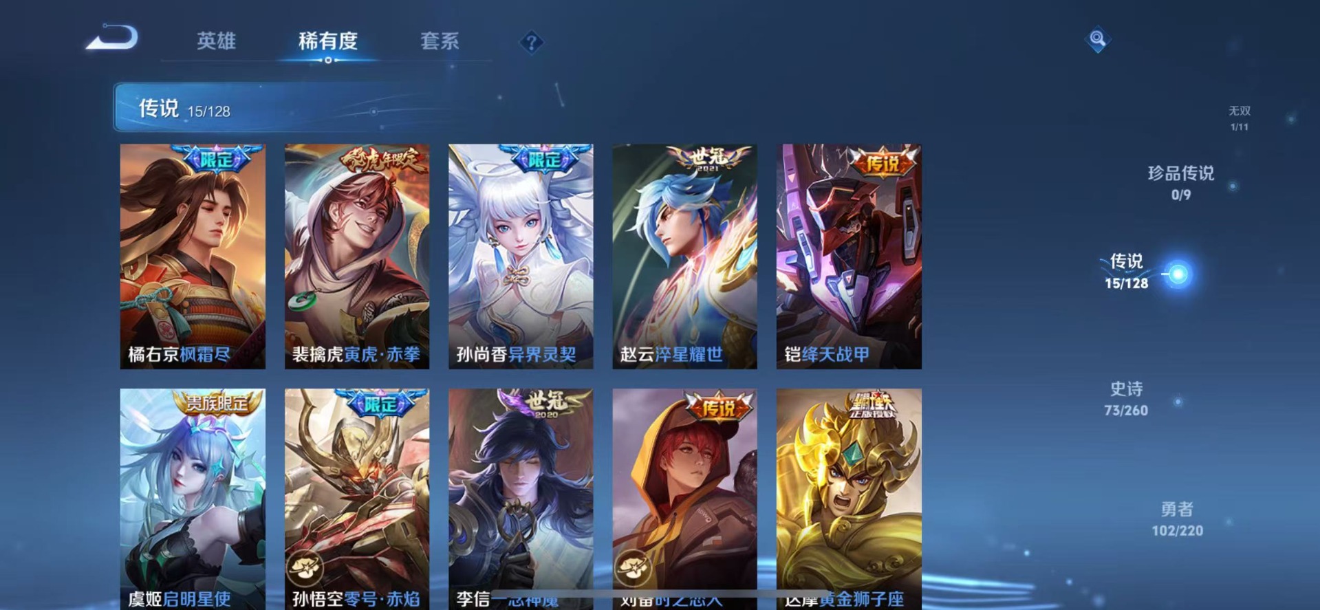 - [11472219]V9 2典藏 13传说 125英雄 313皮肤 可修改实名 连体和平 荣耀水晶:弑枪猎影(韩信典藏),活力突击 传说皮:黄金天蝎座,乘龙·淬吴钩(孙策年限),典韦战鼓燎原,山海·炽霜斩(李信年限),地狱之眼,一念神魔,炽阳神光,音你心动-周瑜,碎云,百相守梦(张飞) 珍宝阁皮:蔷薇恋人,玩趣恶龙 限定皮:至尊宝,魔法小厨娘,神威(电光马子),高山流水,降魔,五谷丰年,游园惊梦,李小龙,孙行者,猪悟能,天魔缭乱,青春决赛季,匿光追影者,女儿国国王,寅虎·瑞焰(虎皮蛋子),百木心枪,玉兔公主,匿光启智者 史诗皮:石田雨龙,怒海争锋,决胜骁骑,奇遇星旅,蔬乡物语(鲁班七号),琥珀纪元伽罗,紫霞仙子,苍穹之光,黄金分割率,特工魅影,千年之狐,永昼,江河有灵,高渐离燃音魔法,百解令(蒙犽),蒙恬荣光圣徽,冰冠公主,偶像歌手,无限星赏官,电玩·爆裂旋风,龙骑士(小龙虾),末日机甲-吕布,猫狗日记-孙策,时之恋人-孙尚香,乱世虎臣,节奏热浪,女仆咖啡,摇滚巨星,水果甜心,绅士熊喵,天才门将,星夜王子,心灵骇客,功夫厨神,德古拉伯爵,暗隐猎兽者,幽灵船长,鬼剑武藏,暗渊魔法,心灵战警,乐园奇幻夜,天秀·启明,舞动绿茵,地狱岩魂,纤云弄巧,拒霜思,缤纷独角兽,乘风破浪,逐浪之夏,水晶猎龙者,曙光守护者,热力回旋,箭羽风息,金属风暴,圣诞狂欢,圣诞恋歌,鹰眼统帅,暗夜贵公子,魅力维加斯,黎明之约,赏金猎手,千筹问战,无心,未来纪元-赵云
