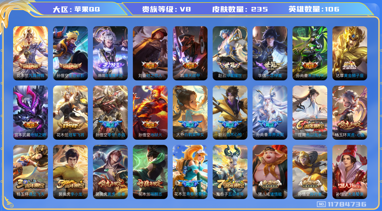 [11784736]V8 2典藏 1无双 15传说 106英雄 235皮肤 可修改实名 女号 优质装备:全息碎影(猴子典藏),九霄神辉(木兰典藏),韩信群星魔术团(韩信无双),黄金狮子座,冠军飞将,绛天战甲(鸡嘴战神),一念神魔,末日机甲-孙尚香(绿蚂蚱),地狱火,零号·赤焰,地狱之眼,时之恋人-刘备(电焊工),淬星耀世,涂山容容 珍宝阁皮:优雅恋人 限定皮:至尊宝,白虎志(电光耗子),异界灵契(白毛香),傲雪梅枪,白鹤梁神女,神威(电光马子),瑞麟志(木兰年限),遇见飞天,高山流水,五谷丰年,冰锋战神,李小龙,逐梦之影,孙行者,猪悟能,大圣娶亲,青春决赛季,寅虎·心曲(虎婆),寅虎·赤拳(老虎年限),百木心枪,枫霜尽 史诗皮:电玩小子(小书包),白龙吟,黄金分割率,千年之狐,江河有灵,百解令(蒙犽),蒙恬荣光圣徽,冰冠公主,偶像歌手,晚萤,暗夜猫娘,龙骑士(小龙虾),猫狗日记-孙策,乱世虎臣,节奏热浪,修罗,女仆咖啡,摇滚巨星,水果甜心,天才门将,星夜王子,德古拉伯爵,暗隐猎兽者,幽灵船长,鬼剑武藏,舞动绿茵,地狱岩魂,纤云弄巧,拒霜思,缤纷独角兽,乘风破浪,逐浪之夏,水晶猎龙者,曙光守护者,金属风暴,原初追逐者,圣诞狂欢,鹰眼统帅,王者之锤,黎明之约,无心,未来纪元-赵云