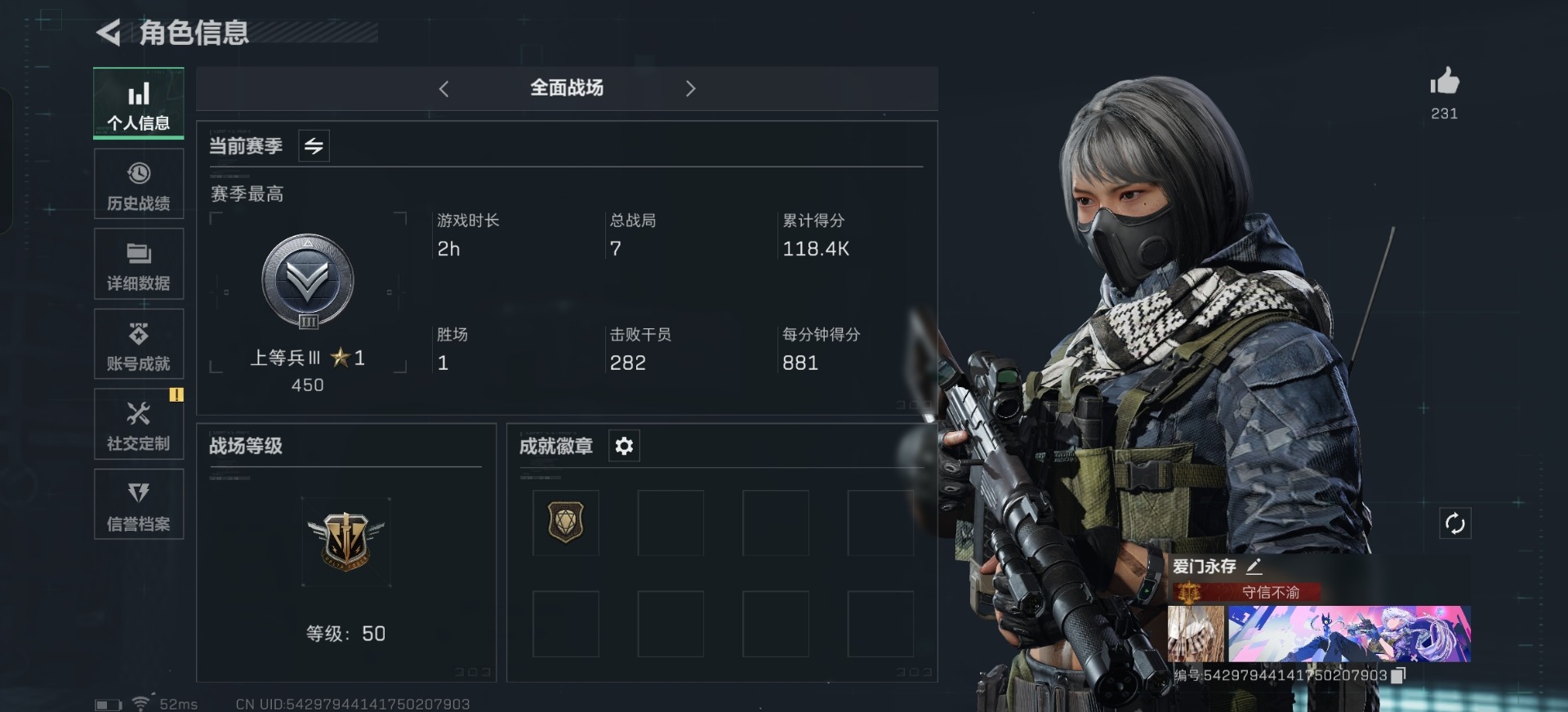 - [11875297]总资产:258.3M 2干员外观 6传说枪械 哈夫币:21.581K 可二次 可修改实名 烽火地带段位:无段位 全面战场段位:无段位 传说武器皮肤:SR-25射手步枪-水墨云图,SCAR-H战斗步枪-水墨云图,SCAR-H战斗步枪-铁艺苍穹,SMG45冲锋枪-骑士,AK-12突击步枪-夜鹰,M4A1突击步枪-蚀金玫瑰 史诗武器皮肤:PSG-1射手步枪-原型机(典藏),AK-12突击步枪-原型机(典藏),SR-3M紧凑突击步枪-英雄,PTR-32战斗步枪-ACE,QBZ95-1突击步枪-ACE,M4A1突击步枪-特勤执行,Vector冲锋枪-红色彗星,AUG突击步枪-特勤执行,PKM通用机枪-蝮蛇,AUG突击步枪-蝮蛇,M700狙击步枪-蝮蛇,SG552突击步枪-尖端治疗,M1014霰弹枪-林中猎手,PKM通用机枪-守夜人,AS Val突击步枪-尖端治疗,M700狙击步枪-守夜人,Ash-12战斗步枪-守夜人,SR-25射手步枪-尖端治疗,勇士冲锋枪-深海恐惧,SG552突击步枪-深海恐惧,AKM突击步枪-林中猎手,S12K霰弹枪-曙光,PKM通用机枪-英雄,QSZ92G-风林火山 干员外观:红狼-蚀金玫瑰,骇爪-水墨云图