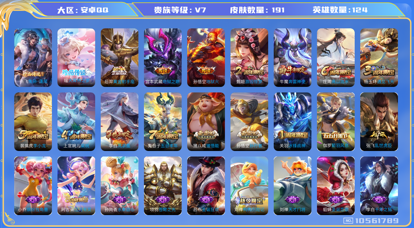 - [11606313]V10 3典藏 1珍品无双 4无双 1珍品传说 46传说 125英雄 492皮肤 可修改实名 优质装备:馥梦繁花,全息碎影(猴子典藏),弑枪猎影(韩信典藏),神器·明辉仪,青丘·九尾(妲己无双),碎月剑心(李白无双),花合斗,最初的交响(伽罗典藏),酷洛米之心,黄金狮子座,黄金射手座,冠军飞将,云鹰飞将(小将军),绛天战甲(鸡嘴战神),黄金白羊座,猫影幻舞,久胜战神,炽阳神光,一念神魔,云霓雀翎,末日机甲-孙尚香(绿蚂蚱),地狱火,仲夏夜之梦(大飞蛾),音你心动-小乔,零号·赤焰,地狱之眼,音你心动-周瑜,李逍遥,乞巧织情,时之恋人-刘备(电焊工),游龙清影(小青龙),淬星耀世,超时空战士-狄仁杰,花朝如约(花篮子),音你闪耀(rap皮),神器·狴犴令,神器·明辉仪,青丘·九尾,电玩·雷克斯,艾琳觅芳踪,黄金天蝎座 传说皮:铠冥王哈迪斯,幻光神枪 珍宝阁皮:妄想食味,胡桃夹子,玩趣恶龙 限定皮:逐霄战戟,鸣野蒿,至尊宝,凤求凰(白切鸡),凤凰于飞,太华(伽罗年限),武陵仙君(小桃花),异界灵契(白毛香),星穹之声,绯月行,白鹤梁神女,魔法小厨娘,白晶晶,时雨天司(水龙头),神威(电光马子),飞衡(韩信年限),瑞麟志(木兰年限),高山流水,齐天大圣,匿光决锋者,五谷丰年,青龙志(铠年限),冰锋战神,武圣,天狼运算者,梁祝,御风骁将(吕布年限),岱宗(典韦年限),天狼溯光者,虎魄,天狼征服者,奔雷神使(牛魔年限),天狼绘梦者,李小龙,逐梦之影,玄武志(苏烈年限),朱雀志(守约年限),辉光之辰,如梦令-后羿,霸王别姬-项羽,霸王别姬-虞姬,奇迹圣诞,孙行者,猪悟能,大圣娶亲,引擎之心,天魔缭乱,乒乒小将,神奇女侠,无尽星芒,深海之息(深海大菠萝),唐三藏,时之奇旅-妲己,神器·万象笔,梦圆繁星 史诗皮:鸭鸭历险记-刘禅,化蝶舞,星界战将,灵蛊蚀心,龙之律动,小牛鸭,石田雨龙,茶境仙,破空之剑,东方月初,蒙犽顽岩魄,埋骨钱,芈月浮光幕影,怒海争锋,谪仙醉月,决胜骁骑,蔬乡物语(鲁班七号),琥珀纪元伽罗,百相守梦-百里守约,遇见神鹿,紫霞仙子,苍穹之光,电玩小子(小书包),白龙吟,黄金分割率,特工魅影,千年之狐,电玩·兔顽号,匿光破解者,百相守梦(刘备),百相守梦(关羽),电玩·爆裂旋风,浮梦罗烟,匿光侦查者,江河有灵,百解令(蒙犽),高渐离燃音魔法,银翎春语,偶像歌手