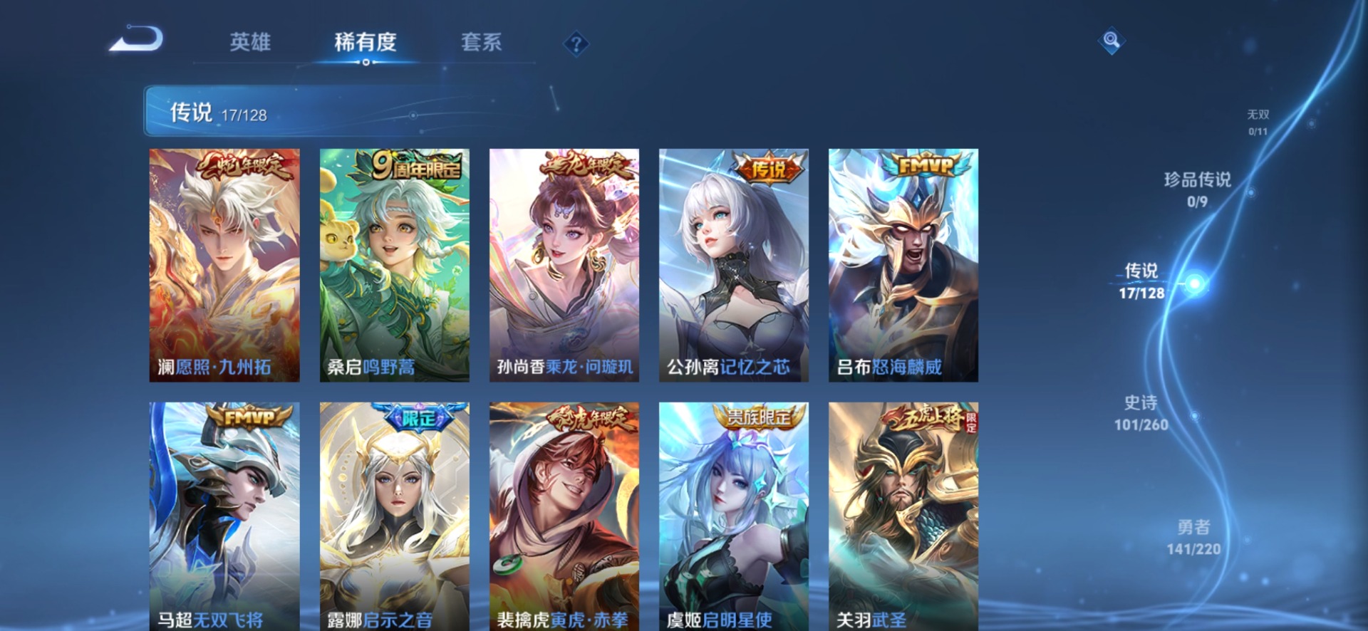 廉颇寅虎·御盾,伽罗太华,苏烈玄武志,张飞虎魄,牛魔奔雷神使,吕布御风骁将,露娜启示之音,露娜一生所爱,镜匿光追影者,公孙离蜜橘之夏,裴擒虎李小龙,裴擒虎寅虎·赤拳,东皇太一逐梦之光,上官婉儿梁祝,花木兰默契交锋,花木兰青春决赛季,马可波罗逐梦之星,马可波罗山海·玄木吟,桑启鸣野蒿,孙悟空孙行者,孙悟空大圣娶亲,孙悟空美猴王,百里玄策白虎志,赵云引擎之心,澜愿照·九州拓,关羽武圣,关羽冰锋战神