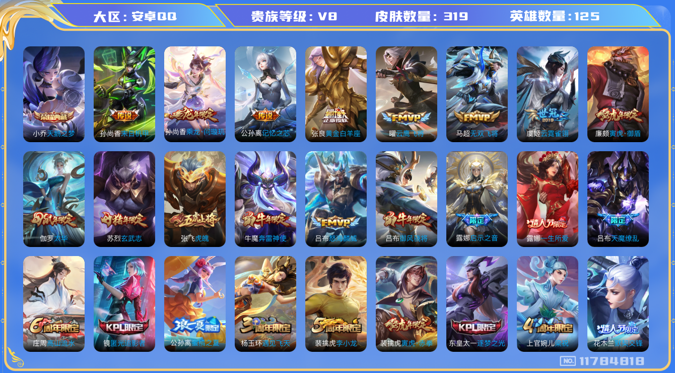 [11784818]V8 1典藏 17传说 125英雄 319皮肤 可修改实名 优质装备:天鹅之梦(小乔典藏),云鹰飞将(小将军),黄金白羊座,云霓雀翎,末日机甲-孙尚香(绿蚂蚱),无双飞将,记忆之芯(机甲兔),涂山容容 传说皮:乘龙·问璇玑(孙尚香年限) 珍宝阁皮:妄想食味,蔷薇恋人,女武神 限定皮:愿照·九州拓(澜年限),鸣野蒿,白虎志(电光耗子),太华(伽罗年限),遇见飞天,高山流水,怒海麟威,五谷丰年,冰锋战神,武圣,梁祝,御风骁将(吕布年限),逐梦之星,虎魄,奔雷神使(牛魔年限),李小龙,逐梦之光,玄武志(苏烈年限),默契交锋-花木兰,孙行者,一生所爱,大圣娶亲,引擎之心,天魔缭乱,青春决赛季,蜜橘之夏,美猴王,匿光追影者,寅虎·御盾(廉颇年限),寅虎·赤拳(老虎年限),启示之音,山海·玄木吟(马可年限) 史诗皮:器灵·浮梦炉,化蝶舞,灵蛊蚀心,星界战将,龙之律动,紫霞仙子,电玩小子(小书包),黄金分割率,特工魅影,千年之狐,永昼,江河有灵,魅语,蒙恬荣光圣徽,无限星赏官,冰冠公主,晚萤,电玩·爆裂旋风,龙骑士(小龙虾),末日机甲-吕布,猫狗日记-孙策,猫狗日记-大乔,乱世虎臣,节奏热浪,女仆咖啡,摇滚巨星,水果甜心,绅士熊喵,天才门将,星夜王子,心灵骇客,功夫厨神,德古拉伯爵,暗隐猎兽者,幽灵船长,鬼剑武藏,暗渊魔法,心灵战警,天秀·启明,舞动绿茵,地狱岩魂,纤云弄巧,繁星吟游(呼啦呼啦),拒霜思,缤纷独角兽,乘风破浪,逐浪之夏,龙鼓争鸣,水晶猎龙者,曙光守护者,箭羽风息,金属风暴,原初追逐者,圣诞狂欢,圣诞恋歌,鹰眼统帅,王者之锤,暗夜贵公子,魅力维加斯,黎明之约,赏金猎手,寅虎·御盾,无心,未来纪元-赵云