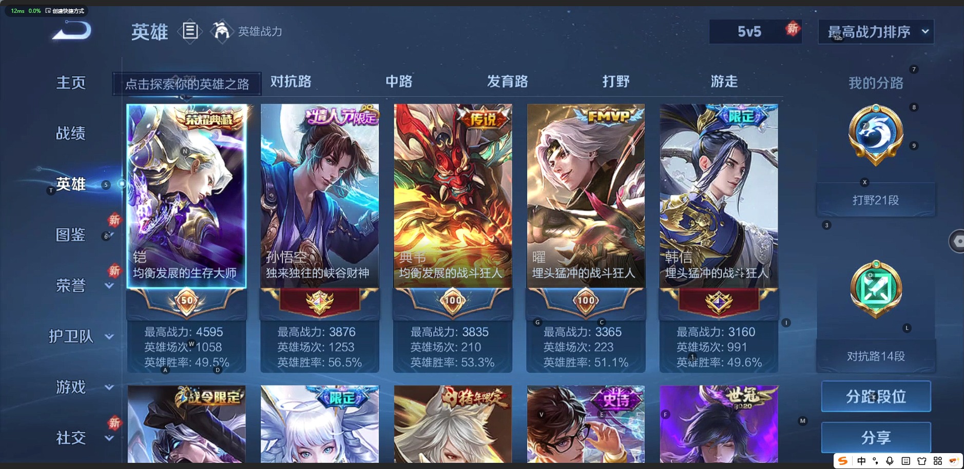 - [11602134]V6 5传说 124英雄 114皮肤 可修改实名 优质装备:末日机甲-孙尚香(绿蚂蚱) 传说皮:乘龙·铭钟鼎(赵云年限),落雪白狼,幻光神枪 珍宝阁皮:妄想食味 限定皮:鸣野蒿 史诗皮:鸭鸭历险记-刘禅,星界战将,龙之律动,战舞者,琥珀纪元伽罗,紫霞仙子,千年之狐,高渐离燃音魔法,末日机甲-吕布,乱世虎臣,水果甜心,星夜王子,心灵骇客,功夫厨神,暗隐猎兽者,幽灵船长,鬼剑武藏,心灵战警,乐园奇幻夜,舞动绿茵,缤纷独角兽,乘风破浪,水晶猎龙者,原初追逐者,圣诞狂欢,鹰眼统帅,魅力维加斯