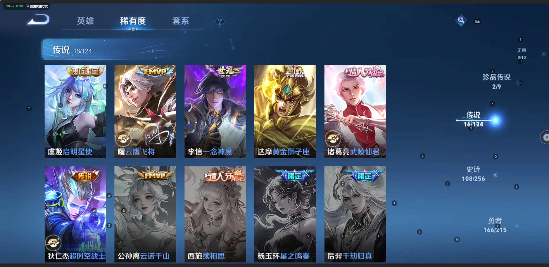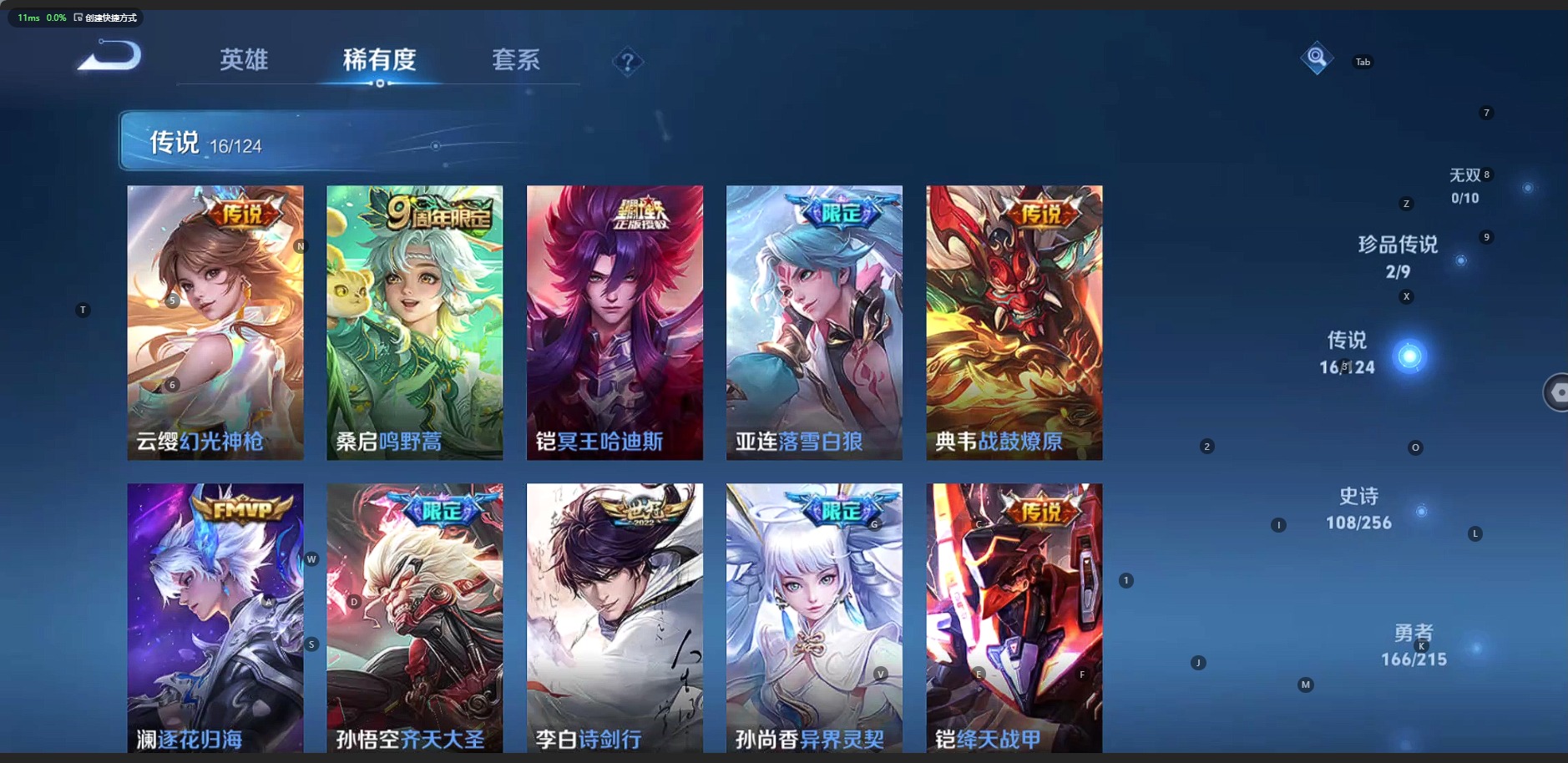 - [11297374]V6 8传说 124英雄 214皮肤 可修改实名 优质装备:猫影幻舞,炽阳神光,李逍遥,无双飞将,记忆之芯(机甲兔),澜逐花归海 珍宝阁皮:胡桃夹子,优雅恋人 限定皮:愿照·九州拓(澜年限),遇见飞天,诗剑行,五谷丰年,游园惊梦,李小龙,山海·玄木吟(马可年限) 史诗皮:器灵·浮梦炉,化蝶舞,龙之律动,战舞者,紫霞仙子,特工魅影,蒙恬荣光圣徽,晚萤,猫狗日记-孙策,乱世虎臣,修罗,摇滚巨星,水果甜心,绅士熊喵,天才门将,星夜王子,暗隐猎兽者,鬼剑武藏,地狱岩魂,纤云弄巧,繁星吟游(呼啦呼啦),乘风破浪,水晶猎龙者,金属风暴,原初追逐者,圣诞恋歌,鹰眼统帅,魅力维加斯,黎明之约,赏金猎手,滕王阁序,无心