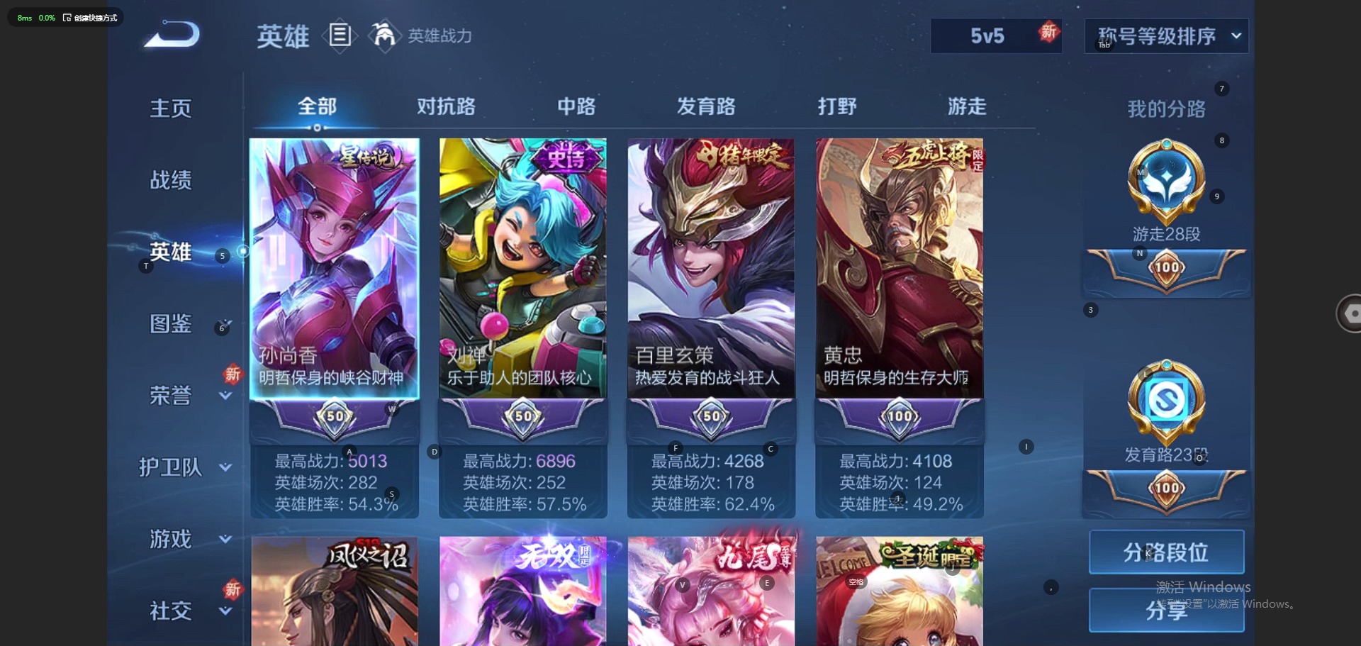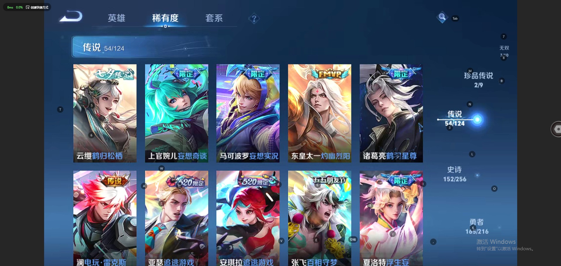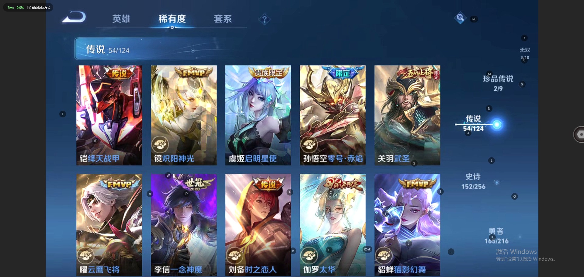 - [11884696]V7 2典藏 3珍品传说 8传说 125英雄 341皮肤 可修改实名 优质装备:鸣剑·曳影,弑枪猎影(韩信典藏),怪盗基德,一念神魔,胖达荣荣,涂山容容 珍品传说:时之奇旅-孙策,兔狲·蓬尾 传说皮:落雪白狼,死亡执政官,幻光神枪 珍宝阁皮:妄想食味,蔷薇恋人 限定皮:愿照·岁时盈(虞姬年限),逐霄战戟,鸣野蒿,白鹤梁神女,遇见飞天,五谷丰年,梁祝,李小龙,永曜之星,圣诞老人,孙行者,百木心枪,玉兔公主,天降福星 史诗皮:鸭鸭历险记-刘禅,器灵·浮梦炉,化蝶舞,星界战将,谪仙醉月,龙之律动,雪豹·霜爪,石田雨龙,百相守梦-周瑜,茶境仙,破空之剑,战舞者,东方月初,蒙犽顽岩魄,琥珀纪元伽罗,蔬乡物语(鲁班七号),百相守梦-百里守约,百相守梦-黄忠,织梦人,紫霞仙子,特工魅影,江河有灵,雪夜绮愿(周瑜),魅语,百解令(蒙犽),高渐离燃音魔法,蒙恬荣光圣徽,偶像歌手,白蛇,电玩·爆裂旋风,末日机甲-吕布,猫狗日记-孙策,乱世虎臣,节奏热浪,女仆咖啡,摇滚巨星,水果甜心,天才门将,星夜王子,心灵骇客,功夫厨神,德古拉伯爵,暗隐猎兽者,幽灵船长,鬼剑武藏,心灵战警,乐园奇幻夜,舞动绿茵,地狱岩魂,纤云弄巧,拒霜思,缤纷独角兽,乘风破浪,逐浪之夏,水晶猎龙者,曙光守护者,金属风暴,原初追逐者,圣诞狂欢,圣诞恋歌,鹰眼统帅,王者之锤,魅力维加斯,未来纪元-赵云