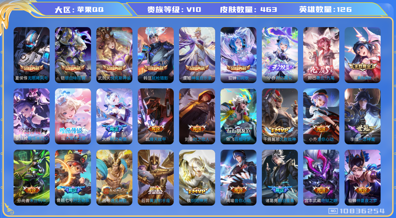 [10836254]V10 6典藏 3无双 2珍品传说 54传说 126英雄 463皮肤 典藏英雄武则天 可修改实名 荣耀水晶:神鉴启示录,弑枪猎影(韩信典藏),银白咏叹调(倪克斯侍卫),幻阙歌(貂蝉典藏),无限飓风号(高达),倪克斯神谕(宇宙婆娘) 无双皮:小乔时之魔女(小乔无双),真我赫兹(瑶)(瑶无双),青丘·九尾(妲己无双) 珍品传说:酷洛米之心,大耳狗之梦 传说皮:李逍遥,游龙清影(小青龙),永恒水手月亮,大乔-时之奇旅,黄金射手座,黄金白羊座,零号·赤焰,地狱火,仲夏夜之梦(大飞蛾),地狱之眼,末日机甲-孙尚香(绿蚂蚱),云霓雀翎,一念神魔,冠军飞将,久胜战神,猫影幻舞,云鹰飞将(小将军),炽阳神光,音你心动-小乔,音你心动-周瑜,胖达荣荣,时之恋人-刘备(电焊工),绛天战甲(鸡嘴战神),花朝如约(花篮子),燃星之曲,浮生妄,青丘·九尾,百相守梦(张飞),追逃游戏(安琪拉),追逃游戏(亚瑟),电玩·雷克斯,鹤羽星尊,灼幽烈阳,妄想实况,妄想奇谈,鹤归松栖(云缨),遇见神鼓,鲁班七号-时之奇旅,夜礼服假面,艾琳觅芳踪 珍宝阁皮:胡桃夹子,蔷薇恋人 限定皮:愿照·福禄聚(蔡文姬年限),鸣野蒿,至尊宝,白虎志(电光耗子),凤求凰(白切鸡),凤凰于飞,太华(伽罗年限),武陵仙君(小桃花),时之彼端,魔法小厨娘,白晶晶,时雨天司(水龙头),神威(电光马子),飞衡(韩信年限),玄嵩(庄周年限),瑞麟志(木兰年限),至美·乘鲤谣,至美·化雀舞,影龙天霄,遇见飞天,五谷丰年,青龙志(铠年限),冰锋战神,幽恒(沐浴露),武圣,天狼运算者,游园惊梦,梁祝,御风骁将(吕布年限),天狼狩猎者,龙胆,逐梦之星,烈魂,岱宗(典韦年限),天狼溯光者,虎魄,逐梦之音,奔雷神使(牛魔年限),祈雪灵祝(雪兔子),天狼绘梦者,李小龙,逐梦之光,玄武志(苏烈年限),朱雀志(守约年限),如梦令-嫦娥,如梦令-后羿,奇迹圣诞,大圣娶亲,天魔缭乱,冰霜恋舞曲,云端筑梦师,乒乒小将,蜜橘之夏,神奇女侠,时之祈愿-瑶(瑶传限),深海之息(深海大菠萝),神器·万象笔 史诗皮:星界战将,化蝶舞,鸭鸭历险记-刘禅,灵蛊蚀心,龙之律动,藏狐·褐绒,石田雨龙,蔬乡物语(鲁班七号),遇见神鹿,紫霞仙子,苍穹之光,电玩小子(小书包),白龙吟,黄金分割率,特工魅影,千年之狐,电玩·爆裂旋风,百相守梦(关羽),百相守梦(刘备),匿光破解者,