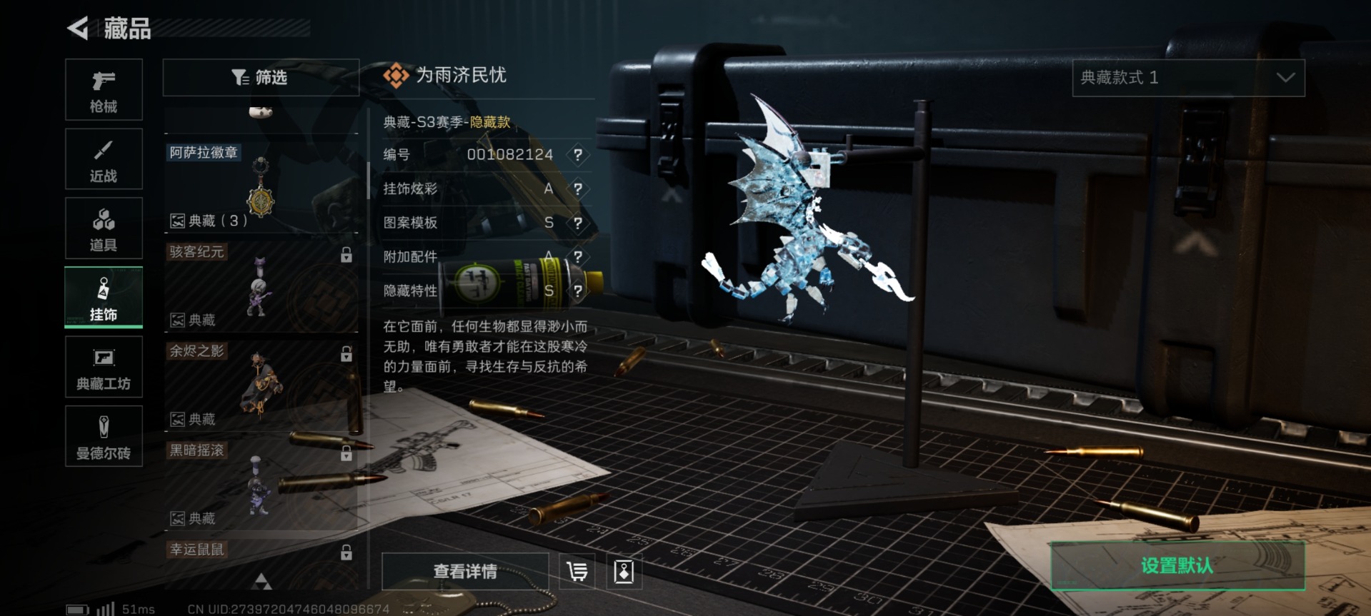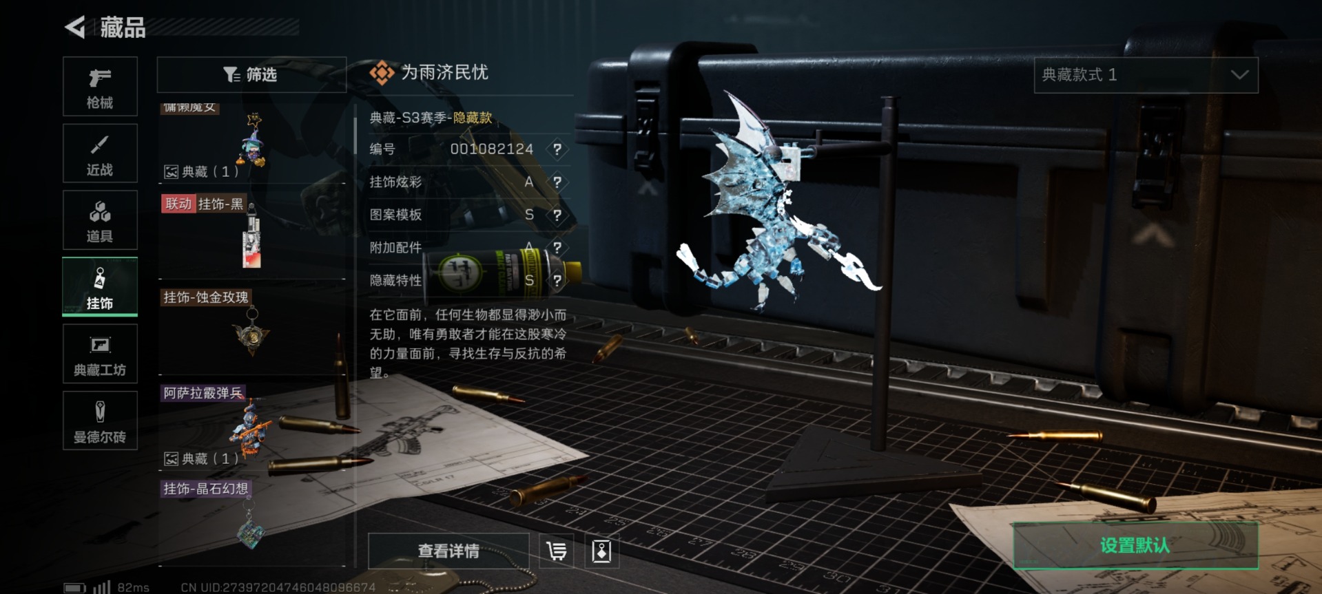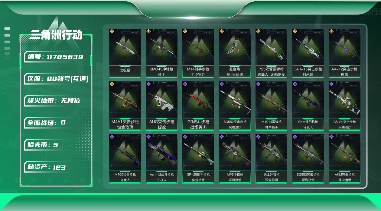 [11785639]总资产:123.6M 3干员外观 1近战传说 8传说枪械 哈夫币:5.476K 可二次 可修改实名 优质装备:近战-北极星 烽火地带段位:无段位 全面战场段位:无段位 传说武器皮肤:SMG45冲锋枪-骑士,M14射手步枪-工业审判,复合弓-黑-天际线,725双管霰弹枪-送葬人-无题密令,CAR-15突击步枪-阿米娅,AK-12突击步枪-夜鹰,M4A1突击步枪-蚀金玫瑰 史诗武器皮肤:AUG突击步枪-蝮蛇,G3战斗步枪-战场英杰,SG552突击步枪-尖端治疗,M1014霰弹枪-林中猎手,PKM通用机枪-守夜人,AS Val突击步枪-尖端治疗,M700狙击步枪-守夜人,Ash-12战斗步枪-守夜人,SR-25射手步枪-尖端治疗,MP5冲锋枪-深海恐惧,勇士冲锋枪-深海恐惧,SG552突击步枪-深海恐惧,AKM突击步枪-林中猎手,.357左轮-幸运时刻,M16A4突击步枪-竞赛选手,M250通用机枪-囚徒,SV-98狙击步枪-林中猎手,PTR-32突击步枪-英雄,AS Val突击步枪-典狱官,PSG-1射手步枪-无垢,SR-3M紧凑突击步枪-荒野求生,PKM通用机枪-荒野求生,QBZ95-1突击步枪-曙光,沙漠之鹰-曙光,Vector冲锋枪-阿萨拉文明,SVD狙击步枪-阿萨拉工艺,S12K霰弹枪-曙光,M14射手步枪-禁卫,PKM通用机枪-英雄,M700狙击步枪-竞技风,M14射手步枪-黑鹰坠落 干员外观:红狼-蚀金玫瑰,无名-夜鹰,露娜-黑·天际线1