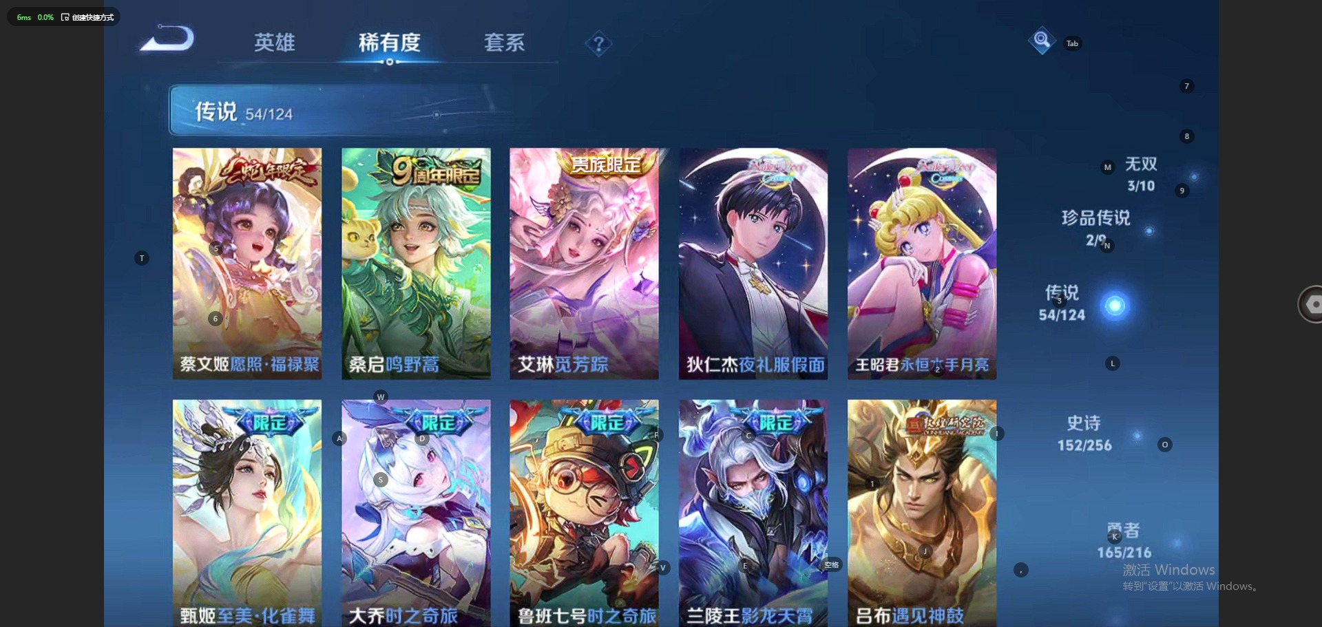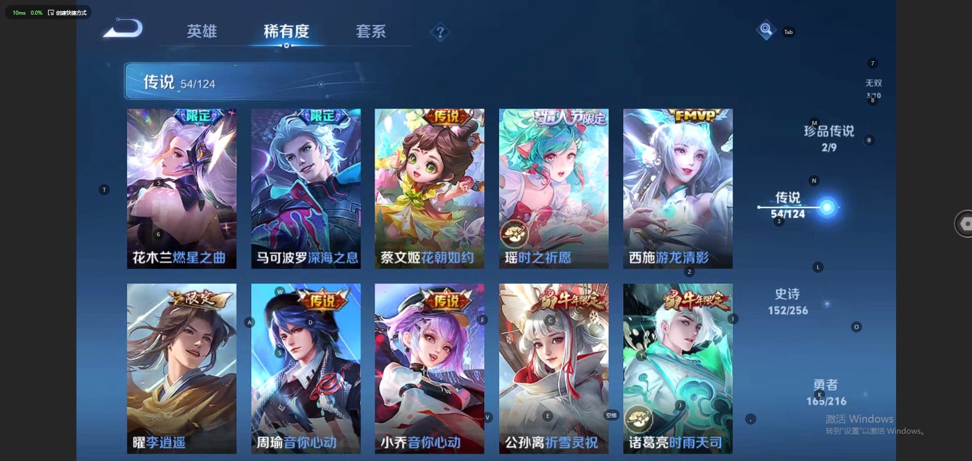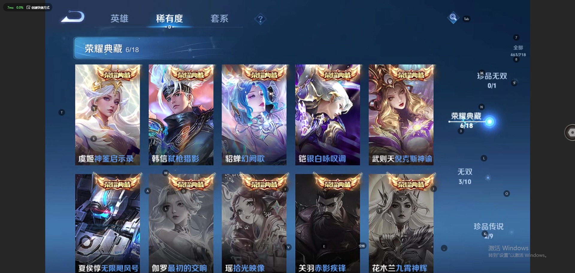 - PX_2082660-贵族等级: V7 英雄数: 122 皮肤数: 223 荣耀水晶: 天鹅之梦 珍品传说: 江户川柯南,怪盗基德,时之奇旅-孙策,器灵·落星盏,兔狲·蓬尾,酷洛米之心,大耳狗之梦 星传说: 金色仲夏夜,幻舞叠翠 传说皮: 云霓雀翎,仲夏夜之梦,游龙清影,浮生妄,妄想实况,牧神诗旅,幻光神枪,续相思,云诺千山 限定皮: 梁祝,五谷丰年,神器·万象笔,鸣野蒿,陌上桑,映山客,逐霄战戟