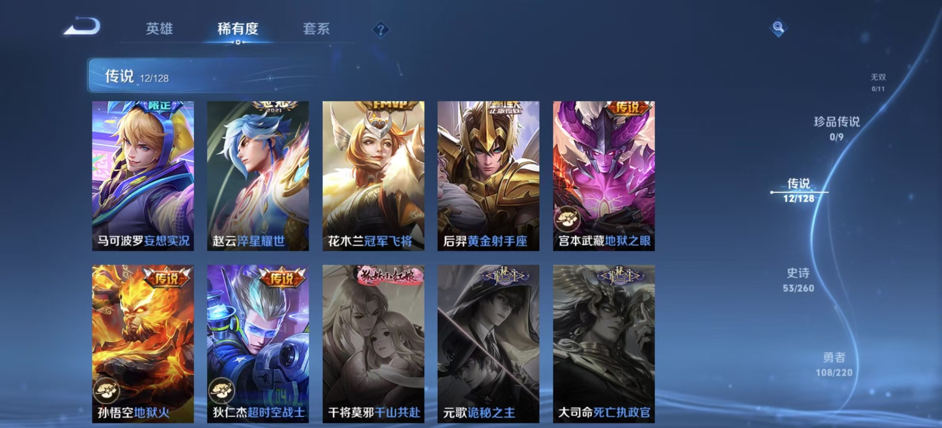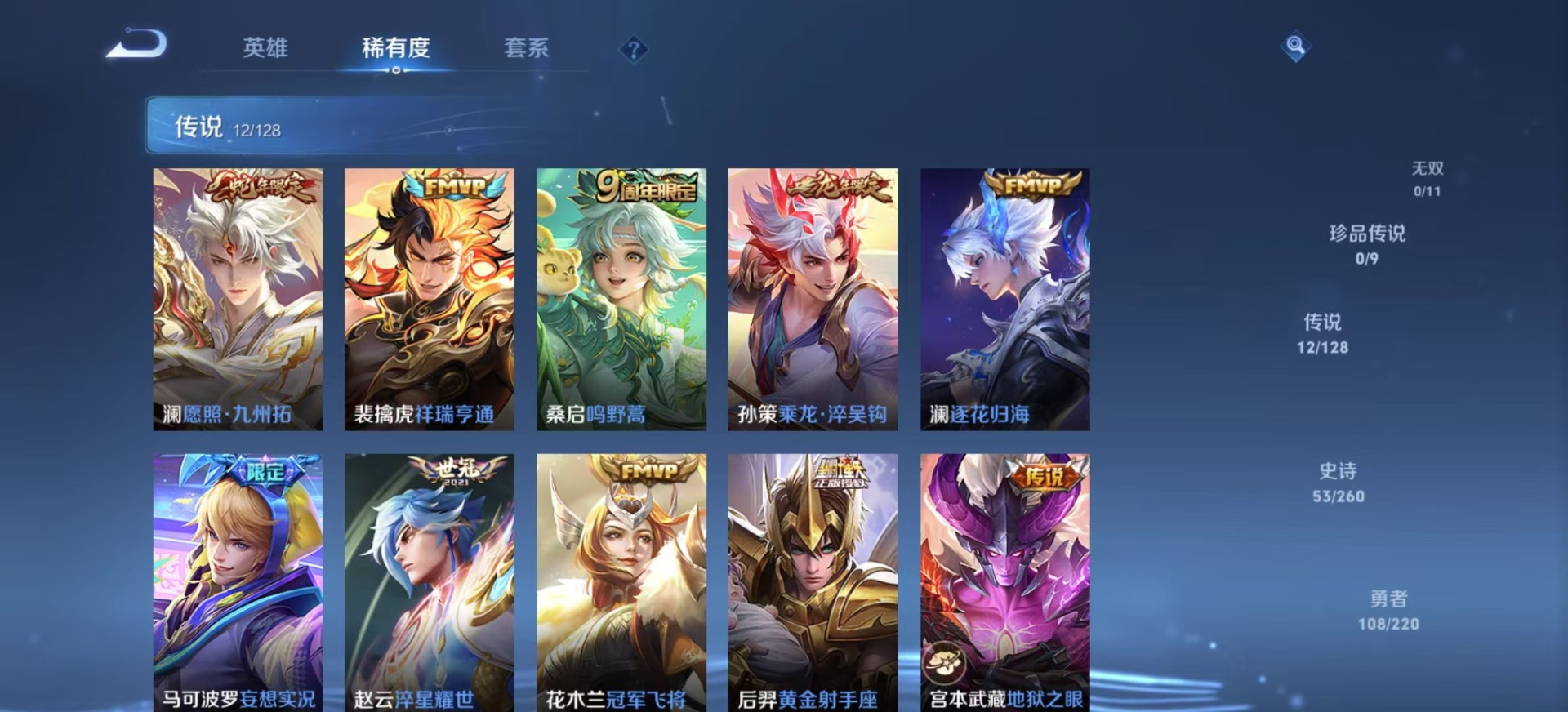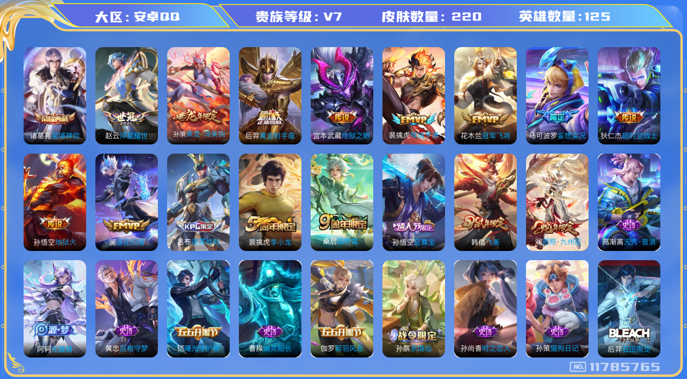 [11785765]V7 1典藏 12传说 125英雄 220皮肤 可修改实名 优质装备:星域神启(倪克斯贼亮),黄金射手座,冠军飞将,地狱火,地狱之眼,淬星耀世,超时空战士-狄仁杰,妄想实况,澜逐花归海,涂山容容 传说皮:乘龙·淬吴钩(孙策年限),祥瑞亨通 珍宝阁皮:妄想食味 限定皮:愿照·九州拓(澜年限),逐霄战戟,鸣野蒿,至尊宝,飞衡(韩信年限),李小龙 史诗皮:鸭鸭历险记-刘禅,器灵·浮梦炉,狼魂孤将,化蝶舞,星界战将,石田雨龙,茶境仙,破空之剑,蒙犽顽岩魄,蔬乡物语(鲁班七号),百相守梦-百里守约,星界特工,百相守梦-黄忠,遇见神鹿,千年之狐,江河有灵,冰冠公主,猫狗日记-孙策,时之恋人-孙尚香,修罗,水果甜心,天才门将,暗隐猎兽者,幽灵船长,鬼剑武藏,暗渊魔法,天秀·启明,繁星吟游(呼啦呼啦),逐浪之夏,水晶猎龙者,曙光守护者,箭羽风息,原初追逐者,圣诞狂欢,圣诞恋歌,鹰眼统帅,暗夜贵公子,魅力维加斯,天秀·音浪,无心,未来纪元-赵云