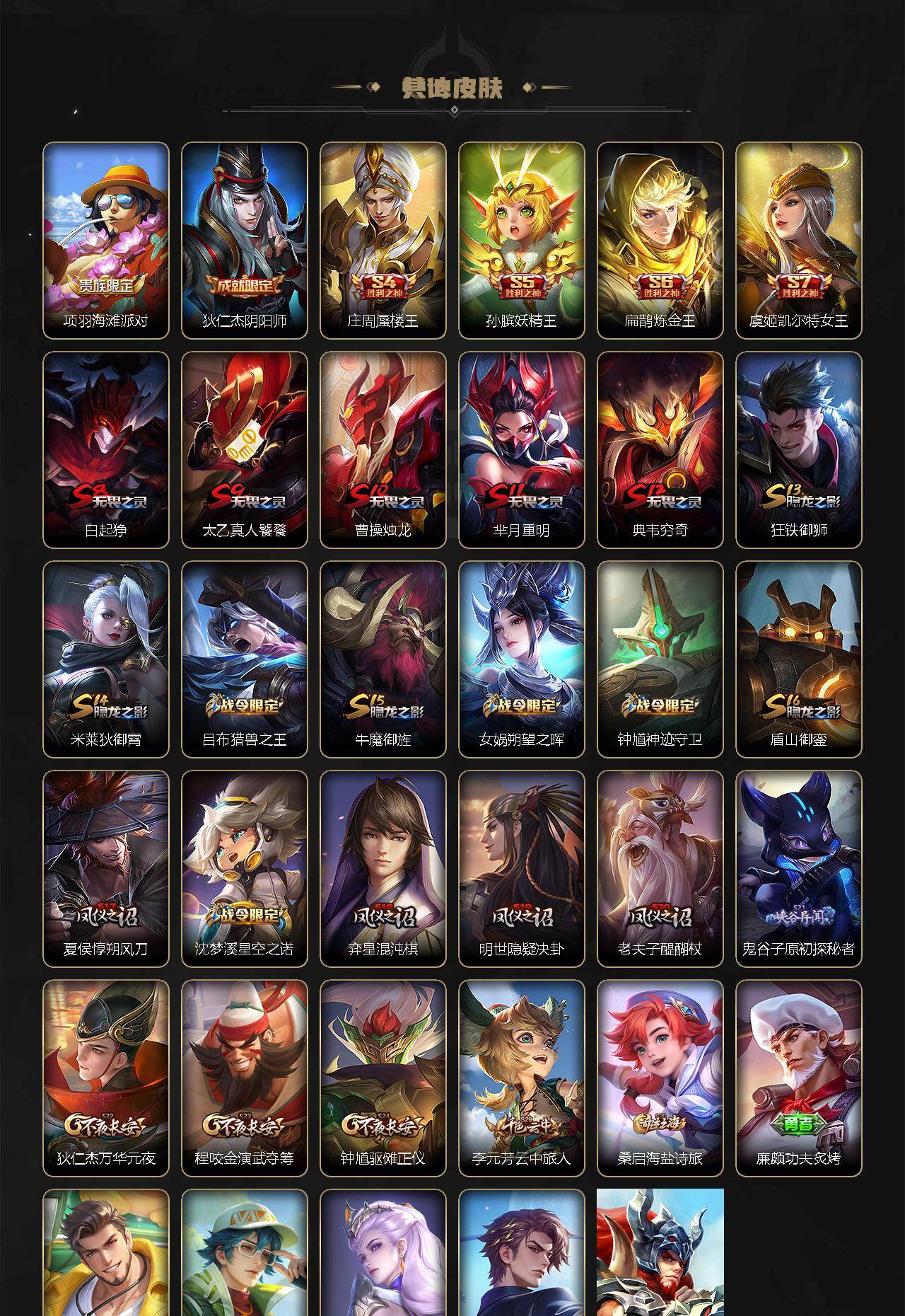 【限定皮肤】:白起狰,狄仁杰阴阳师,虞姬凯尔特女王,赵云皇家上将,妲己时之彼端,嬴政白昼王子,鲁班七号狮舞东方,庄周蜃楼王,孙膑妖精王,扁鹊炼金王,芈月重明,吕布猎兽之王,夏侯惇朔风刀,曹操烛龙,典韦穷奇,典韦蓝屏警告,狄仁杰魔术师,狄仁杰万华元夜,项羽海滩派对,老夫子圣诞老人,老夫子醍醐杖,程咬金演武夺筹,花木兰青春决赛季,牛魔御旌,李元芳银河之约,李元芳云中旅人,钟馗神迹守卫,钟馗驱傩正仪,杨玉环遇见飞天,女娲朔望之晖,哪吒逐梦之翼,太乙真人饕餮,鬼谷子原初探秘者,弈星混沌棋,沈梦溪星空之诺,明世隐疑决卦,狂铁御狮,米莱狄御霄,盾山御銮,上官婉儿梁祝,桑启海盐诗旅