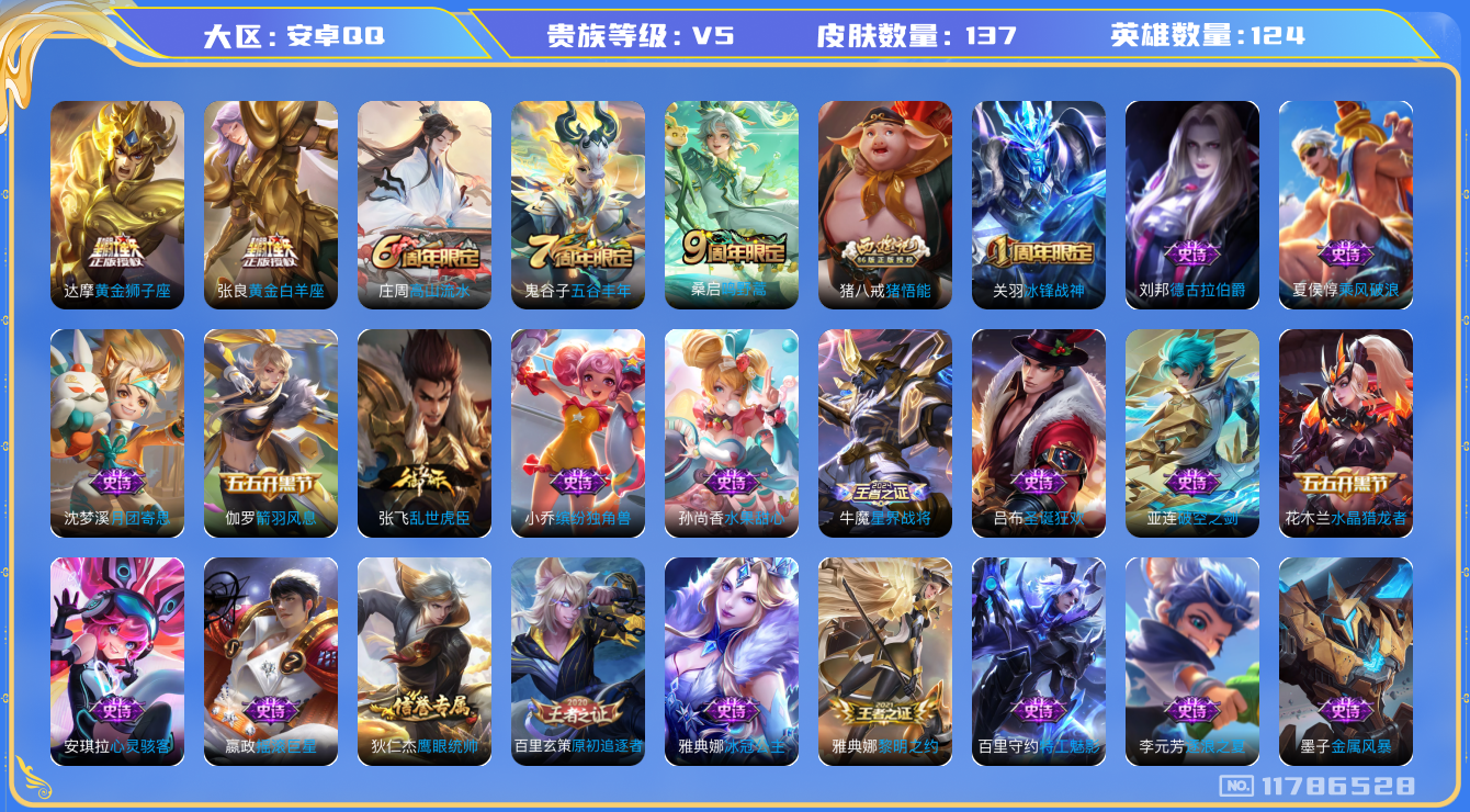 [11786528]V5 3传说 124英雄 137皮肤 可修改实名 优质装备:黄金狮子座,黄金白羊座 珍宝阁皮:优雅恋人 限定皮:鸣野蒿,高山流水,五谷丰年,冰锋战神,猪悟能 史诗皮:星界战将,破空之剑,特工魅影,冰冠公主,乱世虎臣,摇滚巨星,水果甜心,心灵骇客,德古拉伯爵,舞动绿茵,缤纷独角兽,乘风破浪,逐浪之夏,月团寄思,水晶猎龙者,箭羽风息,金属风暴,原初追逐者,圣诞狂欢,鹰眼统帅,魅力维加斯,黎明之约