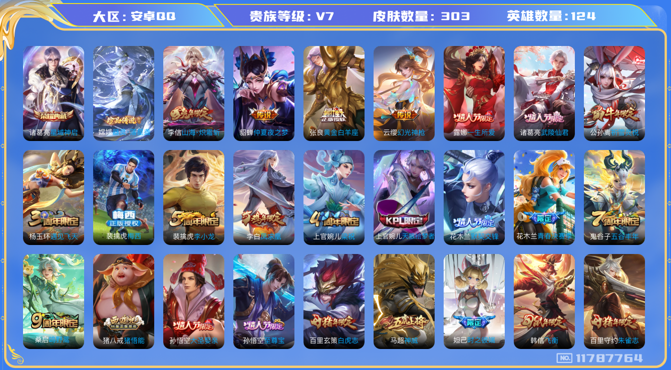 [11787764]V7 1典藏 1珍品传说 10传说 124英雄 303皮肤 可修改实名 优质装备:星域神启(倪克斯贼亮),器灵·落星盏,黄金白羊座,仲夏夜之梦(大飞蛾),山海·炽霜斩(李信年限),涂山容容 传说皮:幻光神枪 珍宝阁皮:胡桃夹子,万物之道,女武神 限定皮:鸣野蒿,至尊宝,白虎志(电光耗子),凤求凰(白切鸡),梅西,武陵仙君(小桃花),时之彼端,神威(电光马子),飞衡(韩信年限),遇见飞天,五谷丰年,武圣,梁祝,祈雪灵祝(雪兔子),天狼绘梦者,李小龙,朱雀志(守约年限),如梦令-嫦娥,默契交锋-花木兰,猪悟能,一生所爱,大圣娶亲,青春决赛季 史诗皮:星界战将,龙之律动,百相守梦-周瑜,琥珀纪元伽罗,百相守梦-黄忠,织梦人,苍穹之光,黄金分割率,永昼,江河有灵,蒙恬荣光圣徽,无限星赏官,冰冠公主,晚萤,电玩·爆裂旋风,龙骑士(小龙虾),末日机甲-吕布,猫狗日记-孙策,时之恋人-孙尚香,乱世虎臣,节奏热浪,修罗,女仆咖啡,摇滚巨星,水果甜心,绅士熊喵,天才门将,星夜王子,心灵骇客,功夫厨神,德古拉伯爵,暗隐猎兽者,幽灵船长,鬼剑武藏,心灵战警,舞动绿茵,地狱岩魂,纤云弄巧,繁星吟游(呼啦呼啦),拒霜思,缤纷独角兽,乘风破浪,逐浪之夏,月团寄思,水晶猎龙者,曙光守护者,箭羽风息,金属风暴,原初追逐者,圣诞狂欢,圣诞恋歌,鹰眼统帅,王者之锤,暗夜贵公子,魅力维加斯,黎明之约,赏金猎手,无心