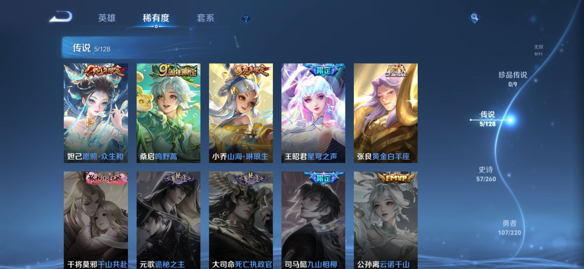 - [11554174]V7 1典藏 4传说 124英雄 194皮肤 可修改实名 优质装备:鸣剑·曳影,仲夏夜之梦(大飞蛾),涂山容容 珍宝阁皮:蔷薇恋人 限定皮:愿照·岁时盈(虞姬年限),鸣野蒿,至尊宝,飞衡(韩信年限),遇见飞天,梁祝,天狼绘梦者,李小龙,霸王别姬-项羽,霸王别姬-虞姬,大圣娶亲,天魔缭乱,蜜橘之夏 史诗皮:星界战将,龙之律动,紫霞仙子,黄金分割率,特工魅影,千年之狐,偶像歌手,龙骑士(小龙虾),乱世虎臣,节奏热浪,修罗,水果甜心,星夜王子,功夫厨神,暗隐猎兽者,鬼剑武藏,纤云弄巧,繁星吟游(呼啦呼啦),乘风破浪,逐浪之夏,水晶猎龙者,曙光守护者,原初追逐者,圣诞狂欢,鹰眼统帅,魅力维加斯,黎明之约,未来纪元-赵云