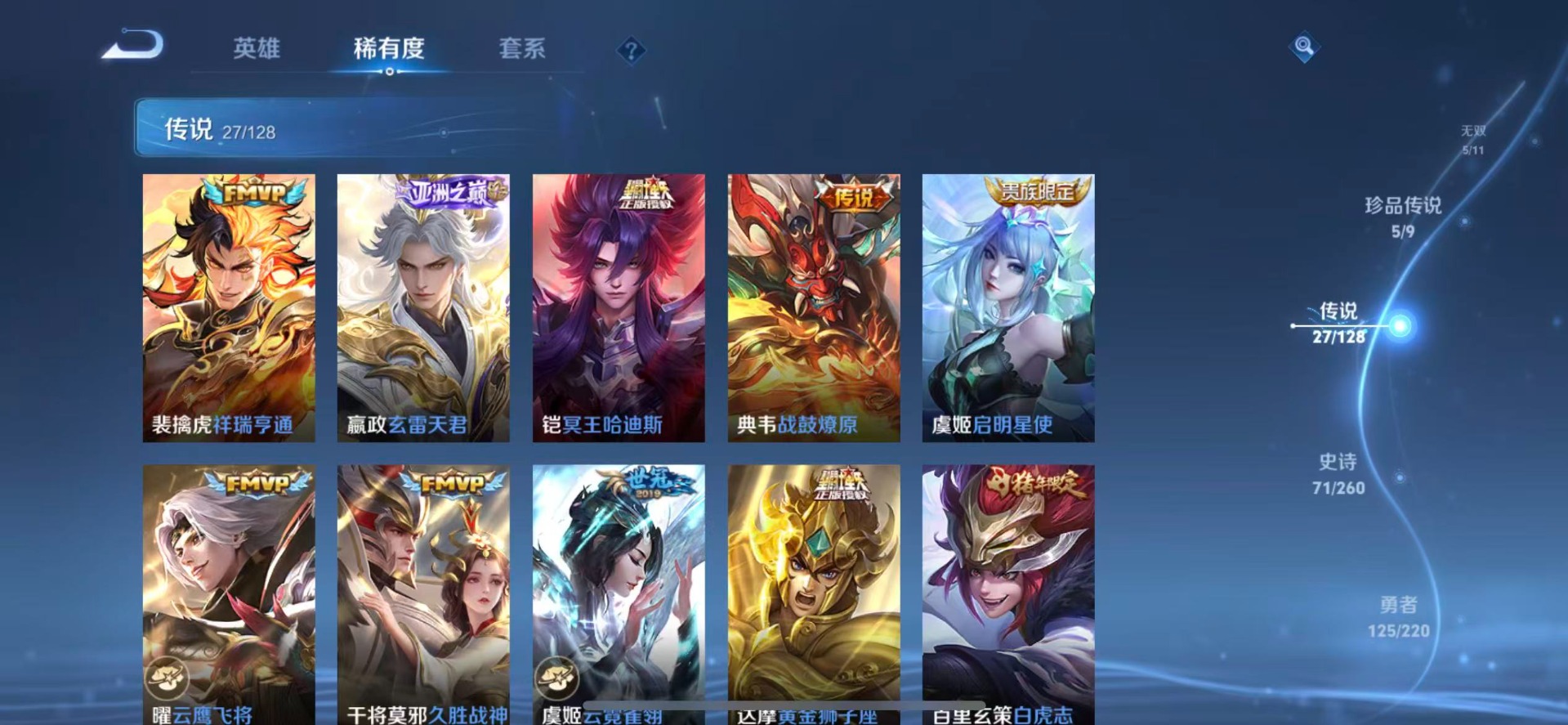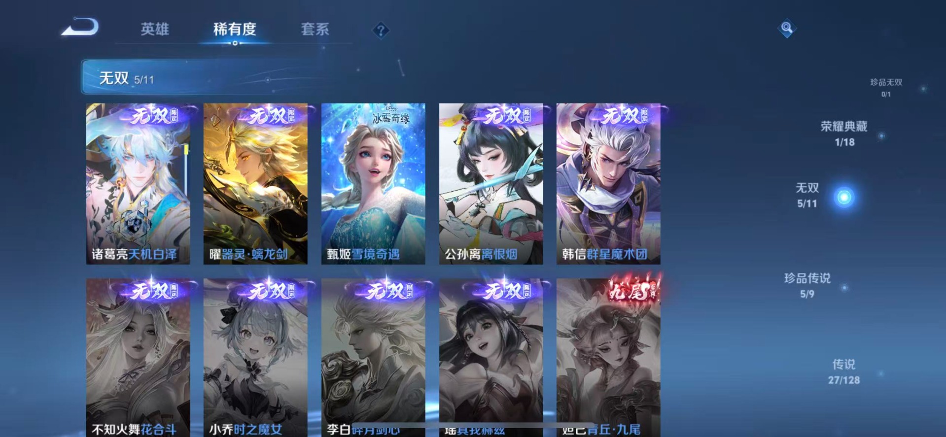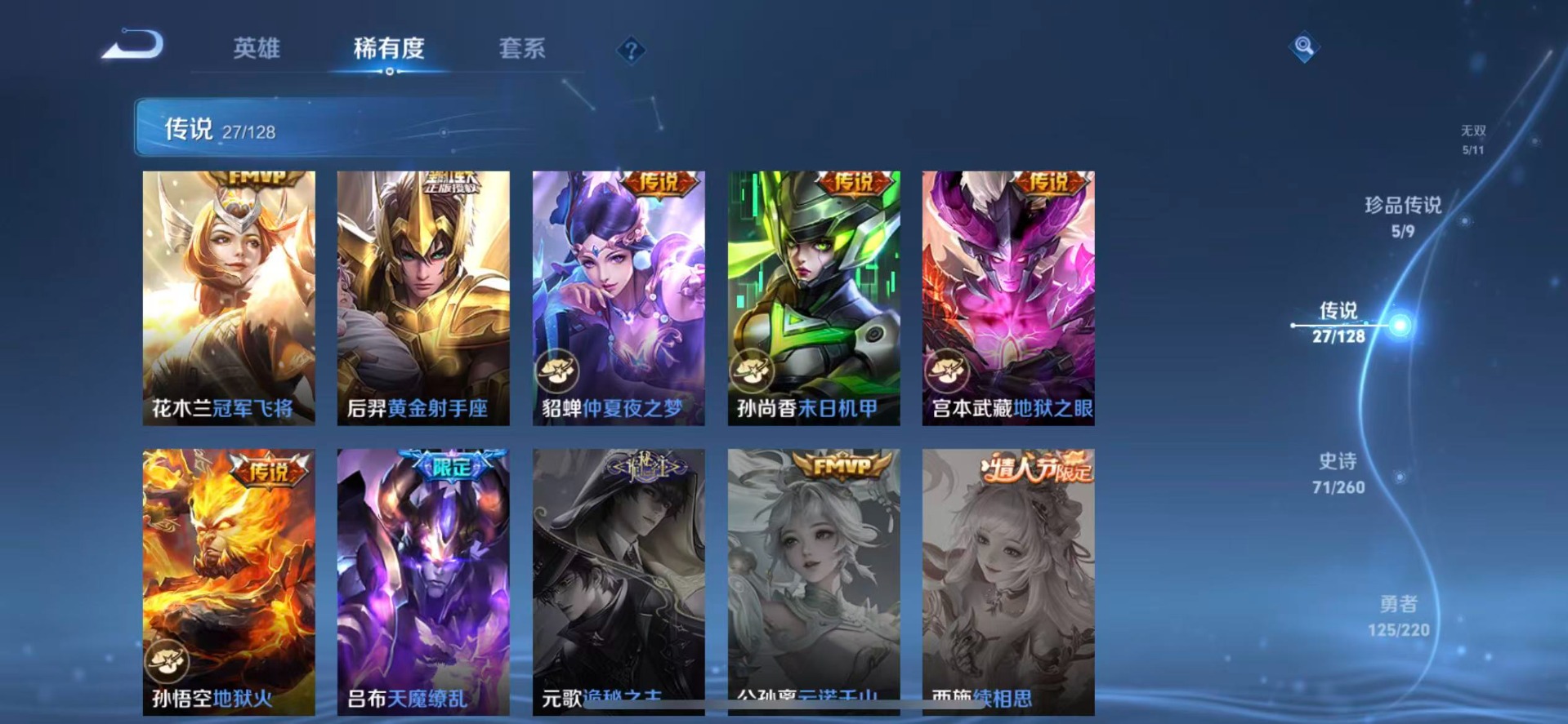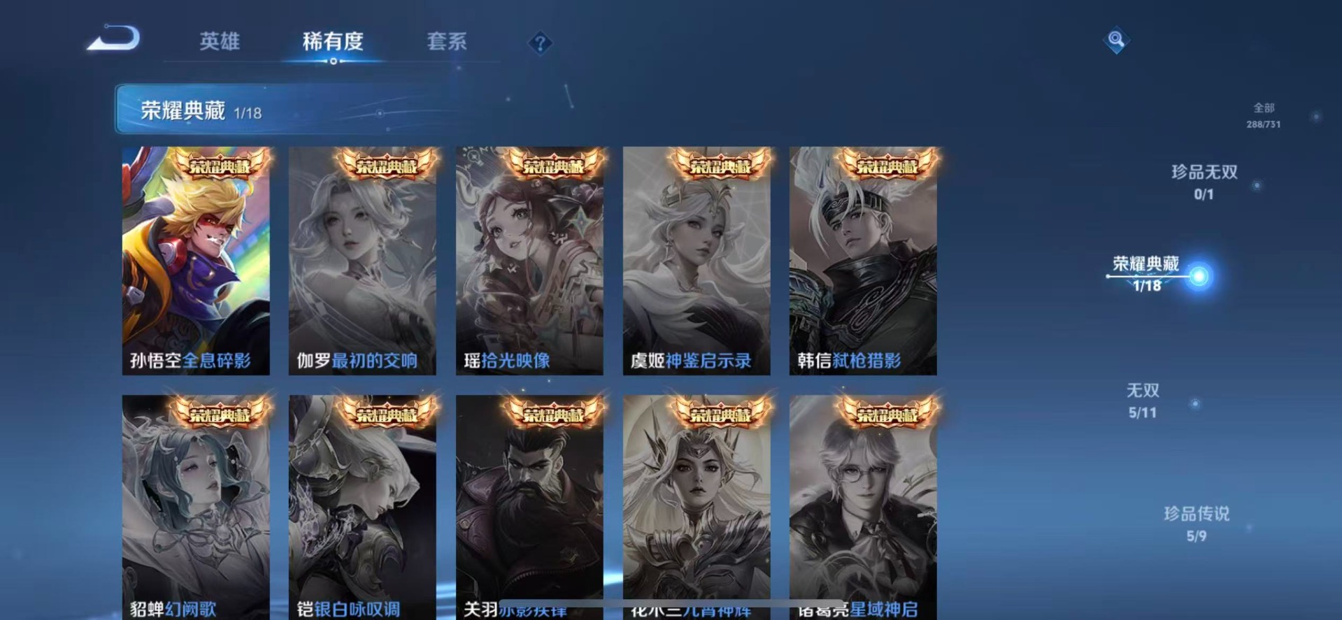 赵云龙胆,露娜一生所爱,司空震愿照·山河定,裴擒虎李小龙,上官婉儿梁祝,花木兰青春决赛季,女娲愿照·千秋盛,孙悟空大圣娶亲,孙悟空至尊宝,百里玄策白虎志,马超神威,盘古冰霜神祇,妲己愿照·众生和,蔡文姬愿照·福禄聚,澜愿照·九州拓,虞姬愿照·岁时盈,关羽冰锋战神