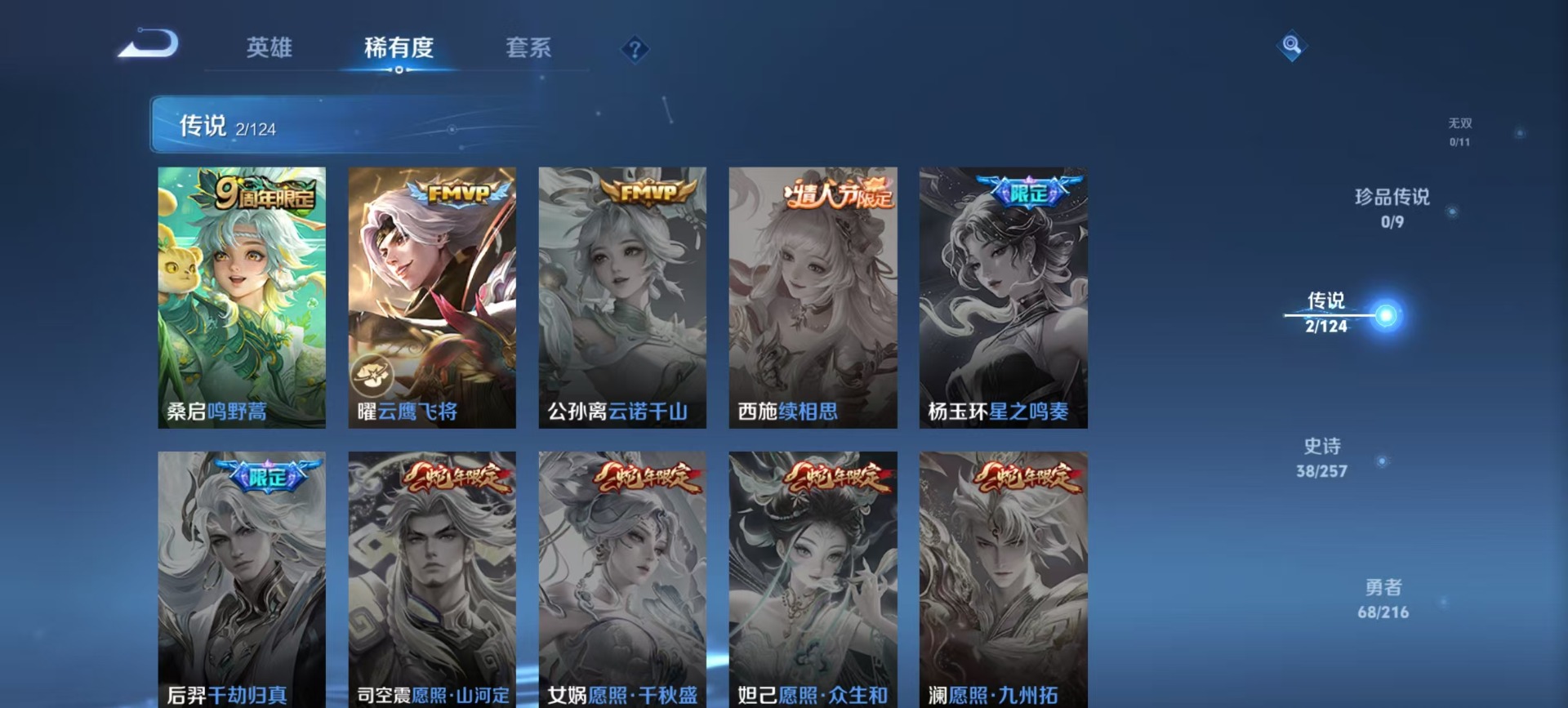 宫本武藏鬼剑武藏,高渐离燃音魔法,兰陵王暗隐猎兽者,刘邦德古拉伯爵,貂蝉圣诞恋歌,夏侯惇乘风破浪,李白谪仙醉月,花木兰水晶猎龙者,蒙犽百解令,白起星夜王子,廉颇地狱岩魂,嬴政摇滚巨星,孙尚香时之恋人,孙策猫狗日记,墨子金属风暴,吕布圣诞狂欢,露娜紫霞仙子,吕布末日机甲,澜赏金猎手,弈星滕王阁序,嫦娥拒霜思,刘禅绅士熊喵
