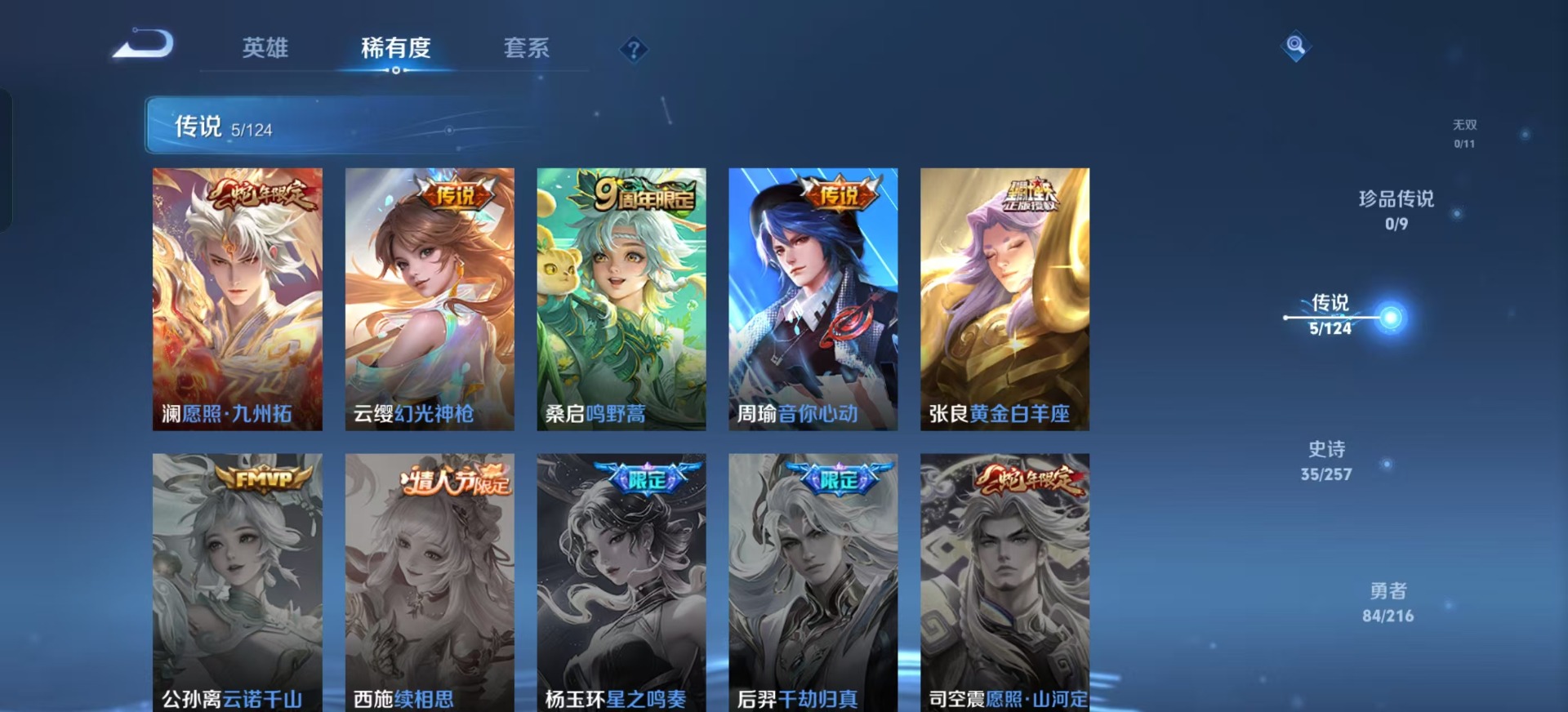 - [12295984]V9 3典藏 2珍品传说 23传说 125英雄 348皮肤 典藏英雄武则天 可修改实名 优质装备:鸣剑·曳影,全息碎影(猴子典藏),星域神启(倪克斯贼亮),黄金狮子座,黄金白羊座,猫影幻舞,久胜战神,末日机甲-孙尚香(绿蚂蚱),地狱火,仲夏夜之梦(大飞蛾),海洋之心,地狱之眼,李逍遥,超时空战士-狄仁杰,末日机甲-孙策,挚爱之约,碎云,涂山容容 珍品传说:时之奇旅-孙策,兔狲·蓬尾 传说皮:典韦战鼓燎原 珍宝阁皮:妄想食味,优雅恋人,蔷薇恋人 限定皮:愿照·岁时盈(虞姬年限),鸣野蒿,至尊宝,白虎志(电光耗子),凤求凰(白切鸡),武陵仙君(小桃花),傲雪梅枪,魔法小厨娘,飞衡(韩信年限),遇见飞天,高山流水,降魔,五谷丰年,冰锋战神,梁祝,天狼征服者,李小龙,逐梦之影,朱雀志(守约年限),辉光之辰,如梦令-后羿,圣诞老人,真爱至上,猪悟能,大圣娶亲,引擎之心,天魔缭乱,蜜橘之夏,深海之息(深海大菠萝),神器·万象笔 史诗皮:鸭鸭历险记-刘禅,器灵·浮梦炉,化蝶舞,星界战将,龙之律动,小牛鸭,石田雨龙,茶境仙,破空之剑,遇见神鹿,紫霞仙子,电玩小子(小书包),黄金分割率,特工魅影,千年之狐,永昼,江河有灵,魅语,百解令(蒙犽),蒙恬荣光圣徽,无限星赏官,青蛇,偶像歌手,白蛇,晚萤,暗夜猫娘,银翎春语,龙骑士(小龙虾),末日机甲-吕布,猫狗日记-孙策,猫狗日记-大乔,乱世虎臣,节奏热浪,修罗,女仆咖啡,摇滚巨星,水果甜心,绅士熊喵,天才门将,星夜王子,心灵骇客,功夫厨神,德古拉伯爵,暗隐猎兽者,幽灵船长,鬼剑武藏,暗渊魔法,心灵战警,乐园奇幻夜,天秀·启明,舞动绿茵,地狱岩魂,诗语江南,纤云弄巧,繁星吟游(呼啦呼啦),拒霜思,缤纷独角兽,乘风破浪,逐浪之夏,水晶猎龙者,曙光守护者,箭羽风息,金属风暴,原初追逐者,圣诞狂欢,圣诞恋歌,鹰眼统帅,魅力维加斯,黎明之约,未来纪元-赵云