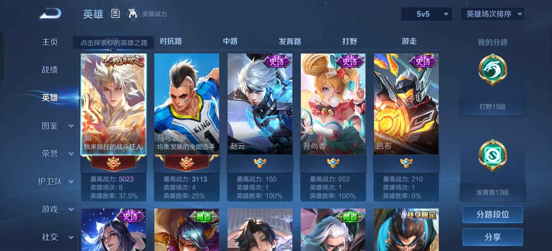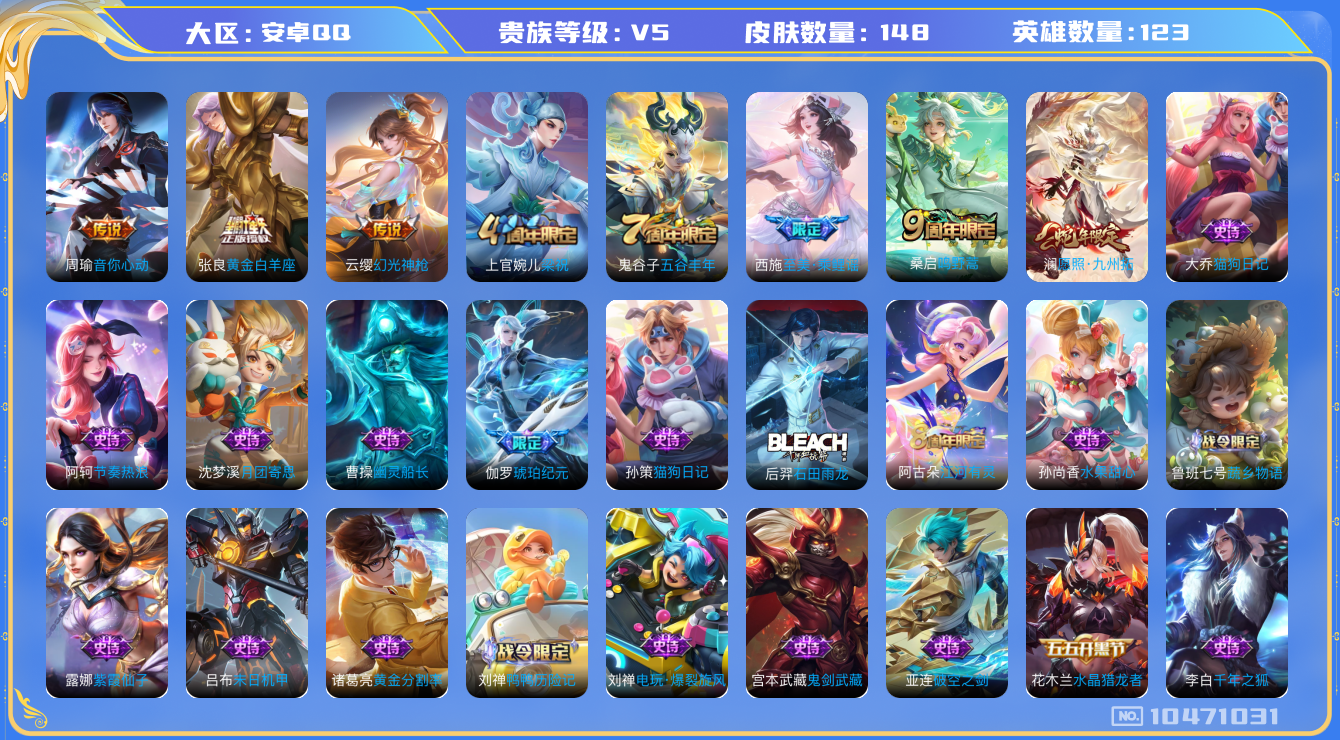 [10471031]V5 5传说 123英雄 148皮肤 可修改实名 优质装备:黄金白羊座,音你心动-周瑜 传说皮:幻光神枪 珍宝阁皮:妄想食味 限定皮:愿照·九州拓(澜年限),鸣野蒿,至美·乘鲤谣,五谷丰年,梁祝 史诗皮:鸭鸭历险记-刘禅,龙之律动,石田雨龙,破空之剑,琥珀纪元伽罗,蔬乡物语(鲁班七号),紫霞仙子,黄金分割率,千年之狐,江河有灵,百解令(蒙犽),偶像歌手,电玩·爆裂旋风,末日机甲-吕布,猫狗日记-孙策,猫狗日记-大乔,节奏热浪,水果甜心,幽灵船长,鬼剑武藏,舞动绿茵,纤云弄巧,逐浪之夏,月团寄思,水晶猎龙者,金属风暴,鹰眼统帅,未来纪元-赵云1