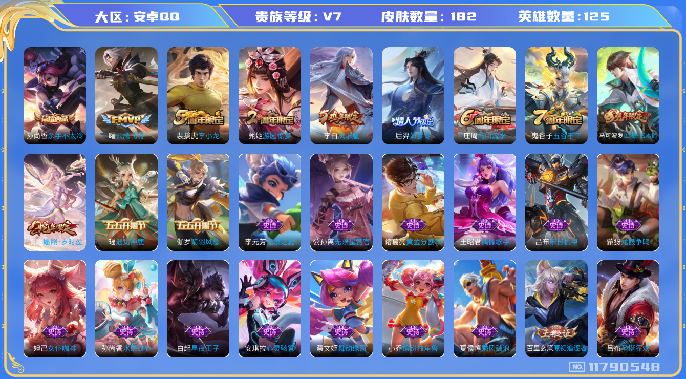 [11790548]【商品标题】:安卓Q-V7-永恒钻石I段位-125英雄-182皮肤-1典藏-0珍品无双-0无双-0珍品传说-3传说-51史诗