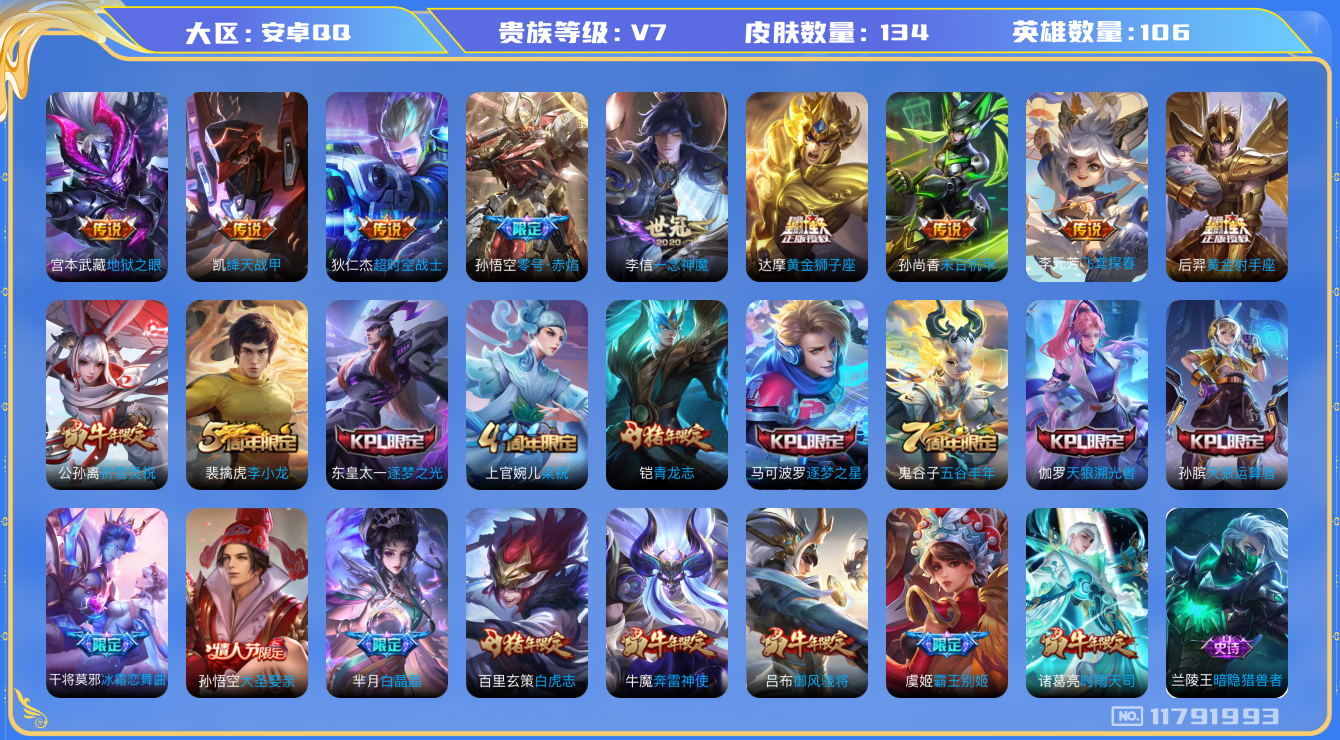 [11791993]V7 12传说 106英雄 134皮肤 可修改实名 优质装备:黄金狮子座,黄金射手座,绛天战甲(鸡嘴战神),一念神魔,末日机甲-孙尚香(绿蚂蚱),零号·赤焰,地狱之眼,飞鸢探春,超时空战士-狄仁杰 珍宝阁皮:女武神 限定皮:白虎志(电光耗子),白晶晶,时雨天司(水龙头),五谷丰年,青龙志(铠年限),天狼运算者,梁祝,御风骁将(吕布年限),逐梦之星,天狼溯光者,奔雷神使(牛魔年限),祈雪灵祝(雪兔子),李小龙,逐梦之光,霸王别姬-虞姬,大圣娶亲,冰霜恋舞曲 史诗皮:冰冠公主,晚萤,修罗,天才门将,德古拉伯爵,暗隐猎兽者,幽灵船长,纤云弄巧,繁星吟游(呼啦呼啦),逐浪之夏,鹰眼统帅