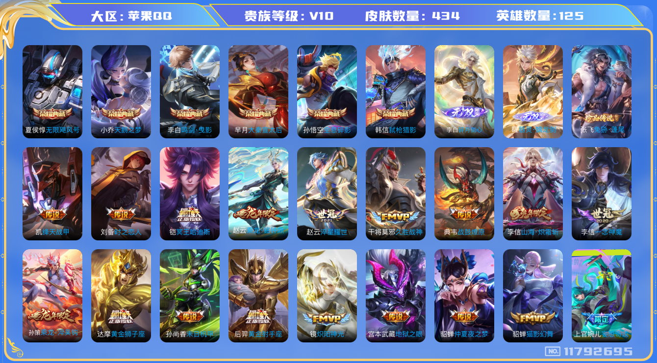[11792695]V10 6典藏 2无双 1珍品传说 44传说 125英雄 434皮肤 可修改实名 优质装备:天鹅之梦(小乔典藏),无限飓风号(高达),大秦宣太后,鸣剑·曳影,全息碎影(猴子典藏),弑枪猎影(韩信典藏),碎月剑心(李白无双),器灵·螭龙剑,黄金狮子座,黄金射手座,绛天战甲(鸡嘴战神),黄金白羊座,猫影幻舞,久胜战神,炽阳神光,一念神魔,云霓雀翎,末日机甲-孙尚香(绿蚂蚱),地狱火,仲夏夜之梦(大飞蛾),地狱之眼,胖达荣荣,时之恋人-刘备(电焊工),淬星耀世,超时空战士-狄仁杰,山海·炽霜斩(李信年限),山海·苍雷引(电光曜子),妄想奇谈,澜逐花归海,艾琳觅芳踪,涂山容容 珍品传说:兔狲·蓬尾 传说皮:乘龙·铭钟鼎(赵云年限),乘龙·淬吴钩(孙策年限),典韦战鼓燎原,铠冥王哈迪斯 珍宝阁皮:妄想食味,女武神,玩趣恶龙 限定皮:愿照·山河定(司空震年限),愿照·众生和(妲己年限),愿照·千秋盛(女娲年限),逐霄战戟,鸣野蒿,至尊宝,凤求凰(白切鸡),凤凰于飞,太华(伽罗年限),异界灵契(白毛香),傲雪梅枪,绯月行,时雨天司(水龙头),神威(电光马子),飞衡(韩信年限),玄嵩(庄周年限),遇见飞天,高山流水,诗剑行,齐天大圣,五谷丰年,冰锋战神,武圣,天狼运算者,游园惊梦,梁祝,御风骁将(吕布年限),天狼狩猎者,龙胆,逐梦之星,烈魂,岱宗(典韦年限),奔雷神使(牛魔年限),祈雪灵祝(雪兔子),李小龙,朱雀志(守约年限),永曜之星,如梦令-嫦娥,如梦令-后羿,圣诞老人,默契交锋-兰陵王,默契交锋-花木兰,引擎之心,冰霜恋舞曲,寅虎·御盾(廉颇年限),寅虎·心曲(虎婆),寅虎·赤拳(老虎年限),深海之息(深海大菠萝),山海·玄木吟(马可年限) 史诗皮:鸭鸭历险记-刘禅,器灵·浮梦炉,狼魂孤将,化蝶舞,灵蛊蚀心,星界战将,龙之律动,雪豹·霜爪,石田雨龙,茶境仙,埋骨钱,海诺心动手记,蔬乡物语(鲁班七号),百相守梦-黄忠,遇见神鹿,紫霞仙子,苍穹之光,电玩小子(小书包),白龙吟,黄金分割率,特工魅影,千年之狐,永昼,江河有灵,雪夜绮愿(周瑜),完美假期,魅语,高渐离燃音魔法,蒙恬荣光圣徽,无限星赏官,冰冠公主,青蛇,偶像歌手,晚萤,暗夜猫娘,百相守梦(关羽),龙骑士(小龙虾),末日机甲-吕布,猫狗日记-孙策,猫狗日记-大乔,乱世虎臣,节奏热浪,修罗,女仆咖啡,摇滚巨星,水果甜心
