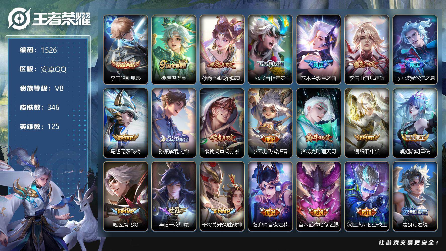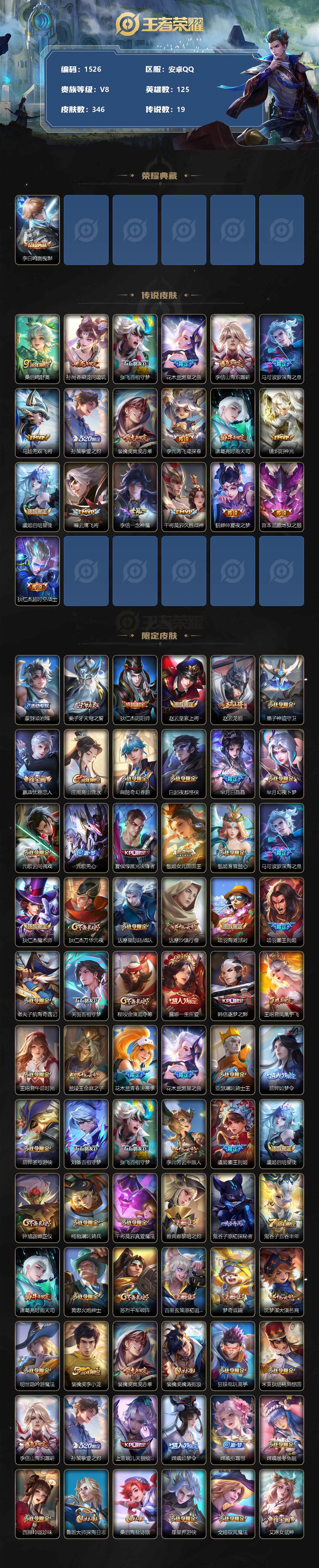 [11792993]【商品标题】:安卓Q-V8-最强王者段位-125英雄-346皮肤-1典藏-0珍品无双-0无双-0珍品传说-19传说-100史诗