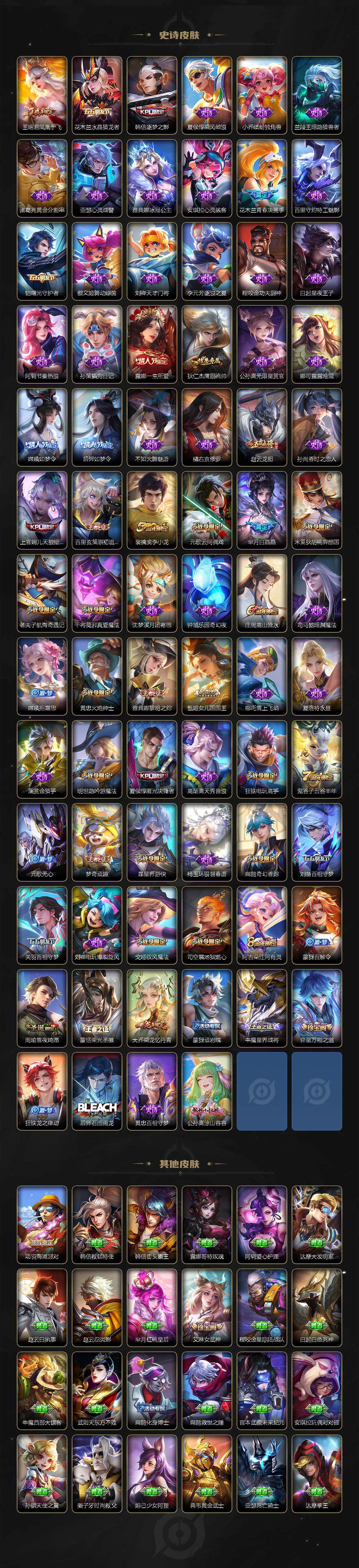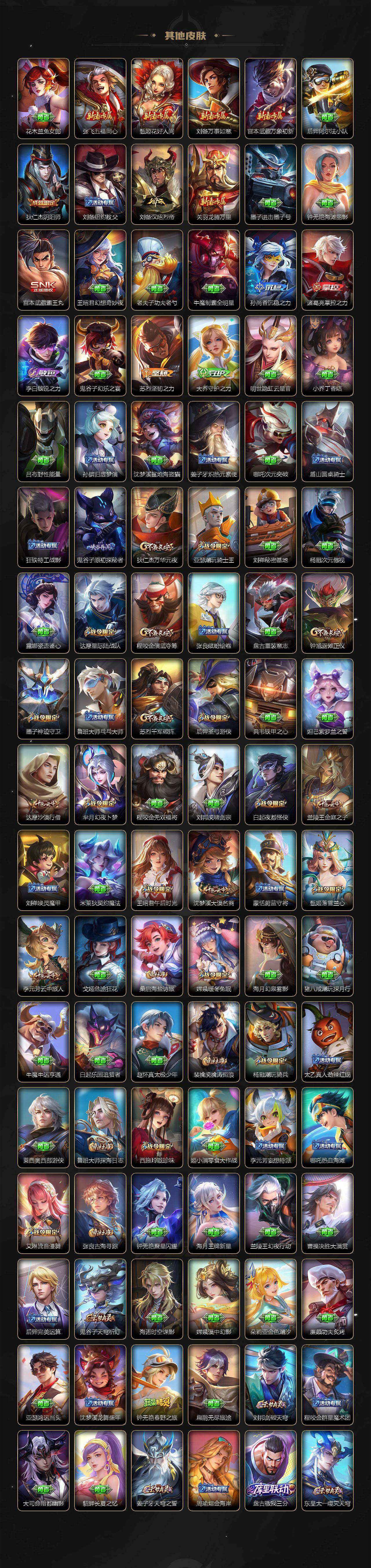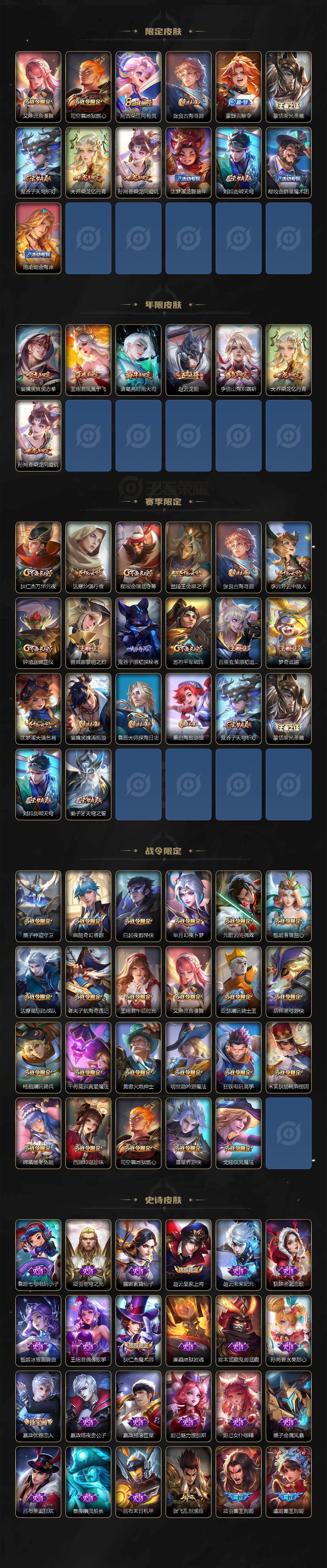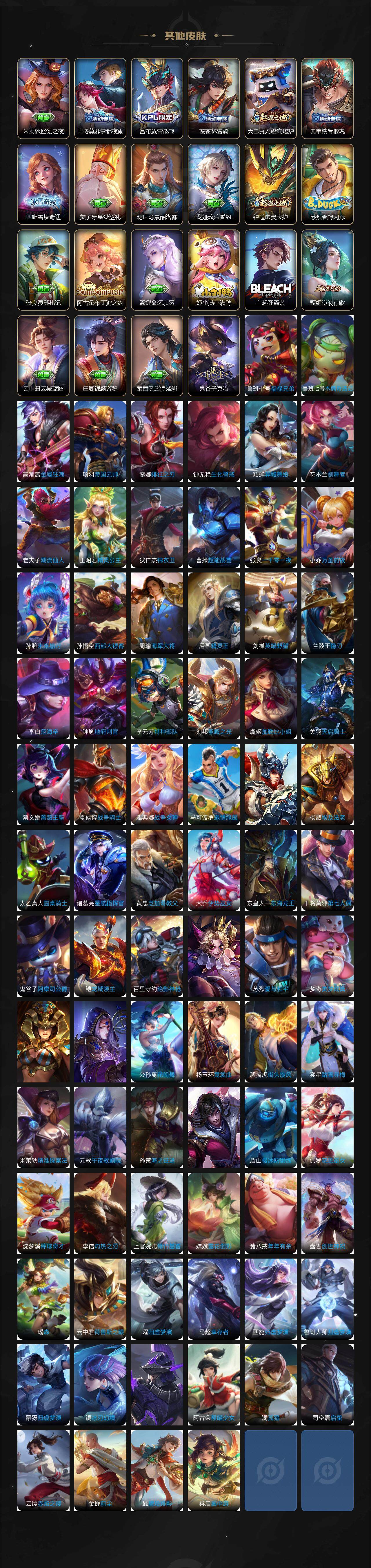 【限定皮肤】:蒙犽顽岩魄,姜子牙天穹之誓,狄仁杰阴阳师,赵云皇家上将,赵云龙胆,墨子神迹守卫,嬴政优雅恋人,庄周高山流水,扁鹊奇幻香踪,白起夜都怪侠,芈月白晶晶,芈月幻夜卜梦,元歌云间偶戏,元歌无心,夏侯惇匿光决锋者,甄姬女儿国国王,甄姬落雪兰心,马可波罗深海之息,狄仁杰魔术师,狄仁杰万华元夜,达摩星际陆战队,达摩沙漠行僧,项羽海滩派对,项羽霸王别姬,老夫子航海奇遇记,关羽百相守梦,程咬金演武夺筹,露娜一生所爱,韩信逐梦之影,王昭君凤凰于飞,王昭君午后时光,兰陵王金庭之子,花木兰青春决赛季,花木兰燃星之曲,亚瑟潮玩骑士王,后羿如梦令,后羿圣弓游侠,刘备百相守梦,张飞百相守梦,李元芳云中旅人,虞姬霸王别姬,虞姬启明星使,钟馗驱傩正仪,杨戬潮玩骑兵,干将莫邪真爱魔法,雅典娜黎明之约,鬼谷子原初探秘者,鬼谷子五谷丰年,诸葛亮时雨天司,黄忠火炮绅士,苏烈千军破阵,百里玄策原初追逐者,梦奇顽趣,沈梦溪大漠名商,明世隐吟游魔法,裴擒虎李小龙,裴擒虎寅虎赤拳,裴擒虎擒涛扼浪,狂铁电玩高手,米莱狄胡桃异想国,李信山海炽霜斩,孙策挚爱之约,上官婉儿天狼绘梦者,嫦娥如梦令,嫦娥拒霜思,嫦娥暖冬兔眠,西施玲珑珍味,鲁班大师探海日志,桑启海盐诗旅,暃星界游侠,戈娅驭风魔法,艾琳女武神,艾琳流音漫舞,司空震地狱燃心,阿古朵江河有灵,张良古海寻踪,蒙犽百解令,蒙恬荣光圣徽,鬼谷子天穹祈灯,大乔乘龙忆丹青,孙尚香乘龙问璇玑,沈梦溪龙舞盛年,刘邦剑破天穹,程咬金群星魔术团,周瑜熔金海岸
