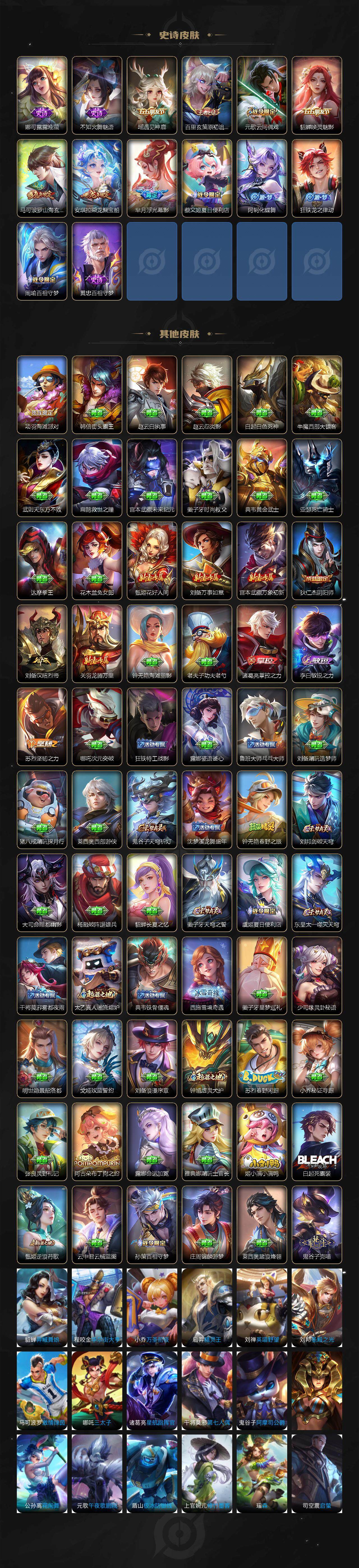 【史诗皮肤】:赵云皇家上将,貂蝉圣诞恋歌,王昭君偶像歌手,狄仁杰魔术师,廉颇地狱岩魂,宫本武藏鬼剑武藏,孙尚香水果甜心,妲己魅力维加斯,墨子龙骑士,貂蝉逐梦之音,孙悟空至尊宝,花木兰水晶猎龙者,刘邦德古拉伯爵,兰陵王暗隐猎兽者,诸葛亮黄金分割率,雅典娜冰冠公主,安琪拉心灵骇客,百里守约特工魅影,刘禅天才门将,李元芳逐浪之夏,白起星夜王子,阿轲节奏热浪,大乔猫狗日记,狄仁杰鹰眼统帅,娜可露露晚萤,不知火舞魅语,瑶遇见神鹿,百里玄策原初追逐者,元歌云间偶戏,貂蝉唤灵魅影,马可波罗山海玄木吟,安琪拉乘龙聚宝船,芈月浮光幕影,蔡文姬夏日便利店,阿轲化蝶舞,狂铁龙之律动,周瑜百相守梦,黄忠百相守梦