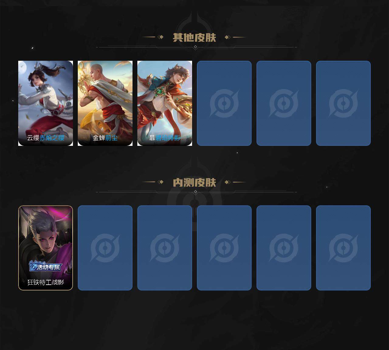 【其他皮肤】:项羽海滩派对,韩信街头霸王,赵云白执事,赵云忍炎影,白起白色死神,牛魔西部大镖客,武则天东方不败,扁鹊救世之瞳,宫本武藏未来纪元,姜子牙时尚教父,典韦黄金武士,亚瑟死亡骑士,达摩拳王,花木兰兔女郎,甄姬花好人间,刘备万事如意,宫本武藏万象初新,狄仁杰阴阳师,刘备汉昭烈帝,关羽龙腾万里,钟无艳海滩丽影,老夫子功夫老勺,诸葛亮掌控之力,李白敏锐之力
