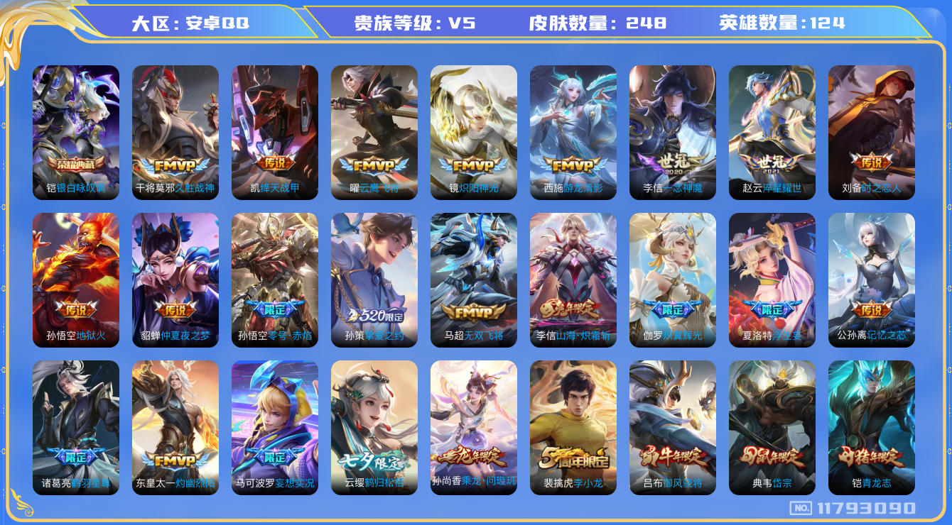 [11793090]【商品标题】:安卓Q-V5-尊贵铂金I段位-124英雄-248皮肤-1典藏-0珍品无双-0无双-0珍品传说-31传说-75史诗