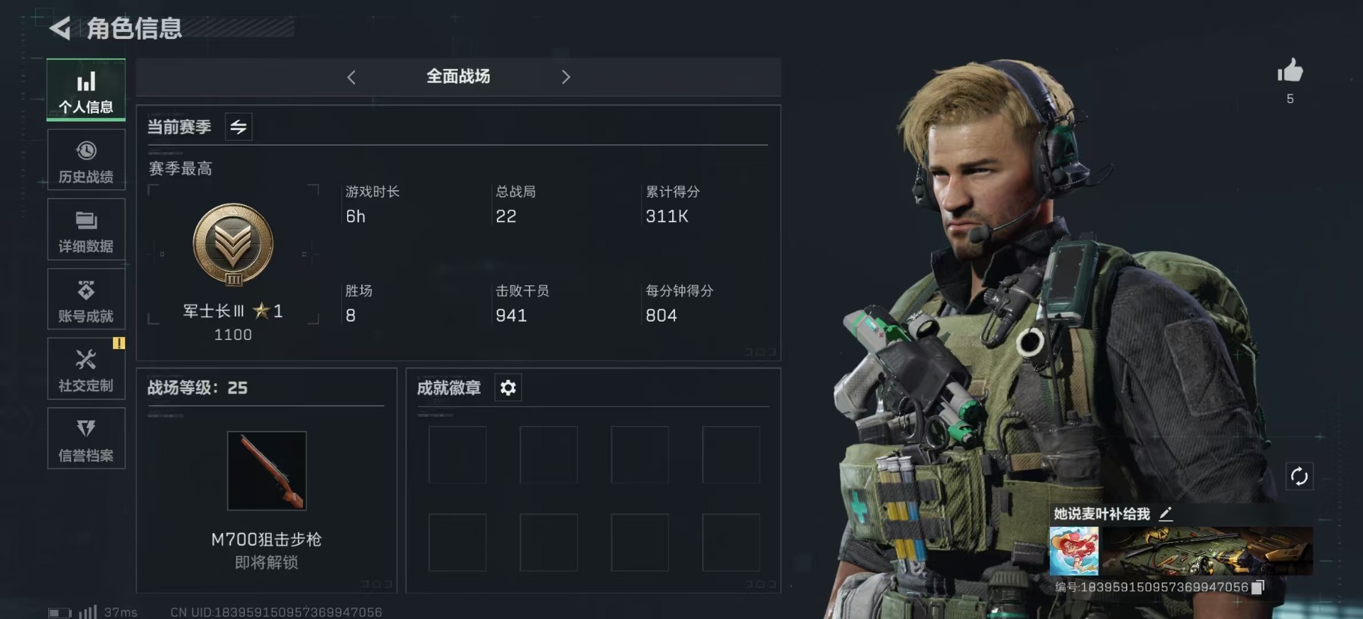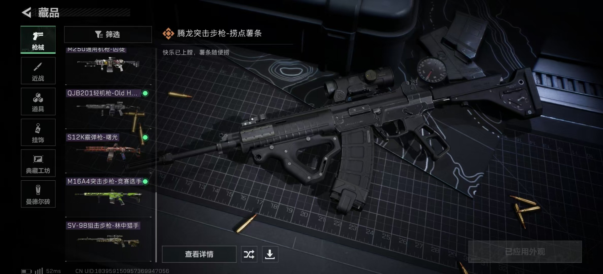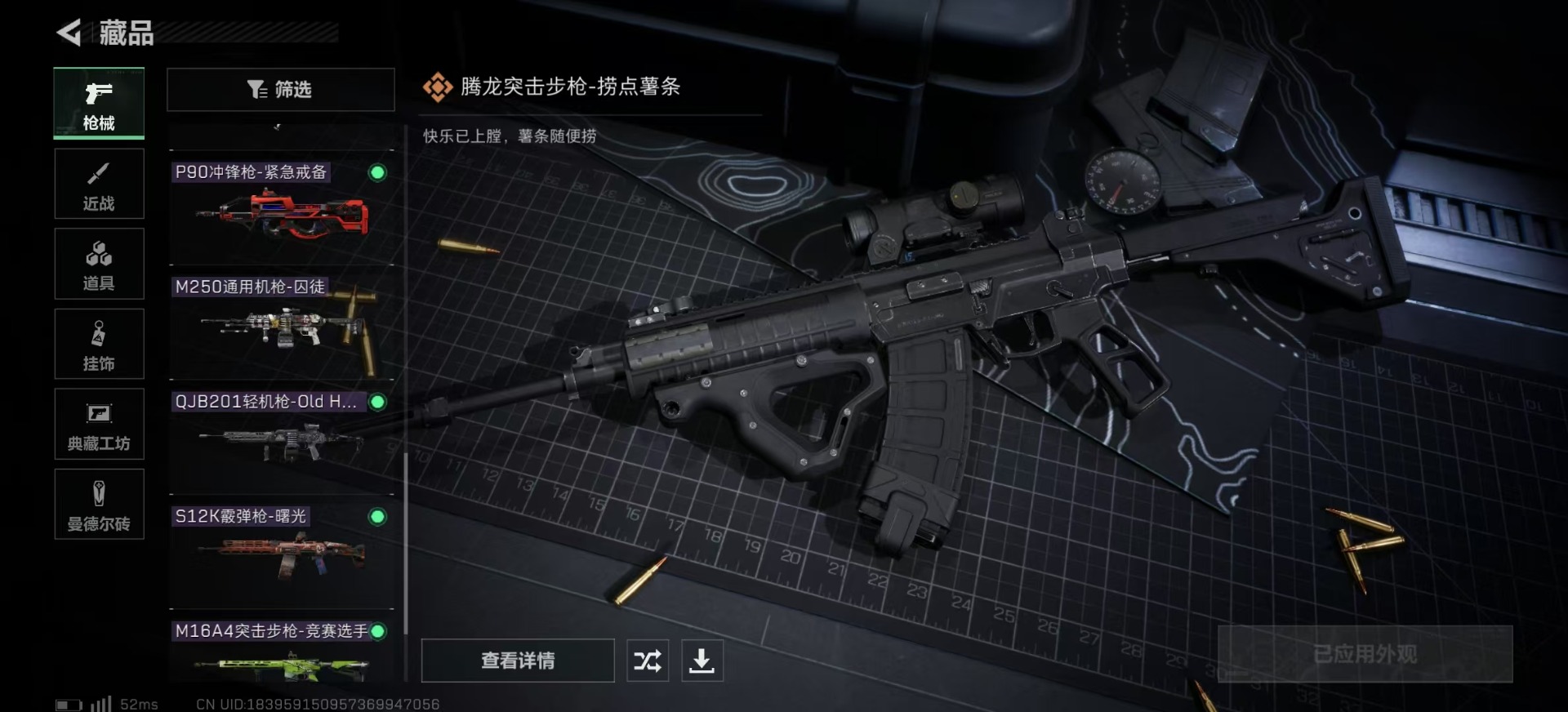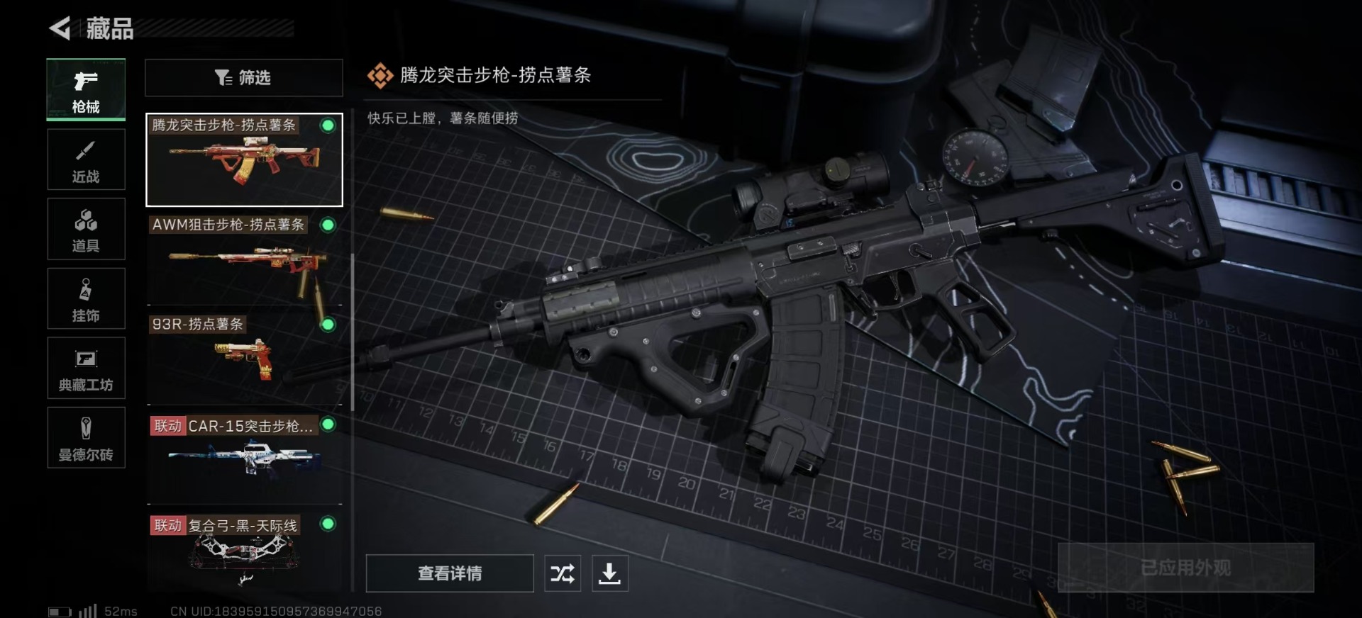 - [11625870]1干员外观 1近战传说 9传说枪械 高级安全箱(2×3)9.15号到期 可二次 安全保护中 可修改实名 烽火地带段位:无段位 全面战场段位:军士长 哈夫币:606.276 传说武器皮肤:近战-黑海,SR-25射手步枪-水墨云图,SCAR-H战斗步枪-铁艺苍穹,AK-12突击步枪-夜鹰,SMG45冲锋枪-骑士,QJB201轻机枪-黑海,MP5冲锋枪-黑海,复合弓-黑-天际线,725双管霰弹枪-送葬人-无题密令 干员外观:露娜-黑·天际线